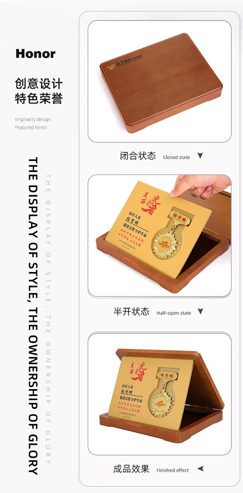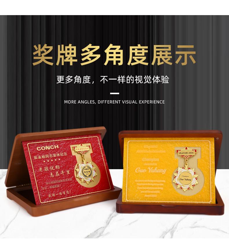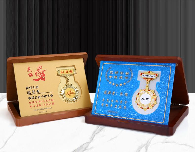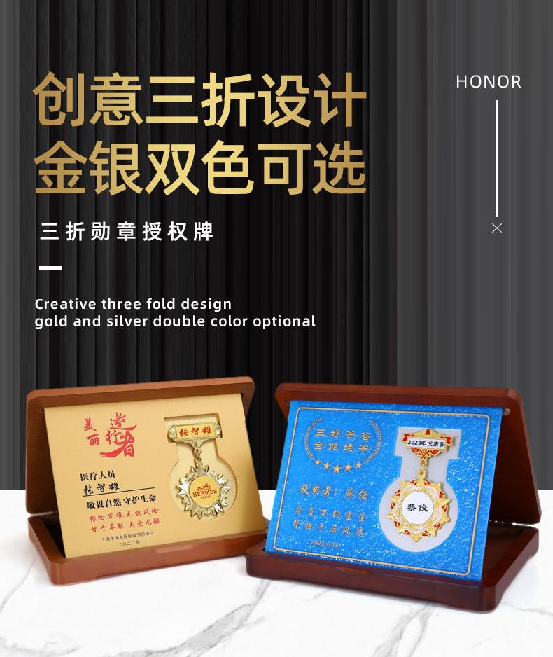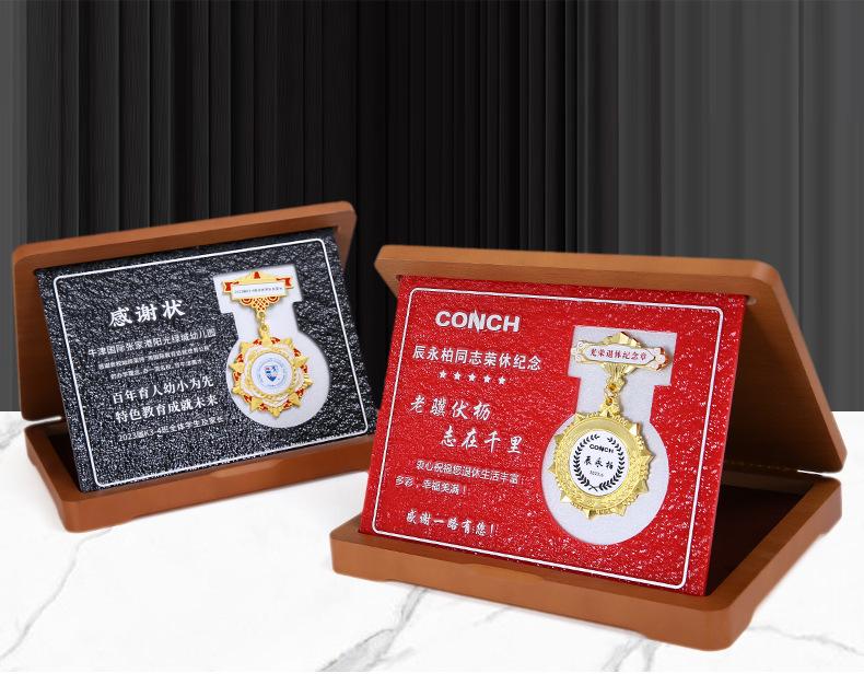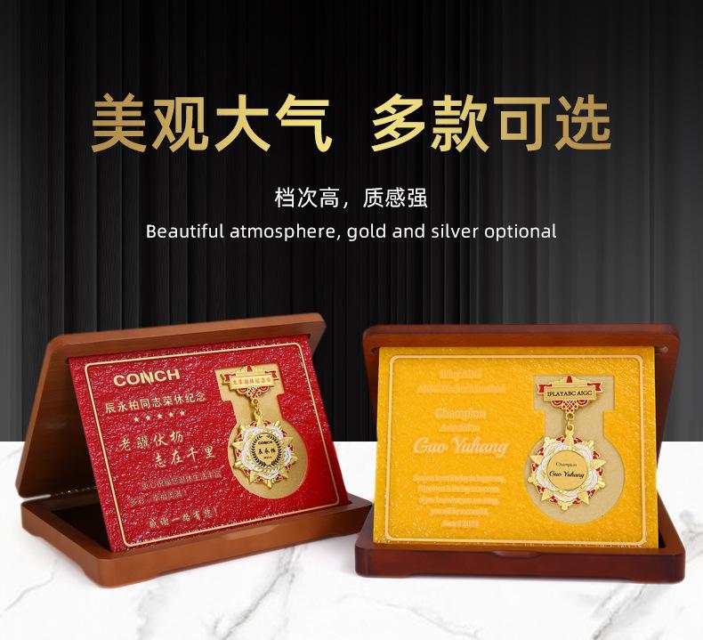 Tarjeta de autorización de medalla tríptica medalla bandeja de madera medalla conmemorativa decoración gloriosa de jubilación excelente personal de la empresa Medalla de agradecimiento