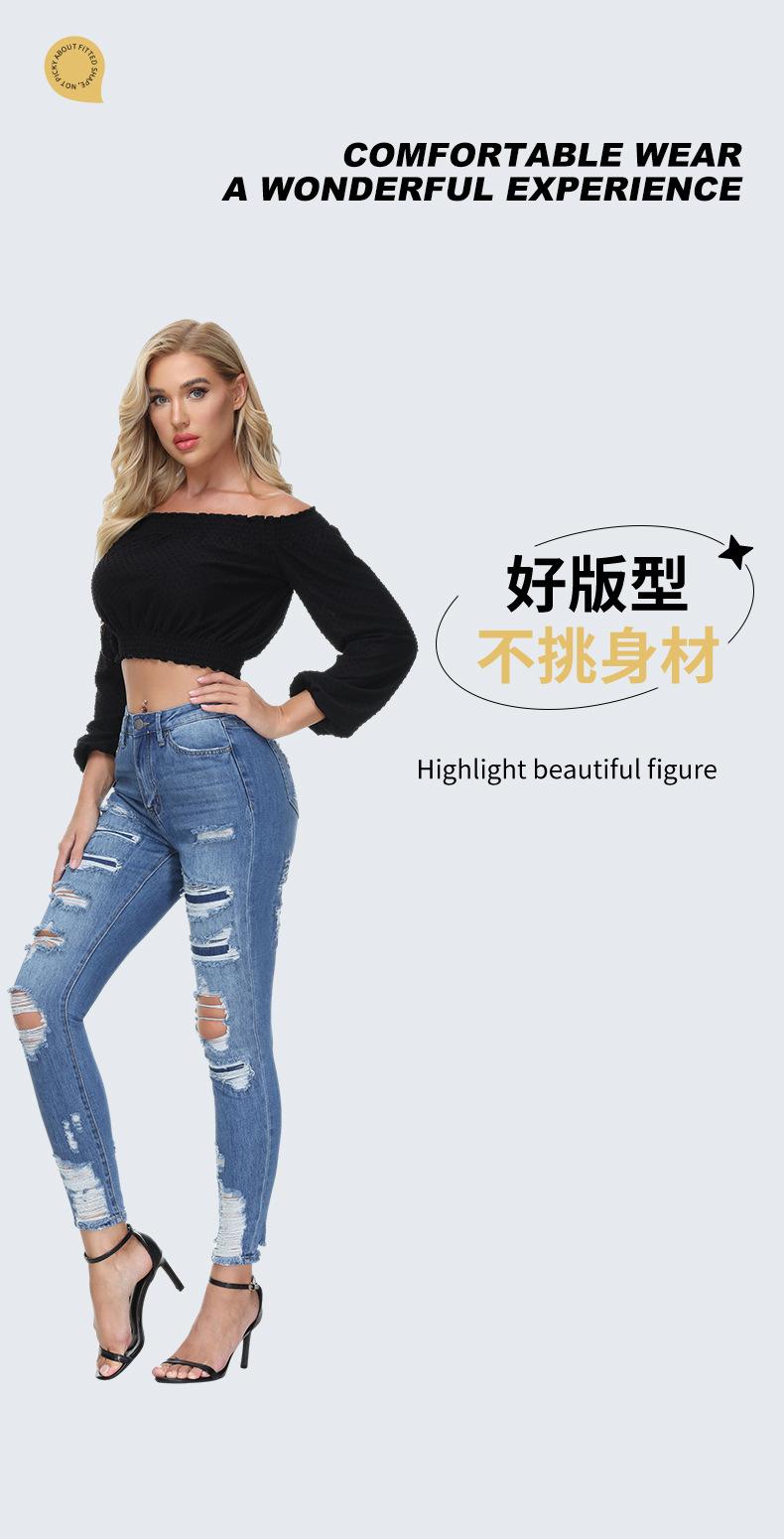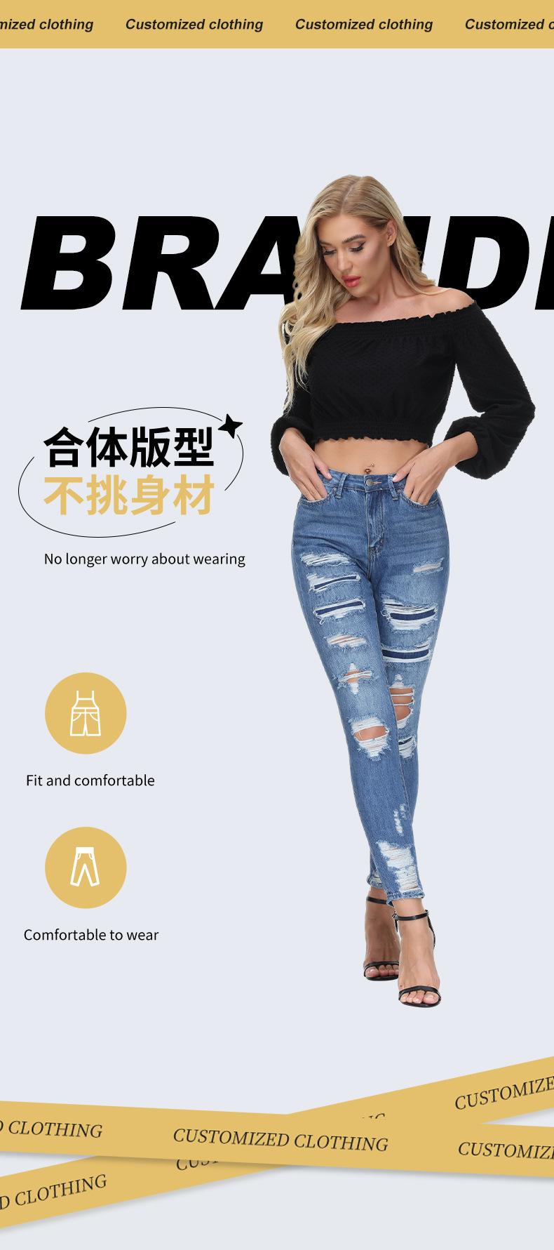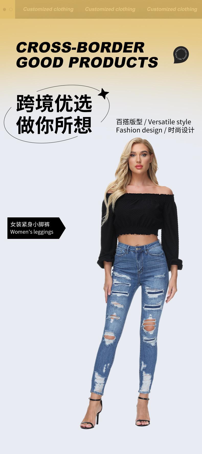 Jeans ajustados de estilo europeo y americano, personalizados, con agujeros y pernera estrecha, estilo de exportación procesado, para mujer.