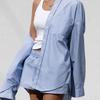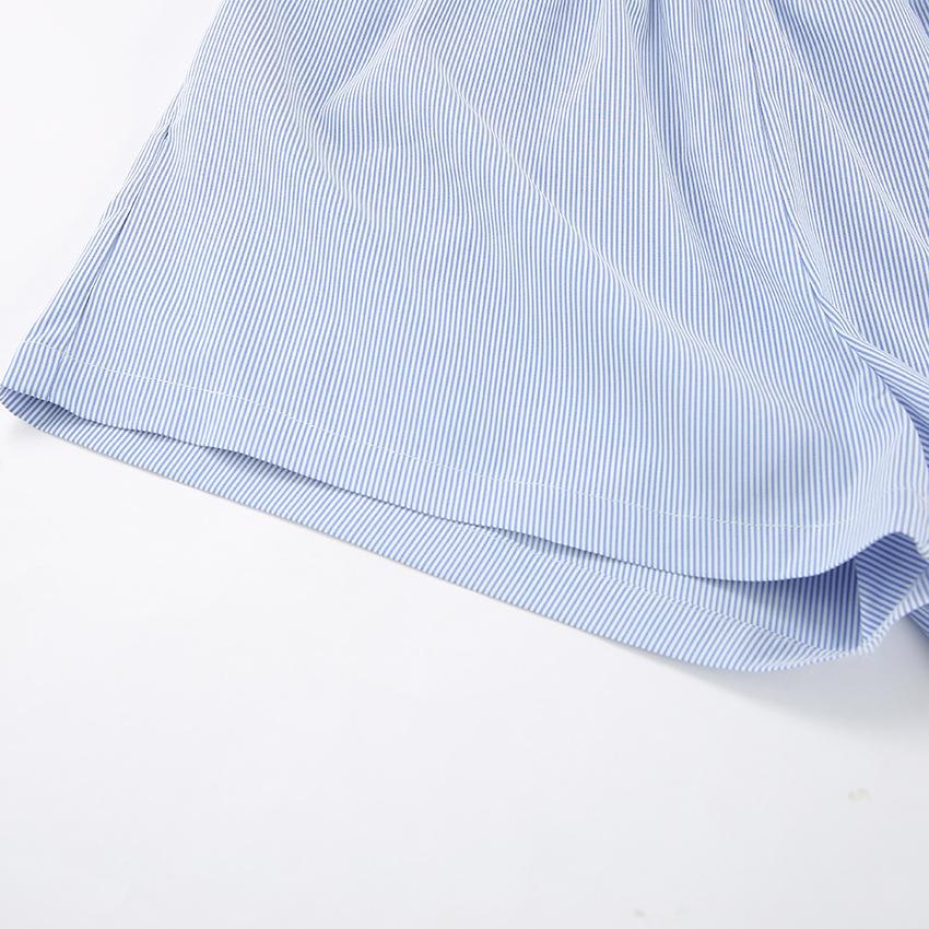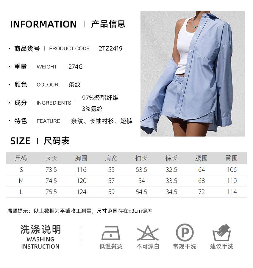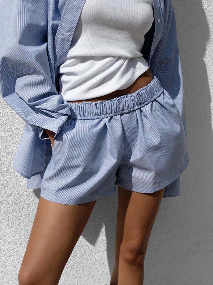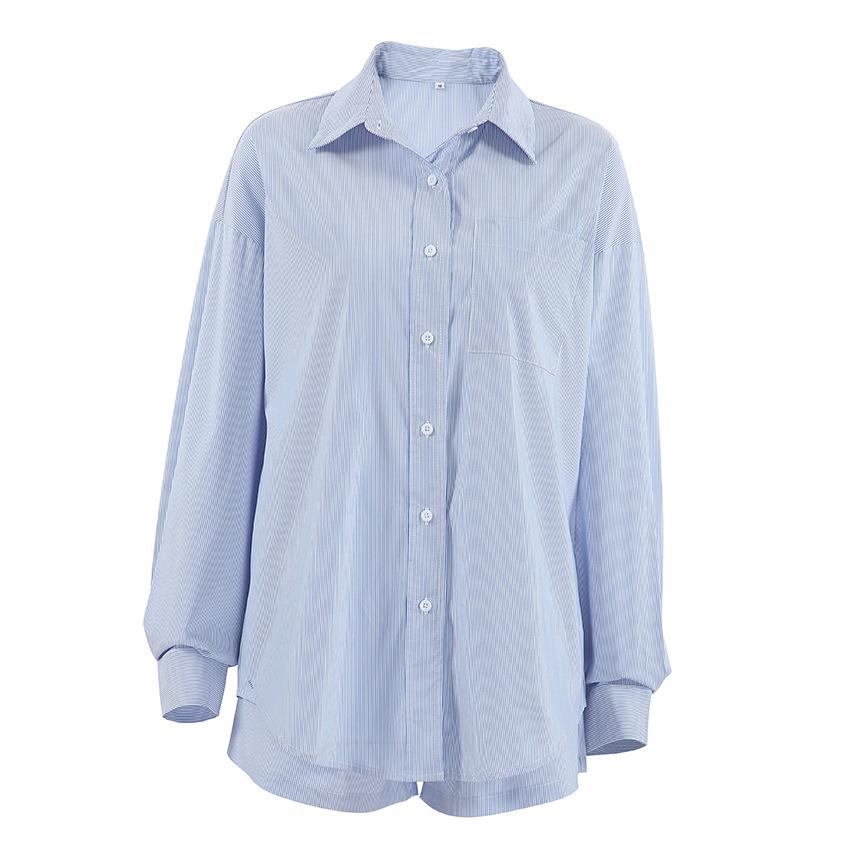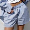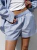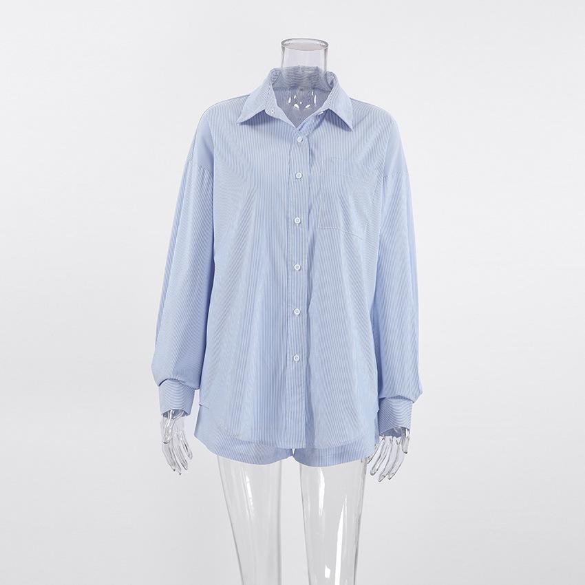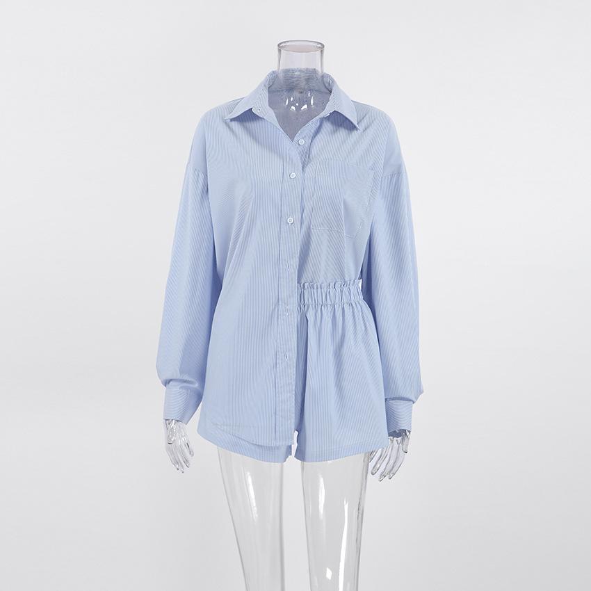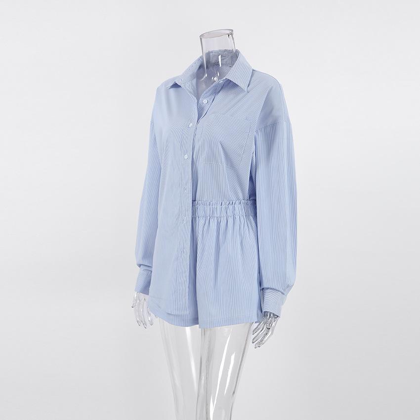 Conjunto de camisa de manga larga a rayas azules con pantalones cortos de cintura elástica, moda casual, estilo europeo y americano, otoño nuevo 2023 transfronterizo
