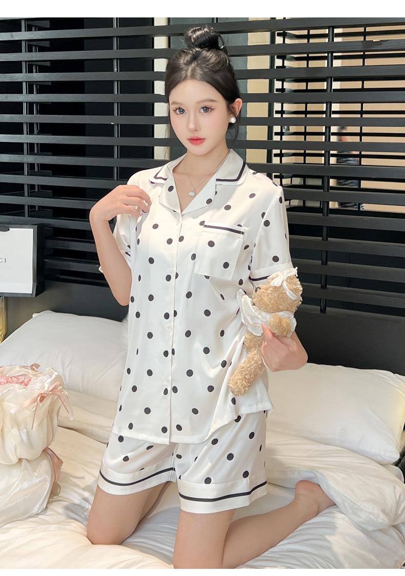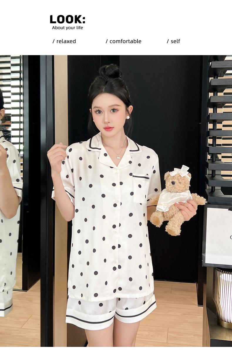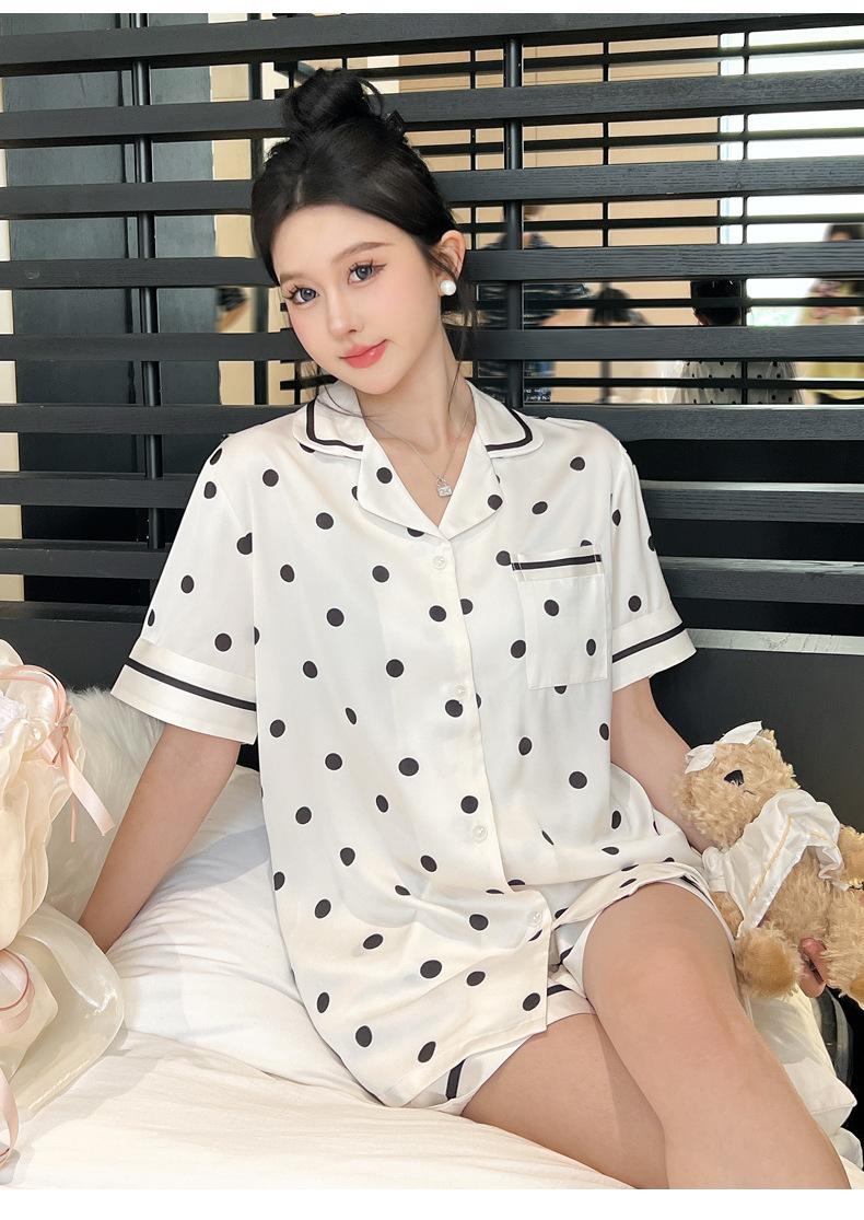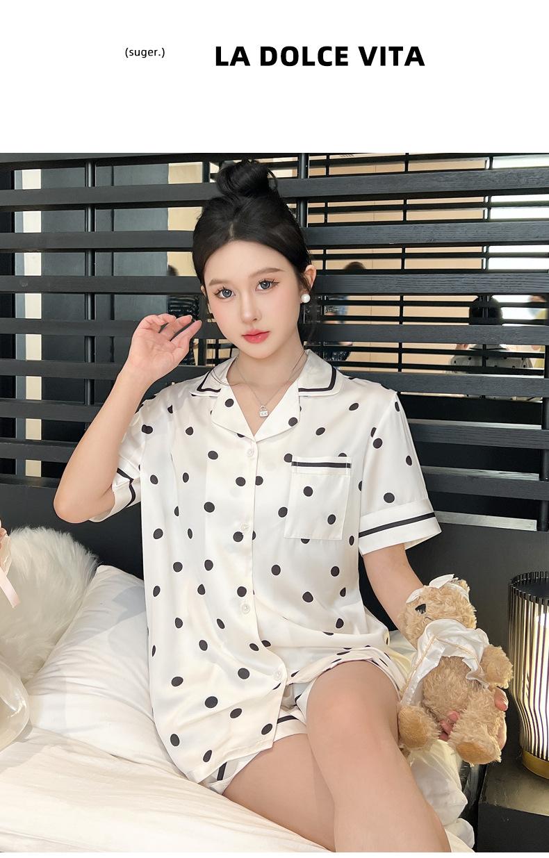 Pijamas de estilo coreano para mujer, primavera y verano, seda de hielo, pantalones cortos de manga corta con lunares ondulados, ropa informal sencilla para estudiantes, conjunto de ropa para el hogar de talla grande en vivo