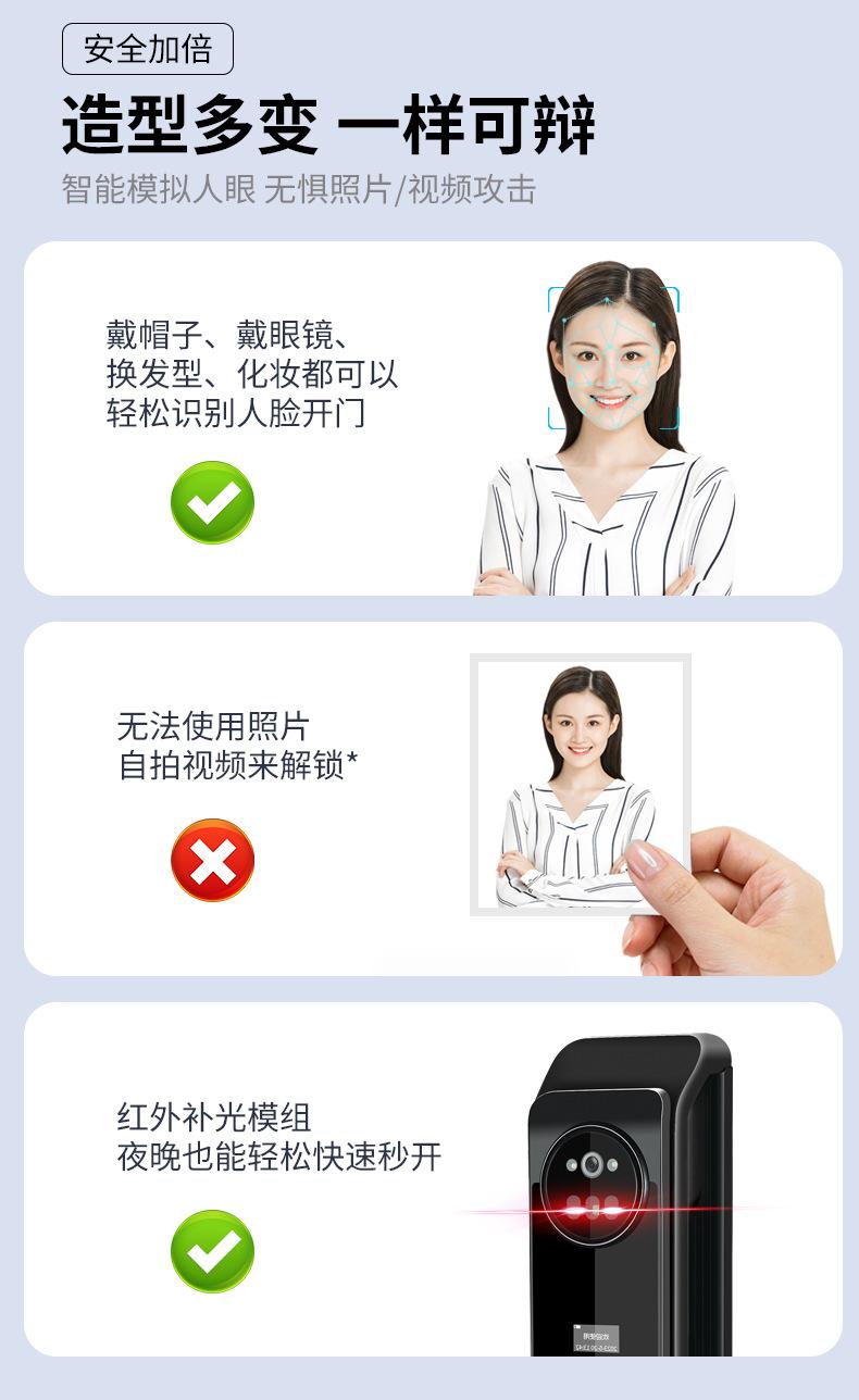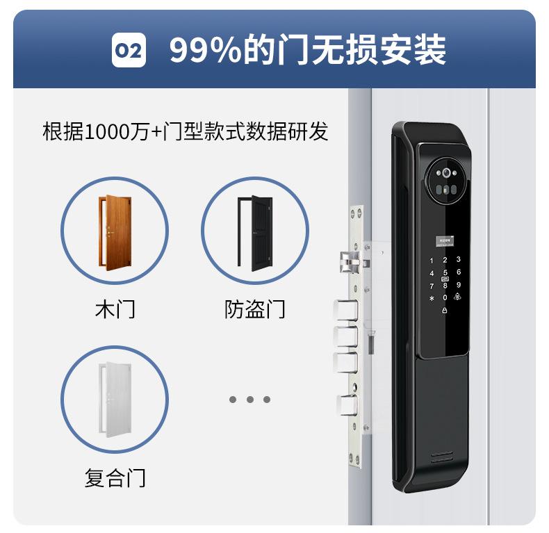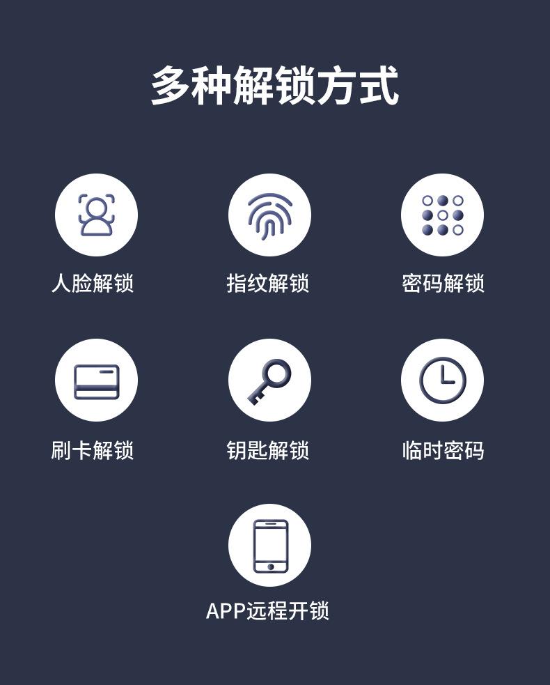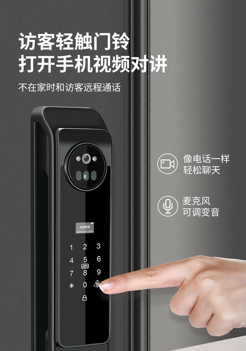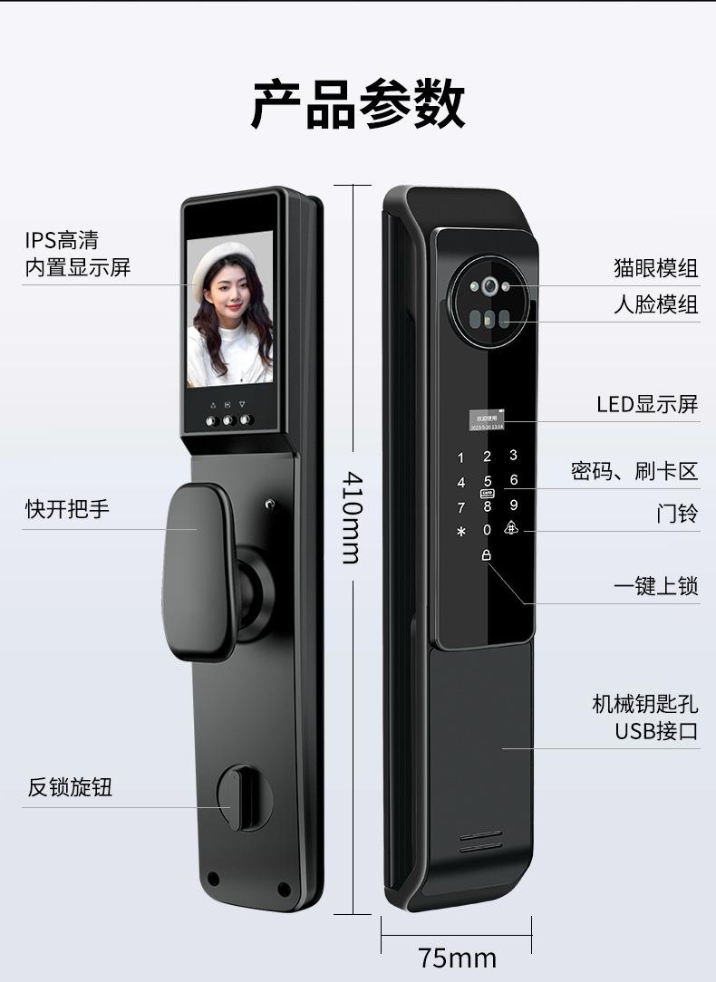 Fingerprint, Password, Bring key, Visible cat eye, Face recognition, No need to drill holes, Remote unlock