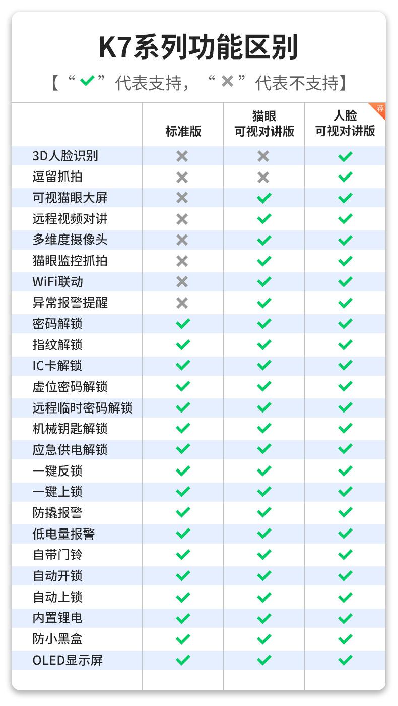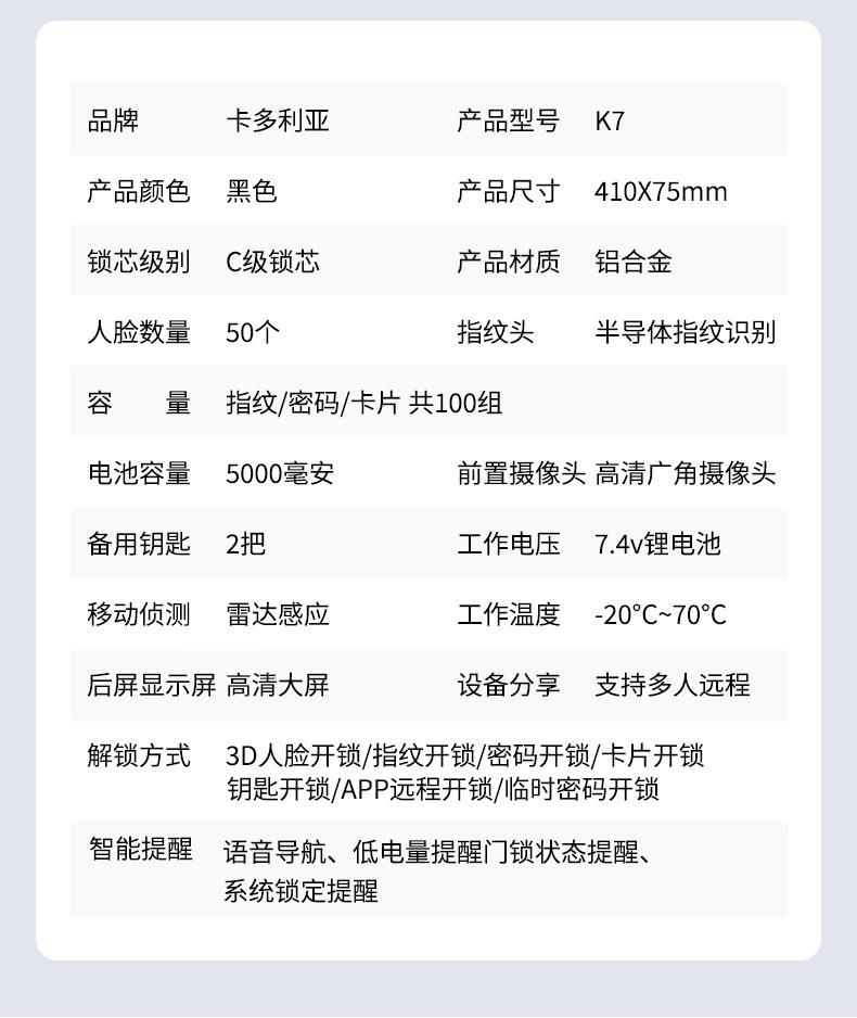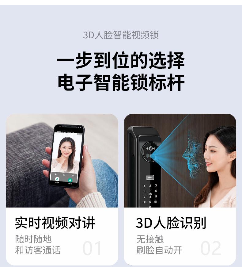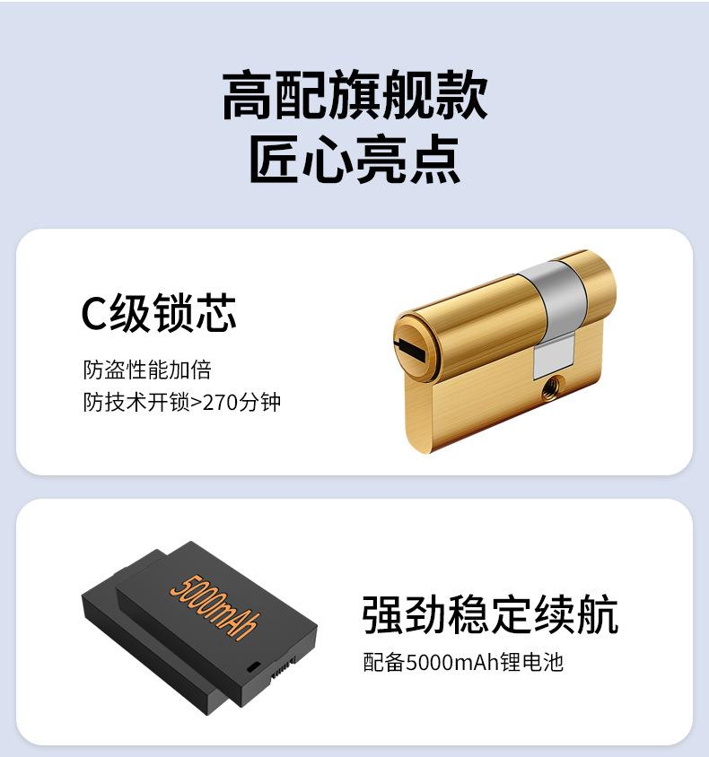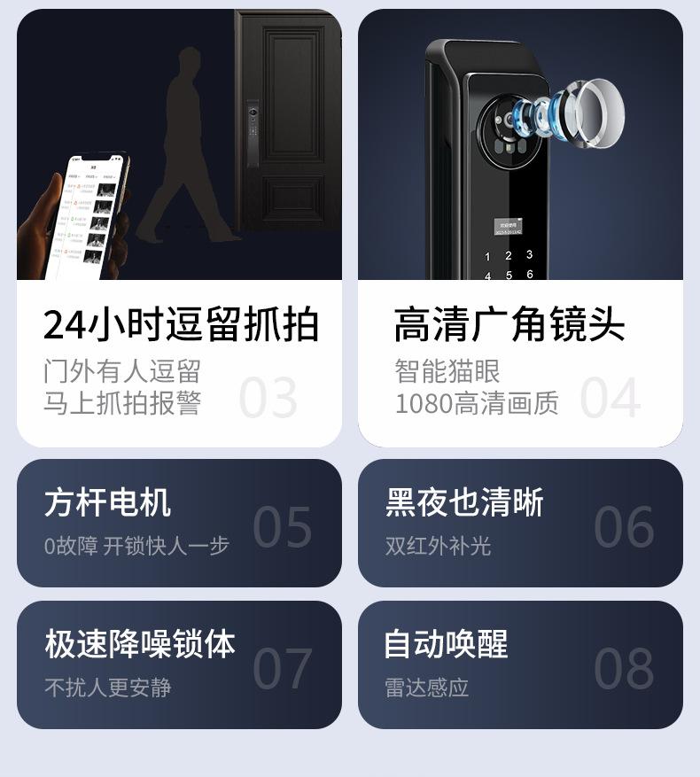Fingerprint, Password, Bring key, Visible cat eye, Face recognition, No need to drill holes, Remote unlock