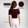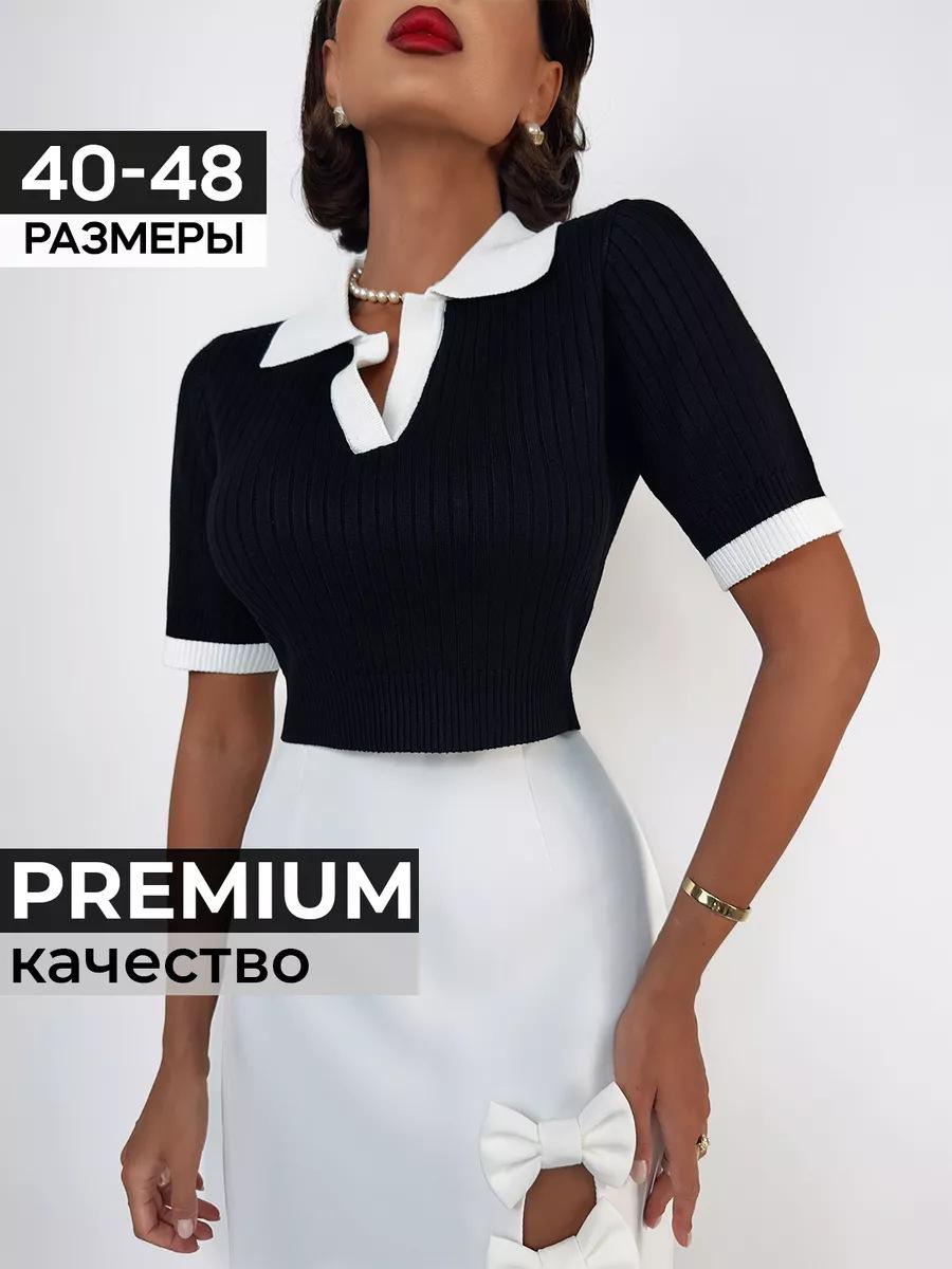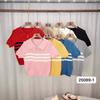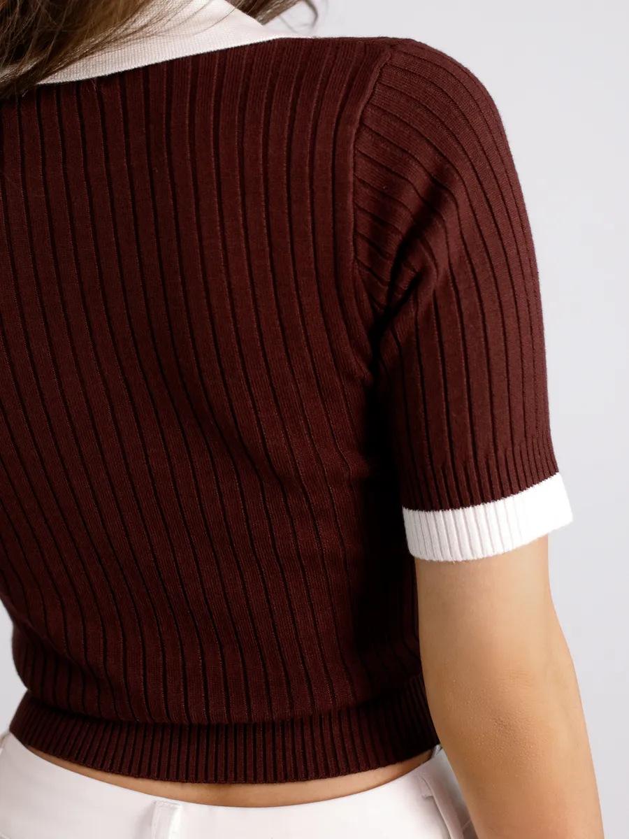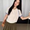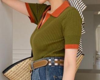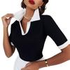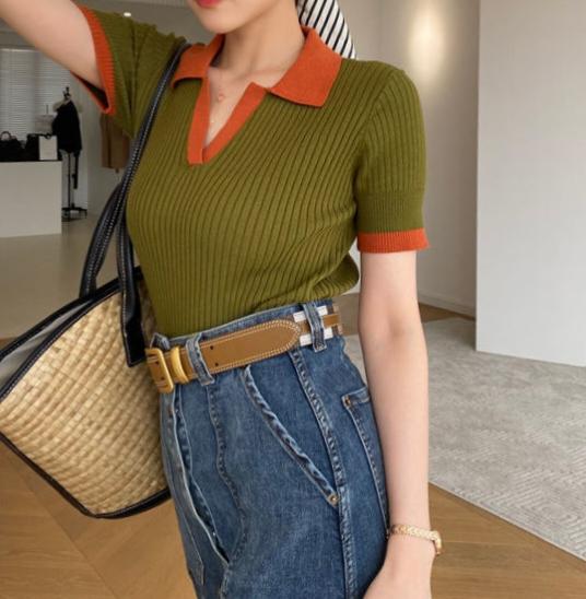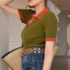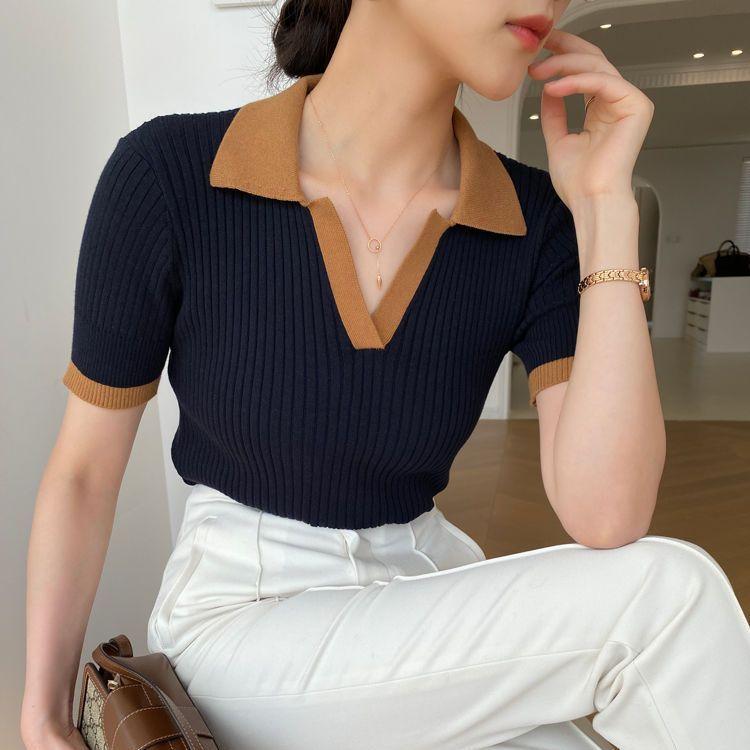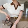 Suéter de punto elástico con cuello polo de color coreano de verano, elegante y a la moda, de manga corta para mujer.