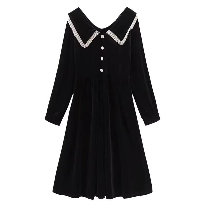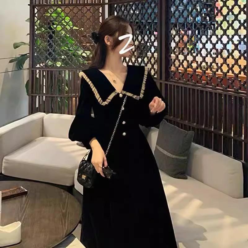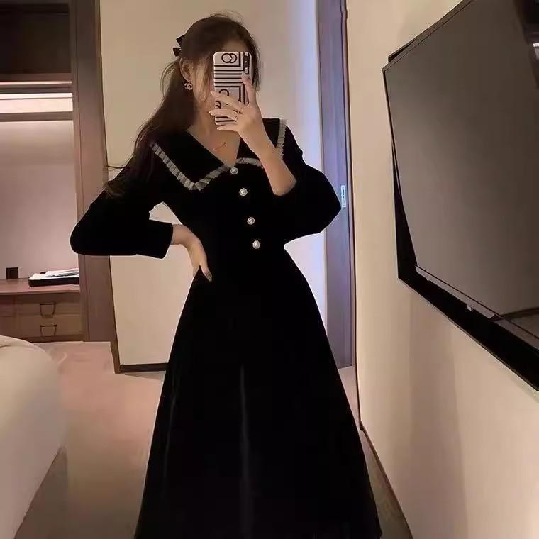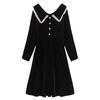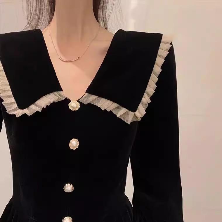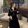 Estación europea Otoño Nuevo Estilo Francés retro negro vestido de cintura estilo Hepburn cuello de muñeca vestido de terciopelo dorado mujeres