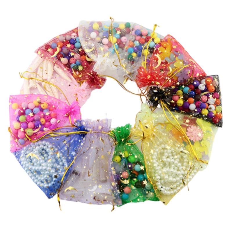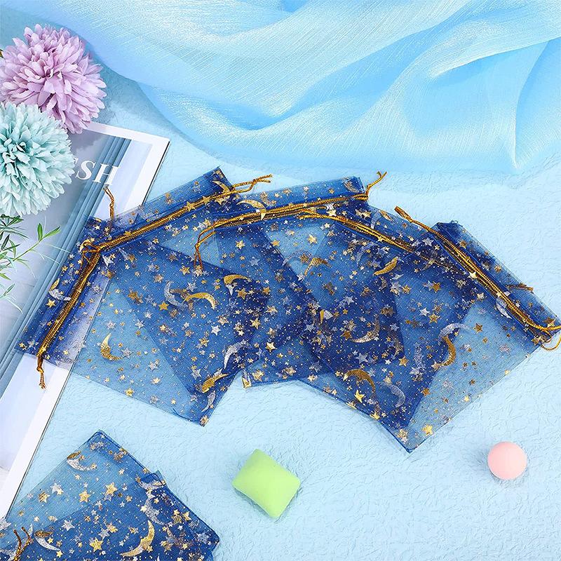 Bolsa de organza con estampado bronceado para embalaje de joyas, almacenamiento de joyas, cordón ajustable, caja de regalo, bolsa de hilo, patrón de estrella y luna, en stock, venta al por mayor