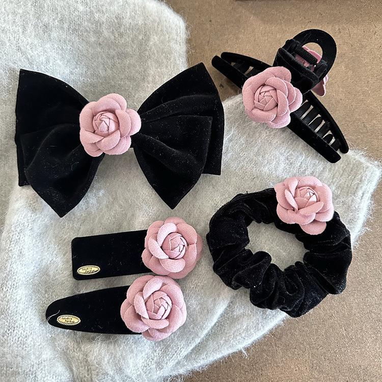 Horquilla con lazo de camelia rosa francesa, accesorio para el cabello, nicho femenino, pinza para el cabello con cuerda de temperamento de alto grado