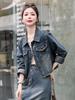 Chamarra de mezclilla negra lavada clásica para mujer, corte ajustado, estilo corto, diseño de hombro caído para otoño e invierno, moda femenina moderna y versátil