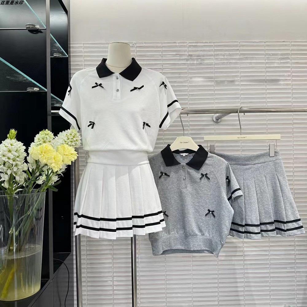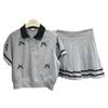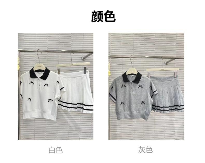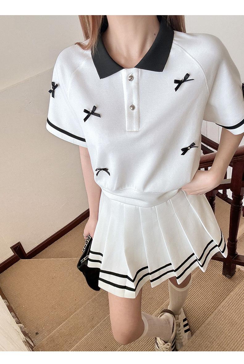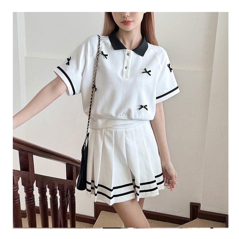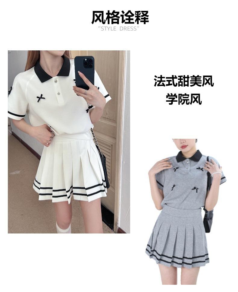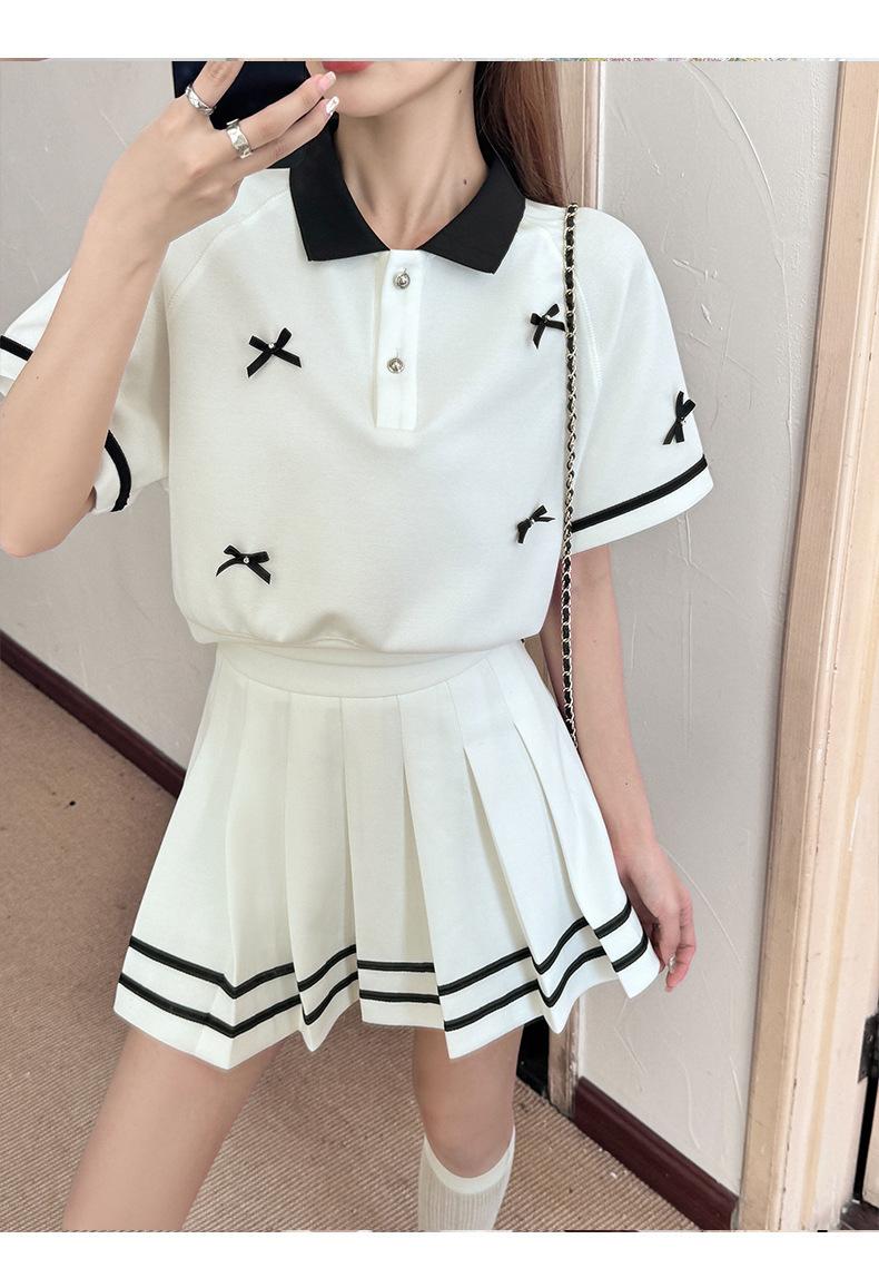 Conjunto de dos piezas de traje de punto para mujer, camiseta de manga corta con lazo tridimensional en contraste de color, falda plisada de cintura alta y pantalones cortos de verano