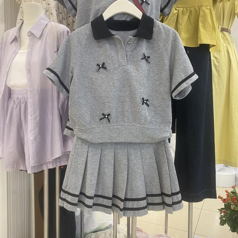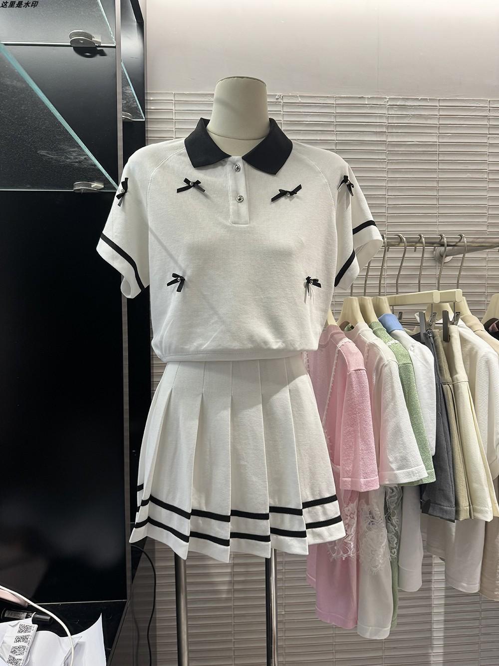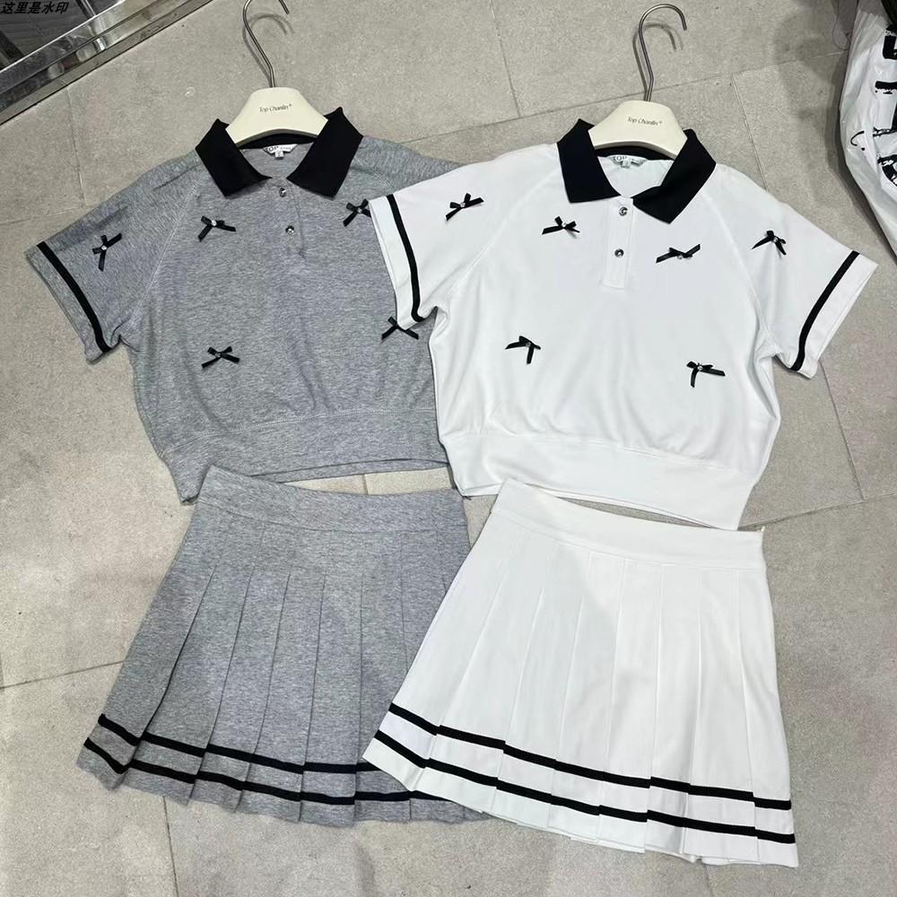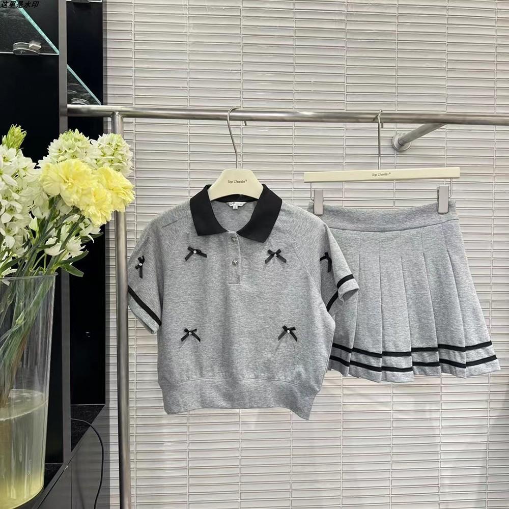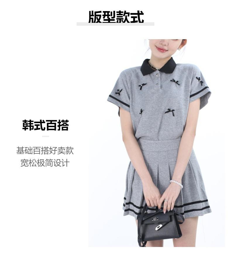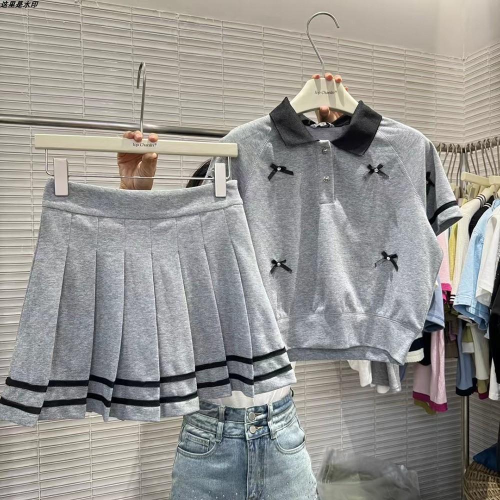 Conjunto de dos piezas de traje de punto para mujer, camiseta de manga corta con lazo tridimensional en contraste de color, falda plisada de cintura alta y pantalones cortos de verano