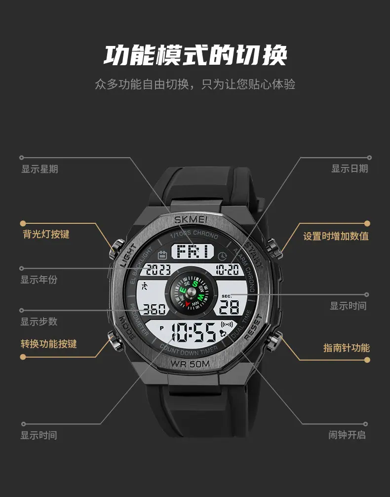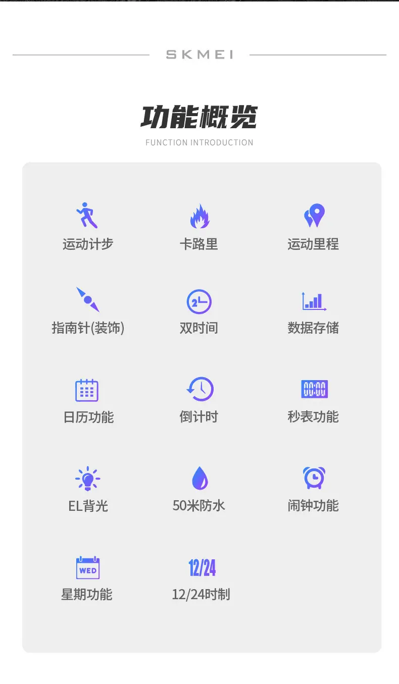 Sports mileage, 2 time, stopwatch timing, date, timer alarm, week, el luminous, hourly time, 12/24 hour system, countdown.