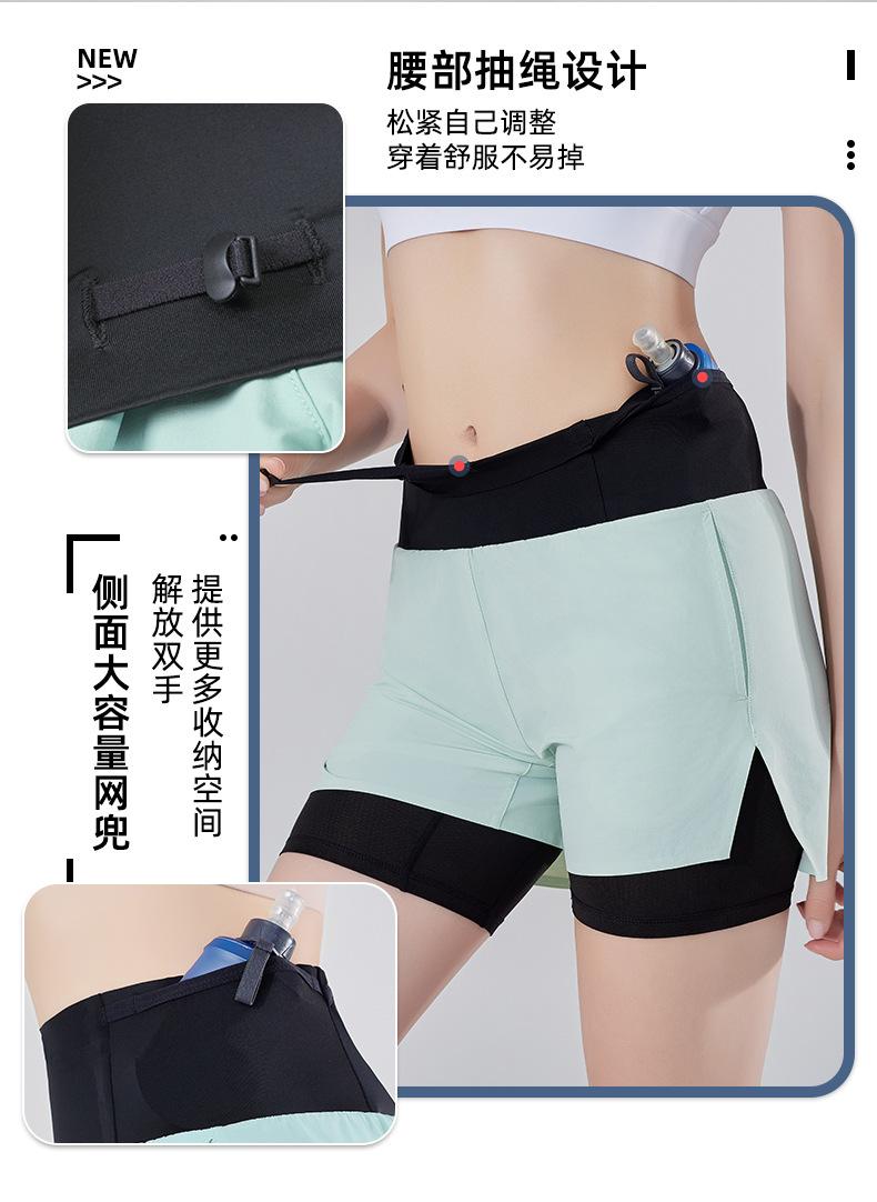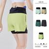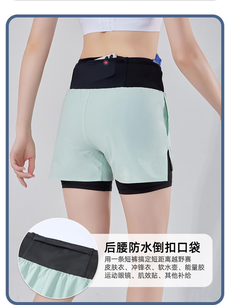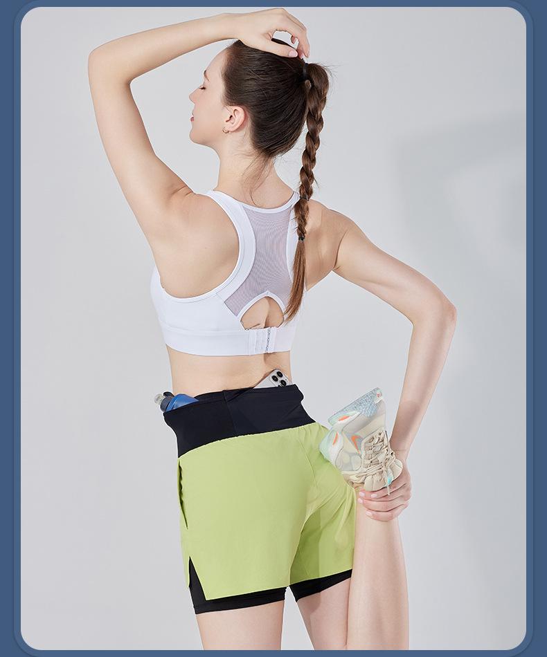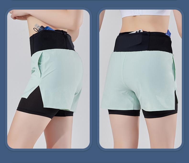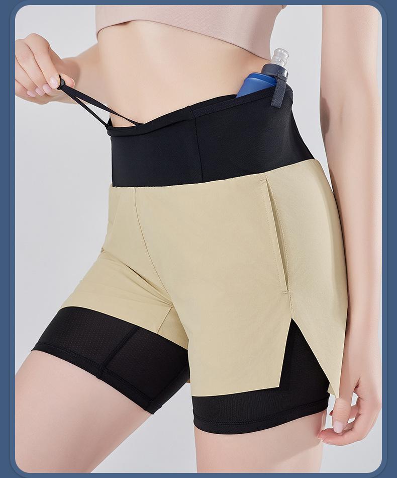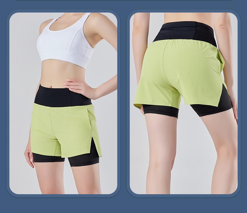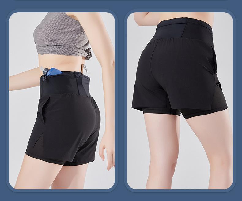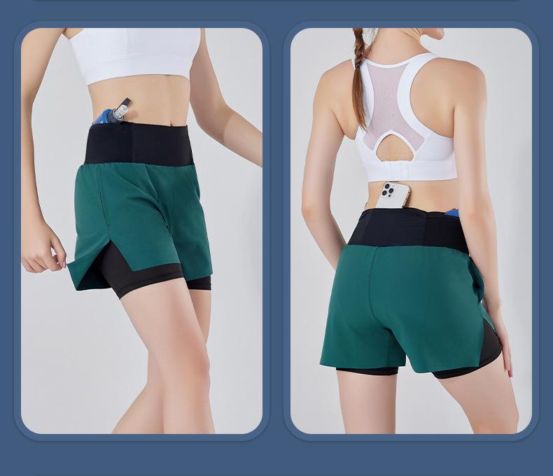 Pantalones cortos de yoga falsos de dos piezas, tres piezas, para correr, para mujer, con bolsillo en la parte trasera y forro anti-carrera, para maratón
