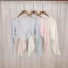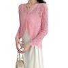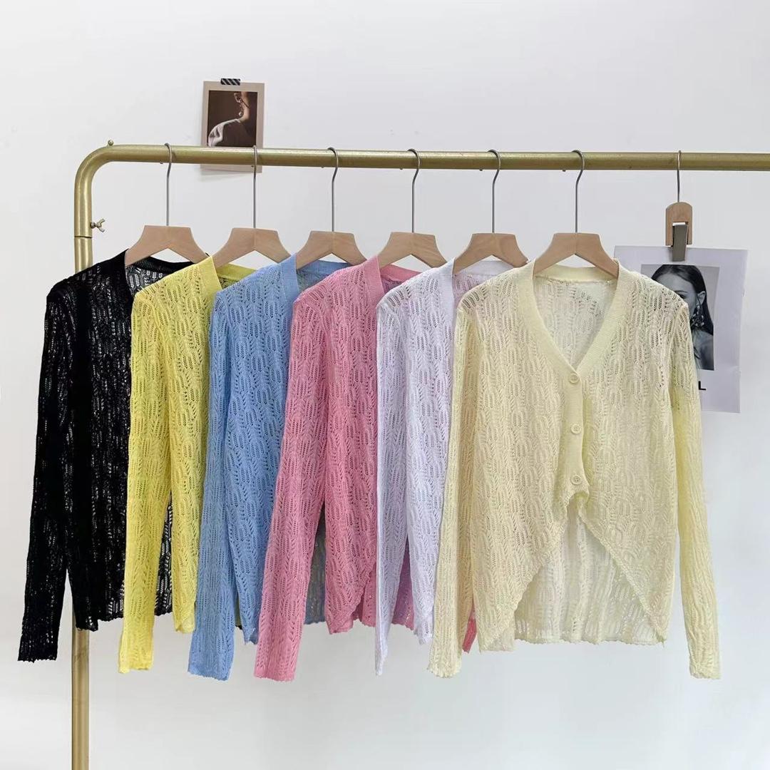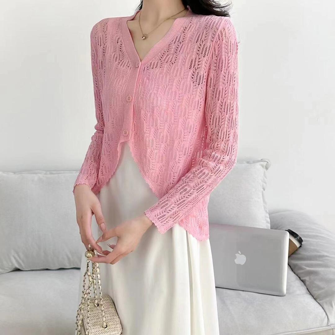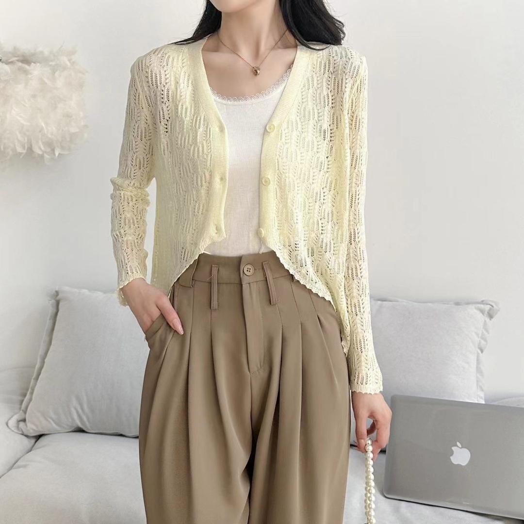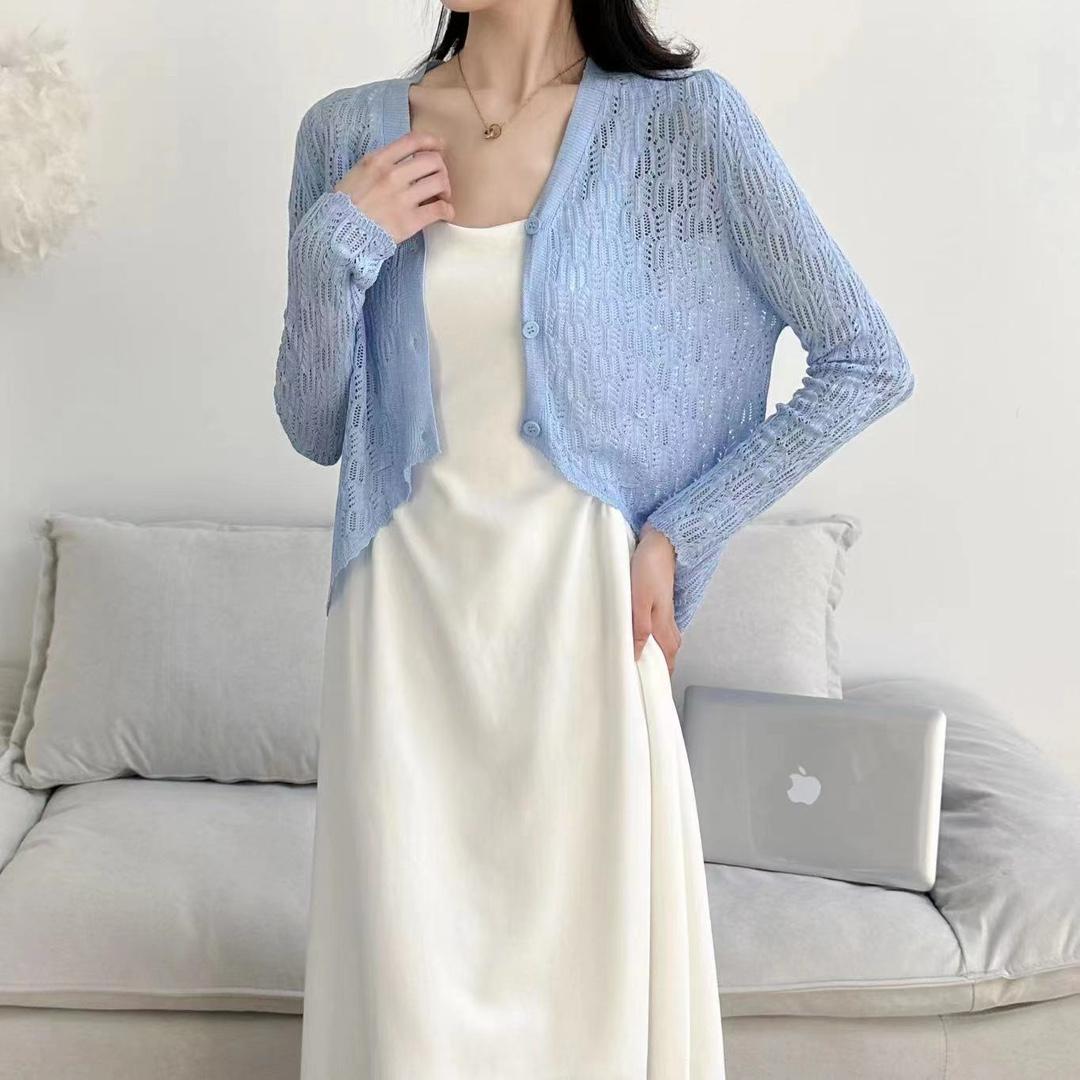 Abrigo estilo chal retro francés para mujer, nuevo diseño hueco, suéter de punto, blusa exterior con protección solar, tela fina