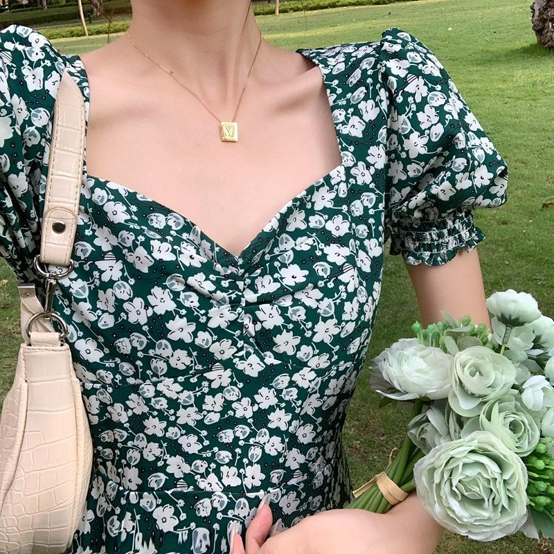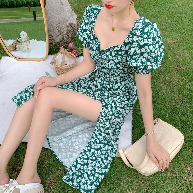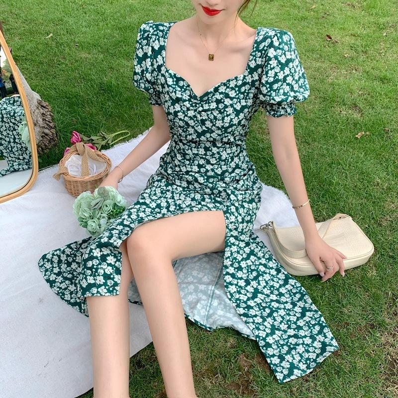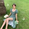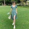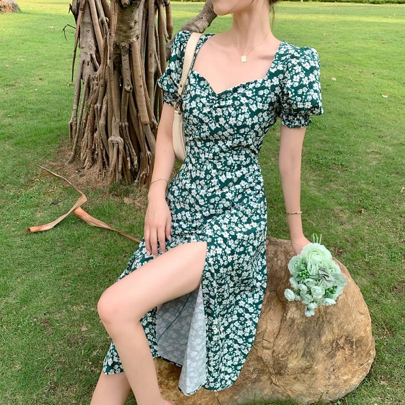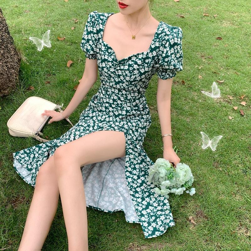 Vestido largo estilo Hepburn con cuello cuadrado francés, estampado floral, mangas abullonadas verdes, vestido dividido para niños, verano 2024, fresco