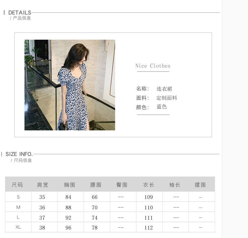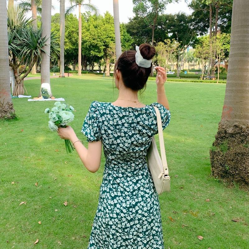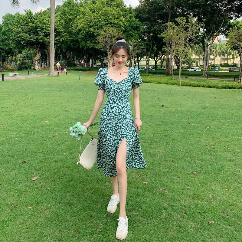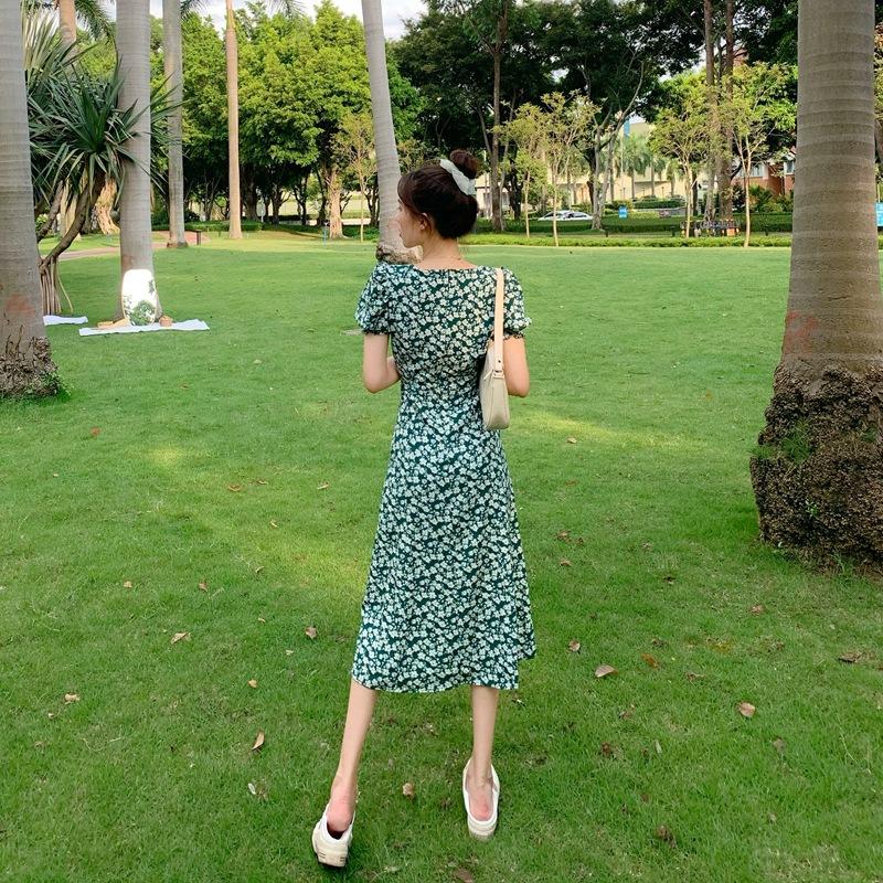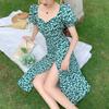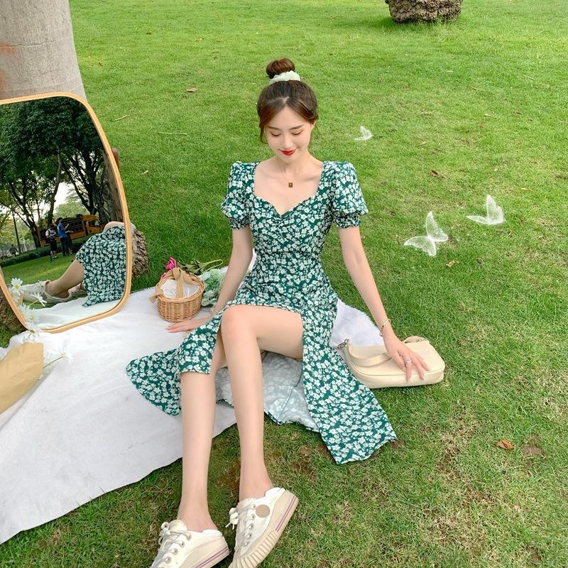 Vestido largo estilo Hepburn con cuello cuadrado francés, estampado floral, mangas abullonadas verdes, vestido dividido para niños, verano 2024, fresco