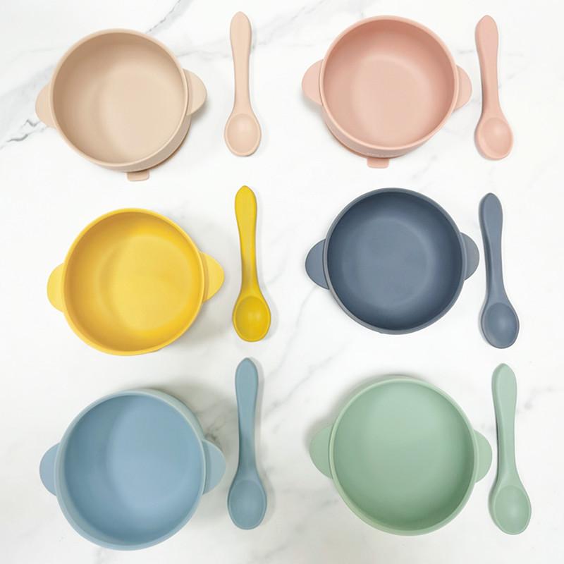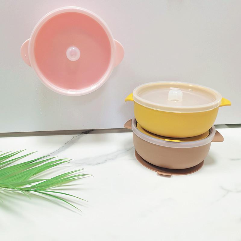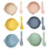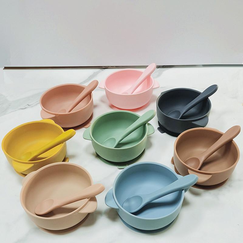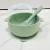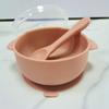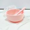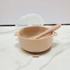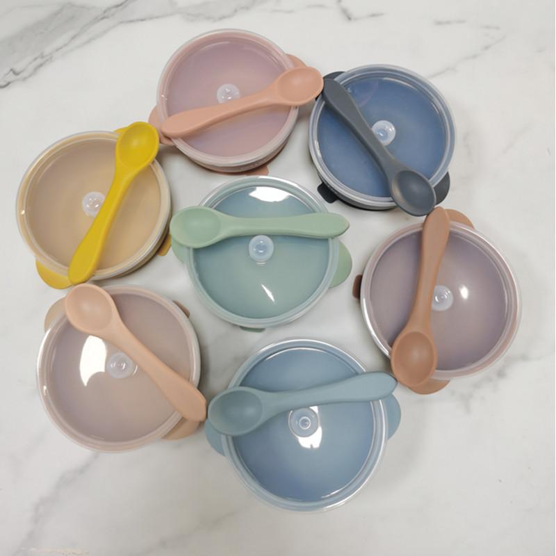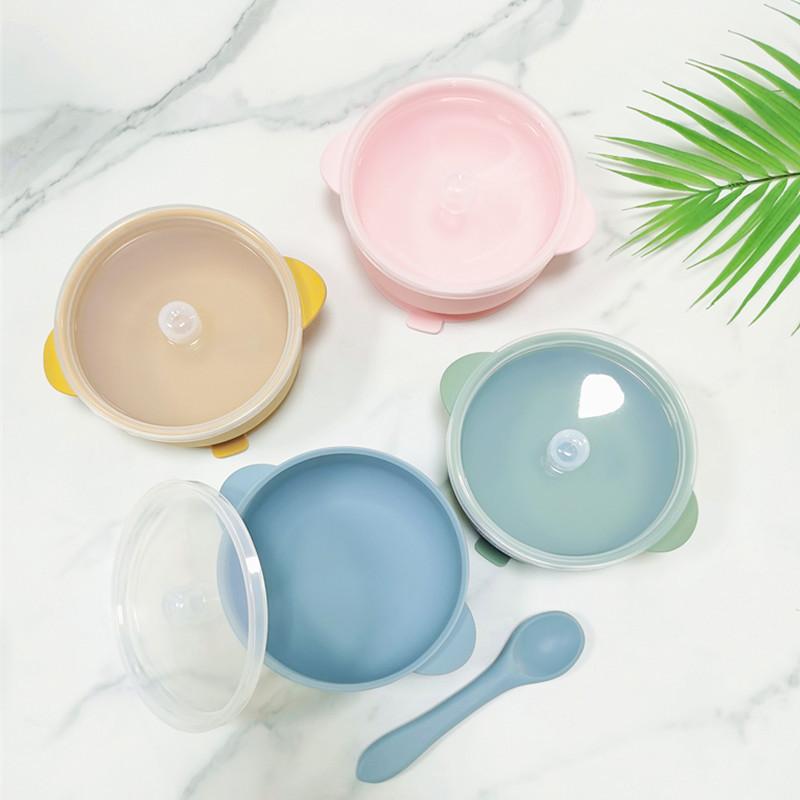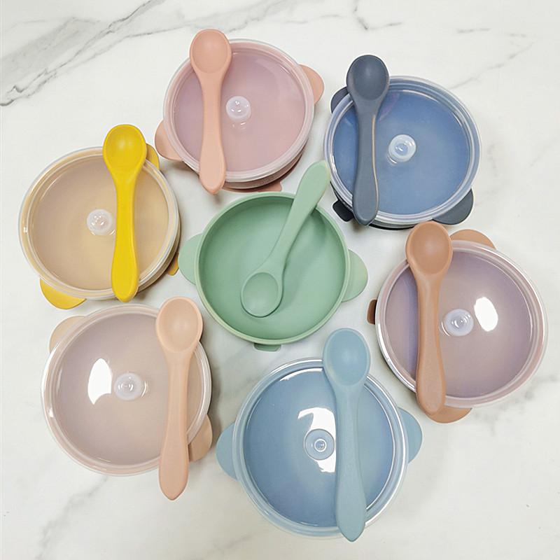 Nuevo tazón con tapa de silicona y cuchara de silicona, vajilla de alimentación complementaria para niños, tazón de comedor aislante con ventosa de silicona