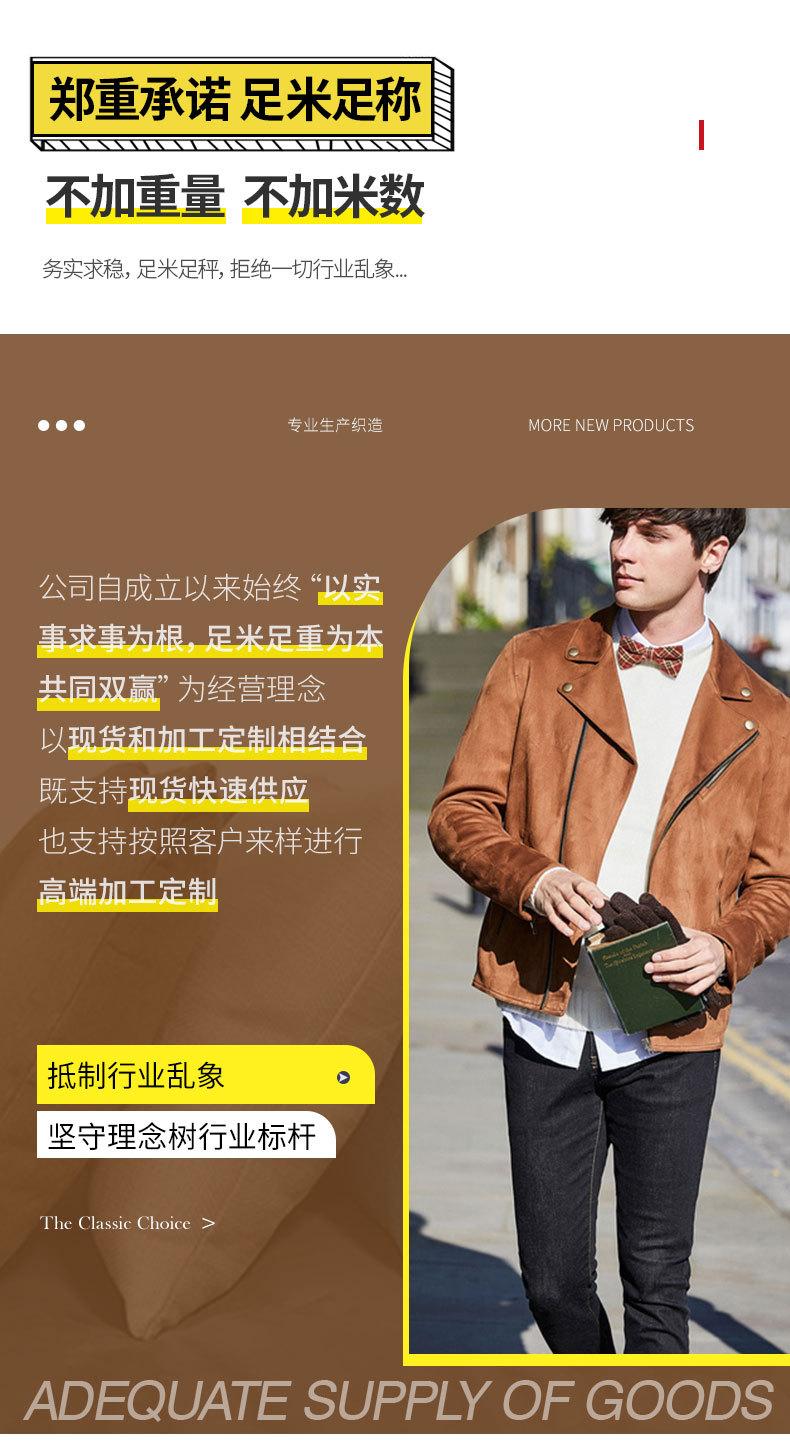 La empresa tiene varias especificaciones de tejido de urdimbre, tejido de trama, tejido de punto, elástico, gamuza no elástica (incluyendo piel de ciervo, cuero artificial, terciopelo de copo de nieve con capa de aire, terciopelo de fibra de ciervo, terciopelo tridimensional, microfibra de doble cara, terciopelo esmerilado, elástico en cuatro direcciones, terciopelo de visón, terciopelo de cuero real, terciopelo de piel de oveja, terciopelo rico, terciopelo dorado, terciopelo perla, terciopelo de tendón de oveja, gamuza encriptada tejida por urdimbre, pana tejida, raya de belleza, elástico en cuatro direcciones de sarga, capa de aire de sarga), gamuza tejida (incluyendo gamuza de urdimbre, gamuza de trama de satén encriptada de cinco piezas, elástico de cinco piezas, terciopelo Noka, gamuza elástica recta, terciopelo de lino, gamuza de trama de ocho piezas, gamuza de trama de seis piezas, etc.) y pana (pana de poliéster de punto de 2,5 tiras, de 4,5 tiras y de 6 tiras y poliéster brocado tejido de 2,5 tiras, de 4,5 tiras y de 8 tiras. Pana de 11 tiras, 16 tiras, así como rejilla de maíz y rejilla de melón, terciopelo holandés, terciopelo Lis, felpa corta súper suave, etc.