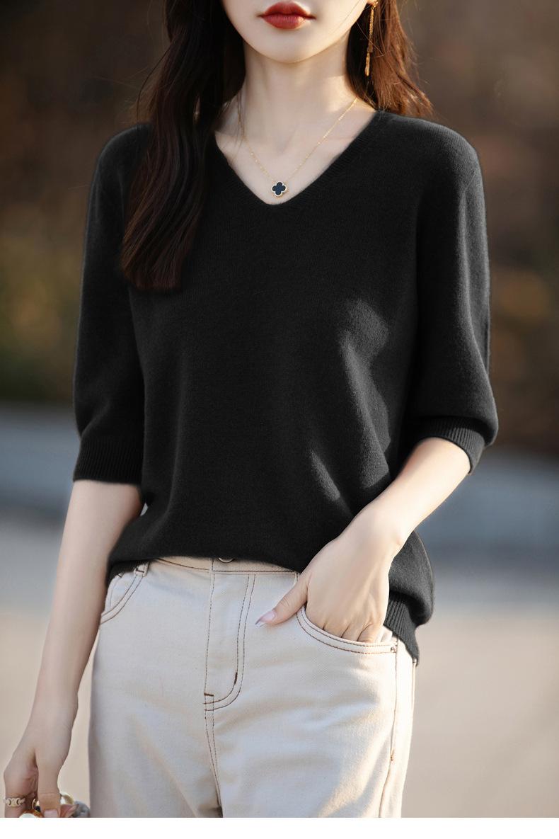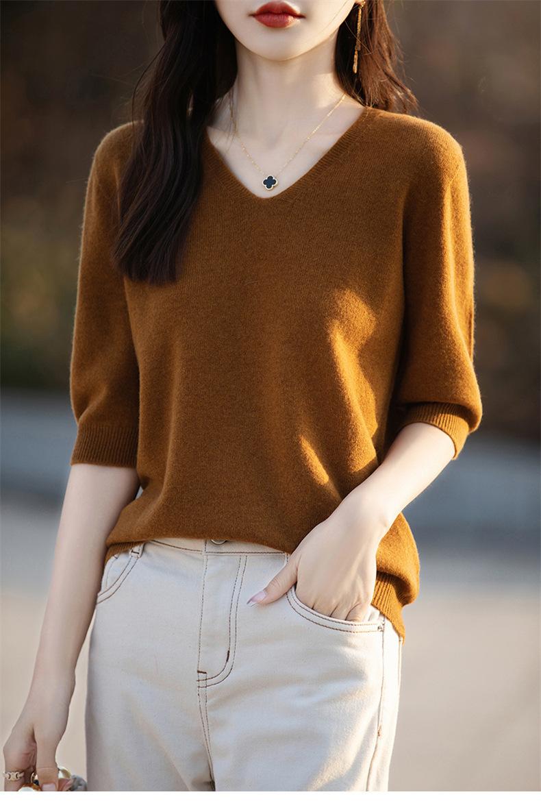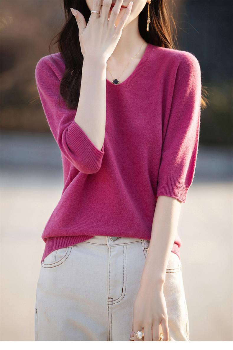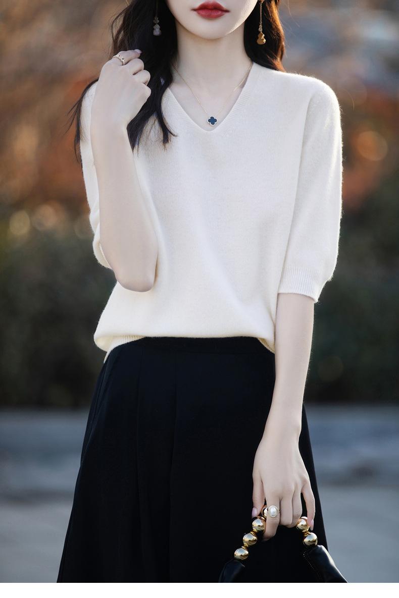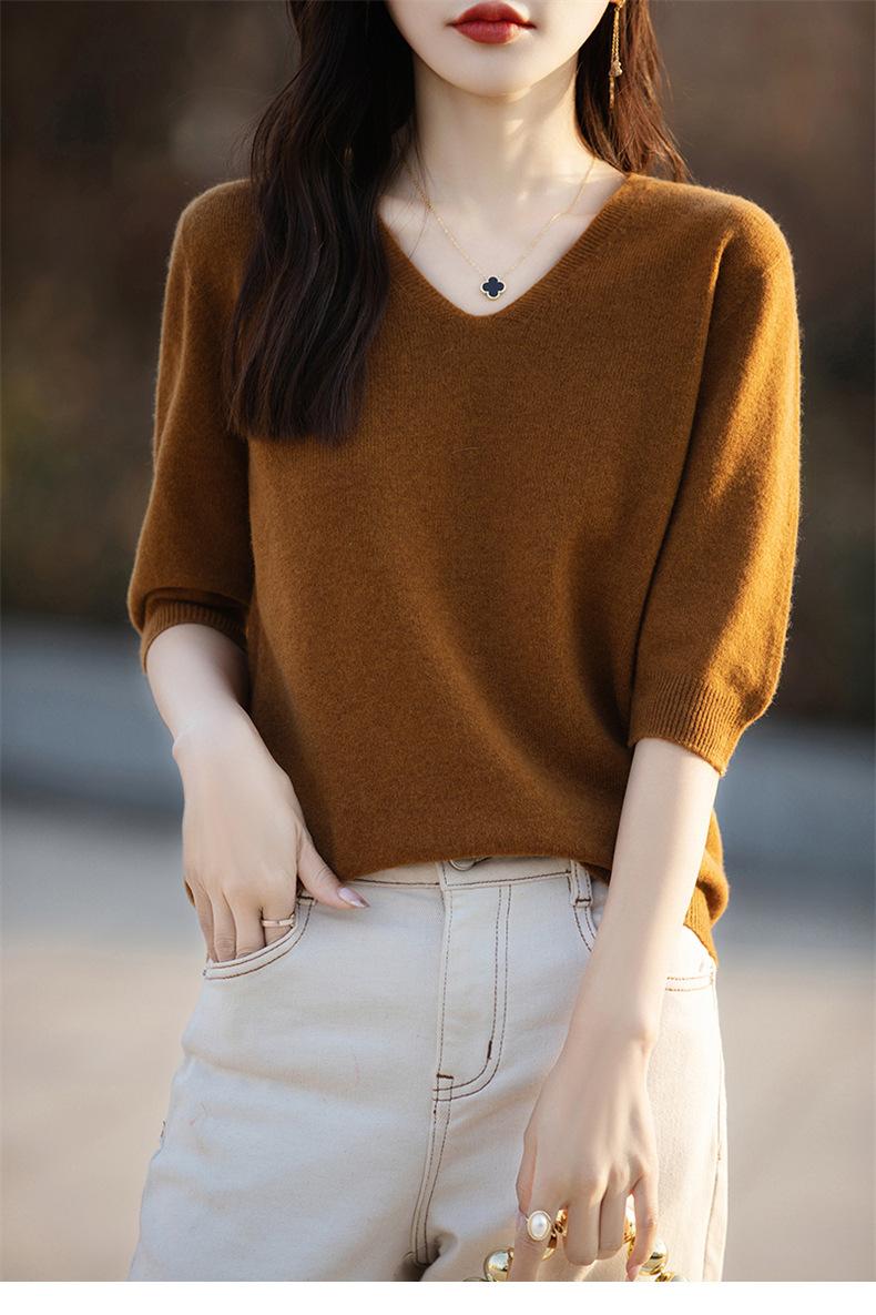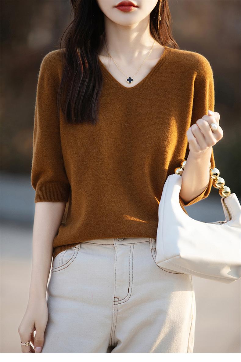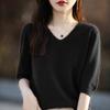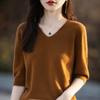 Compra Suéter de cuello en V manga corta para mujer color sólido manga media holgado jersey tejido camiseta base 25 primavera nueva línea ropa camiseta al por mayor en Joom.pro