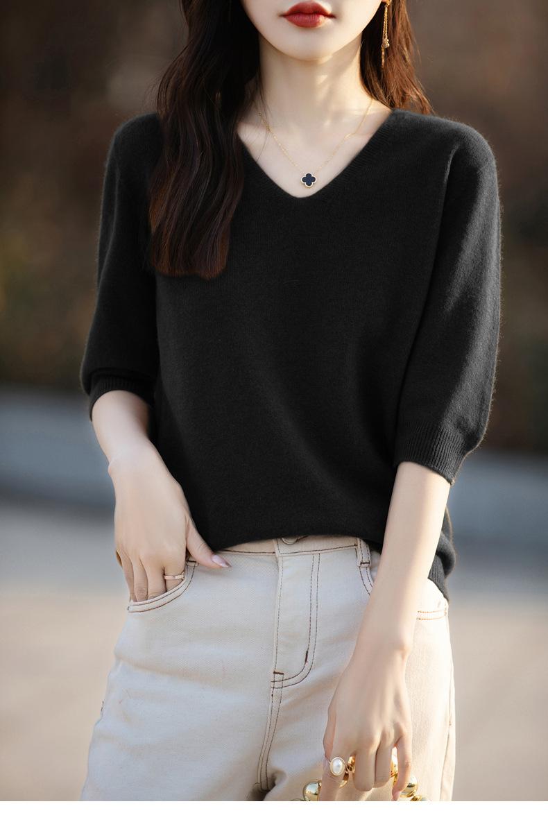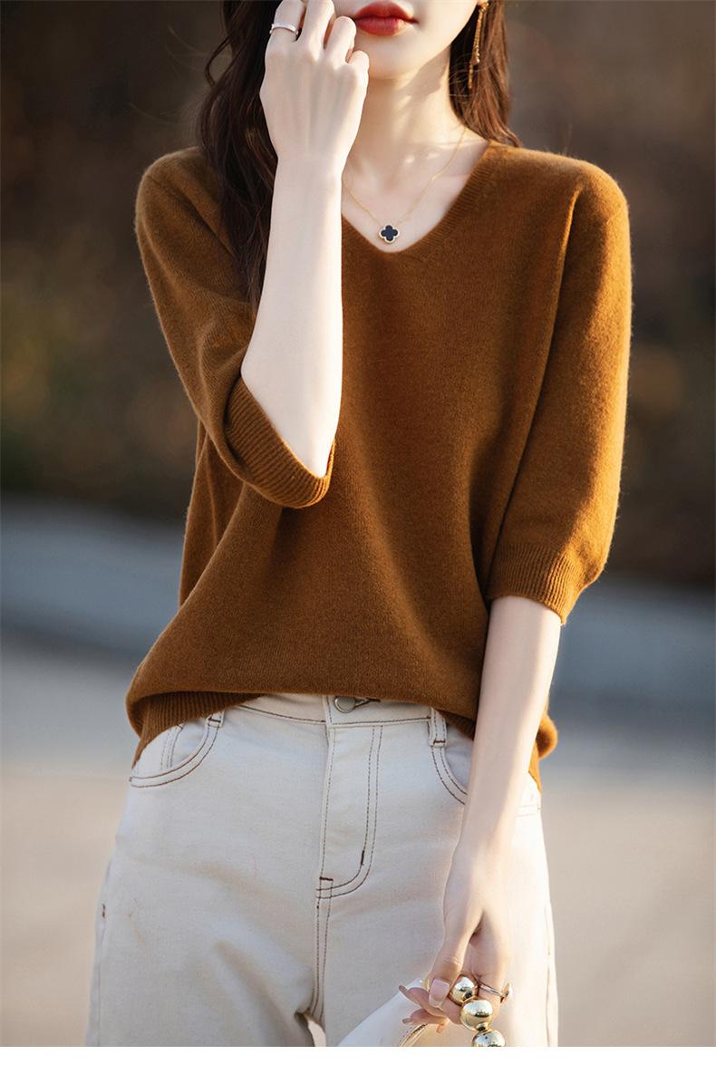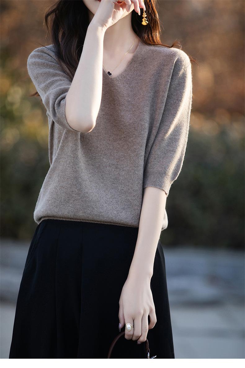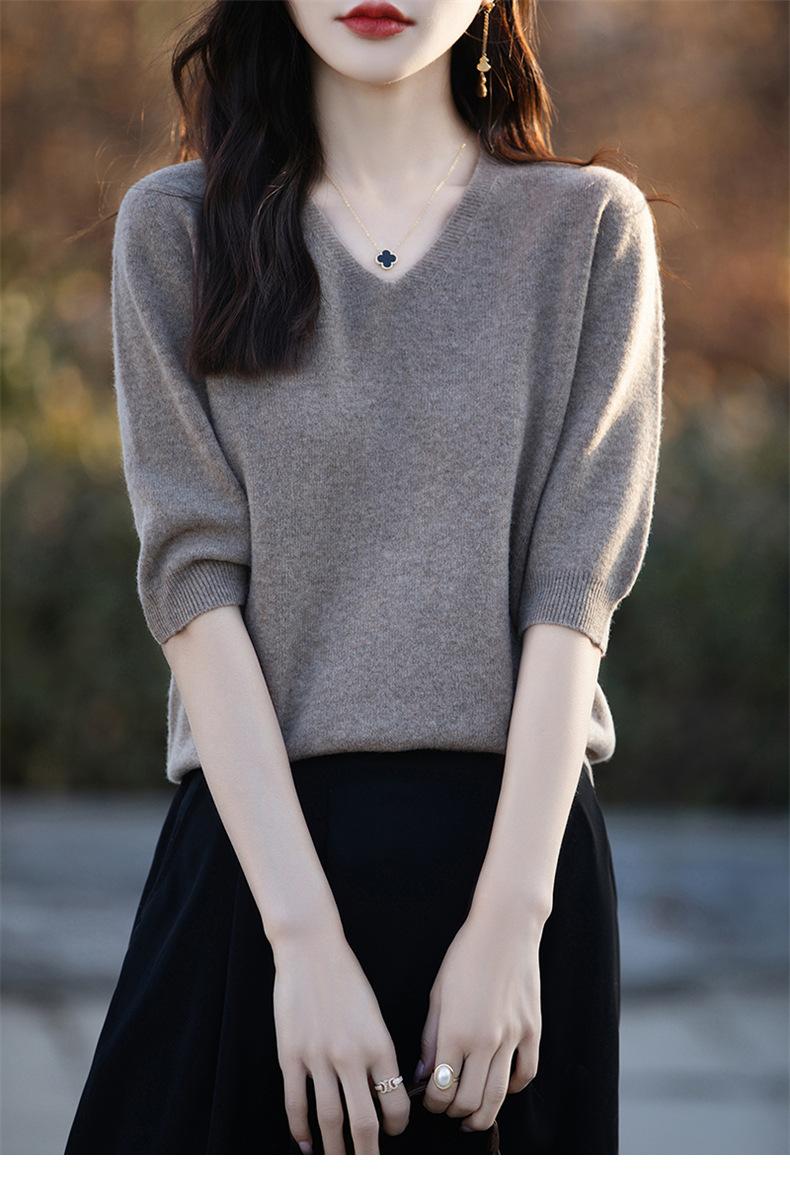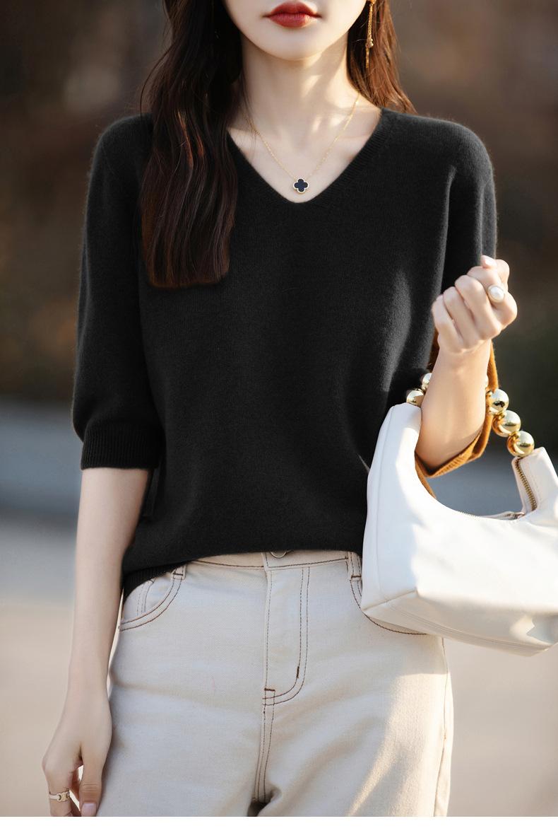 Compra Suéter de cuello en V manga corta para mujer color sólido manga media holgado jersey tejido camiseta base 25 primavera nueva línea ropa camiseta al por mayor en Joom.pro
