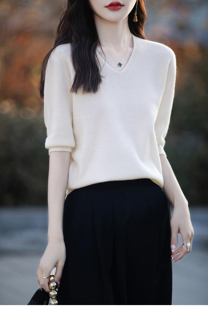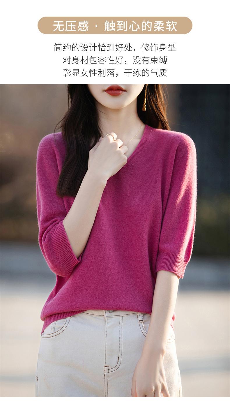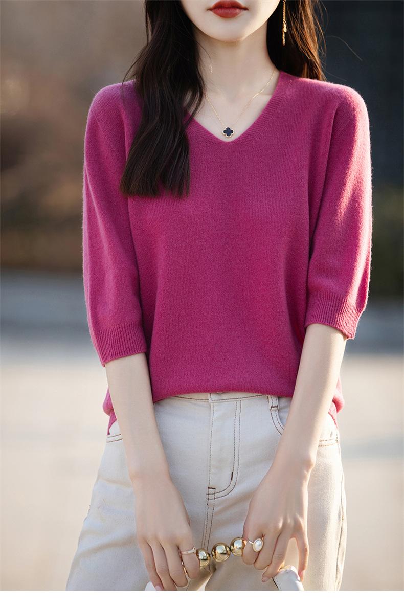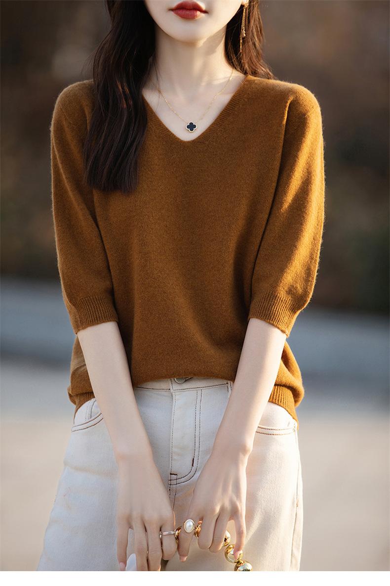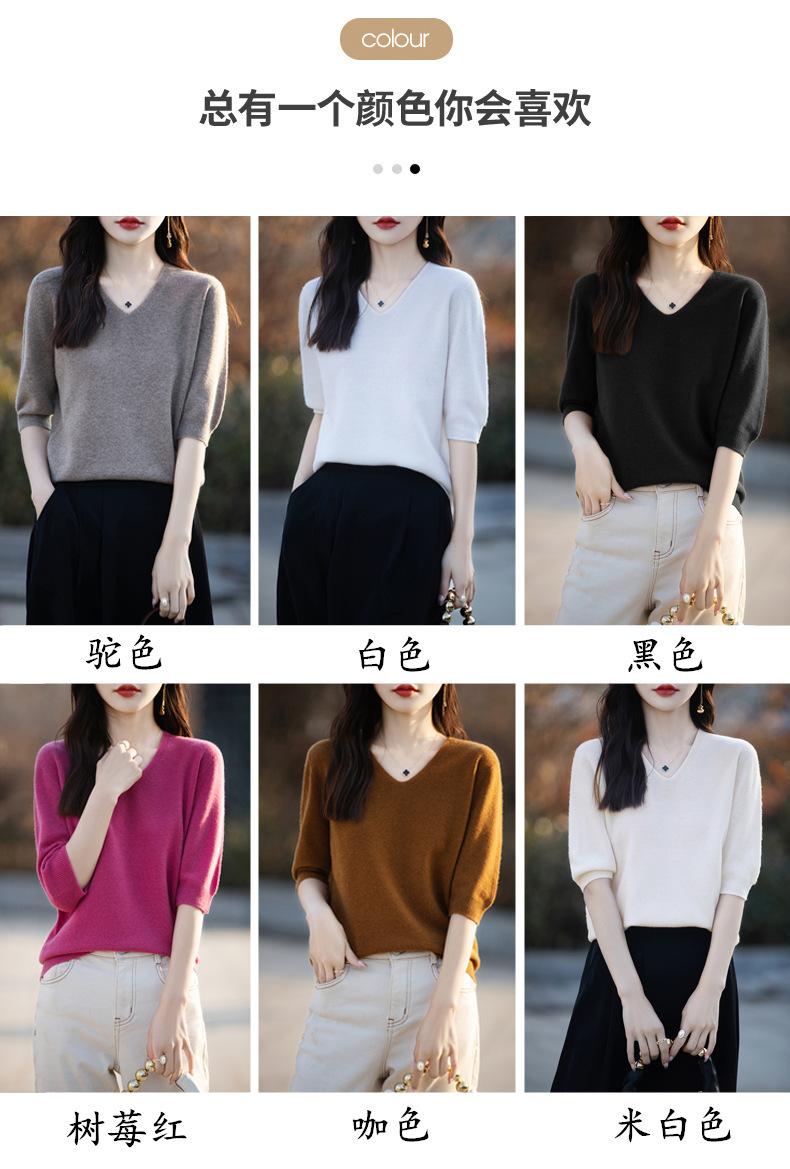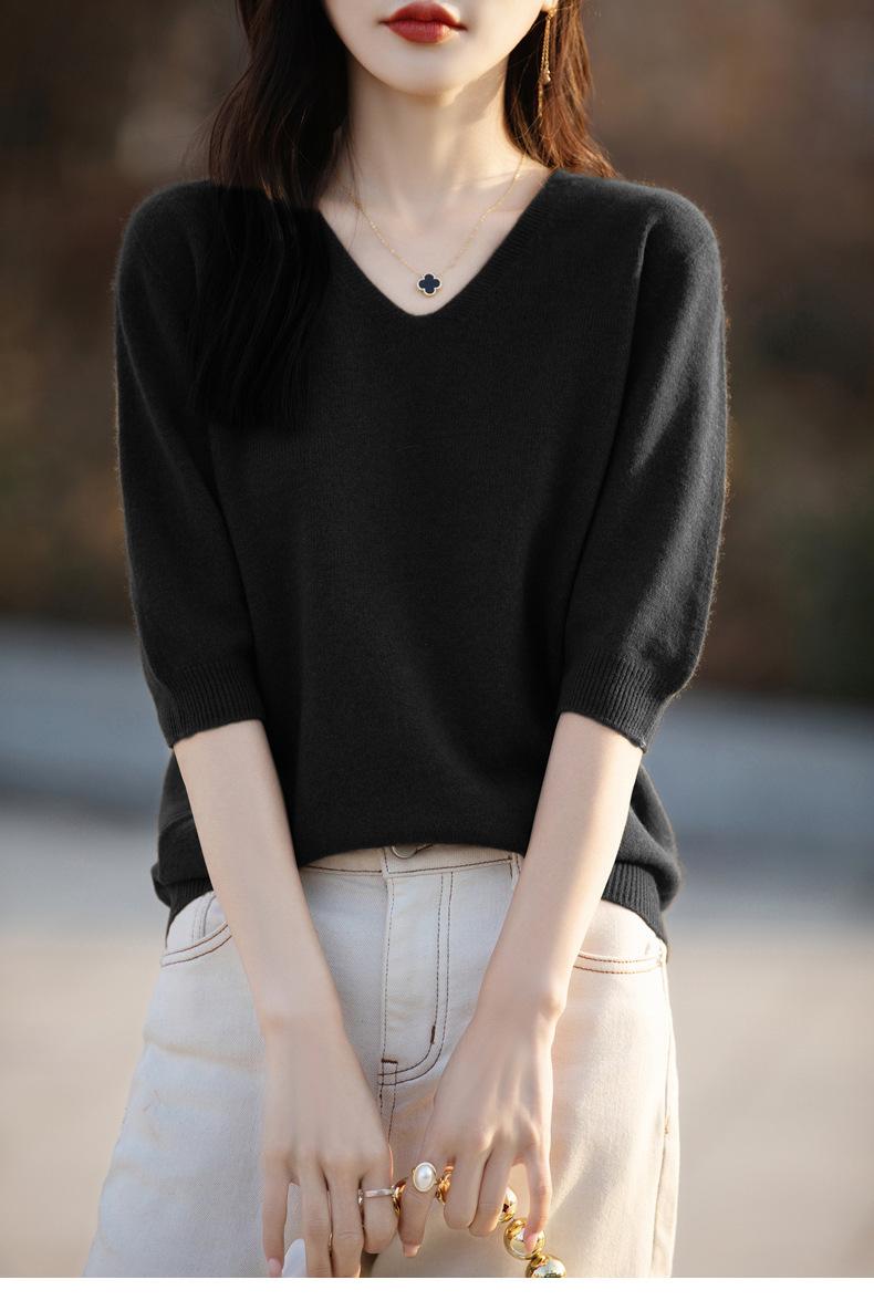 Compra Suéter de cuello en V manga corta para mujer color sólido manga media holgado jersey tejido camiseta base 25 primavera nueva línea ropa camiseta al por mayor en Joom.pro