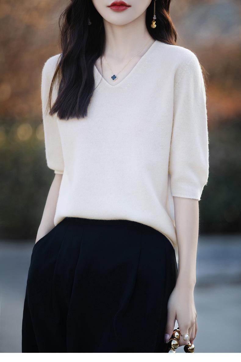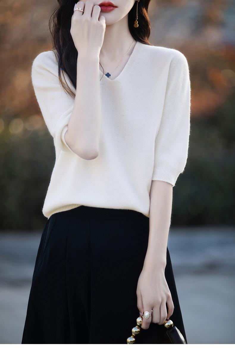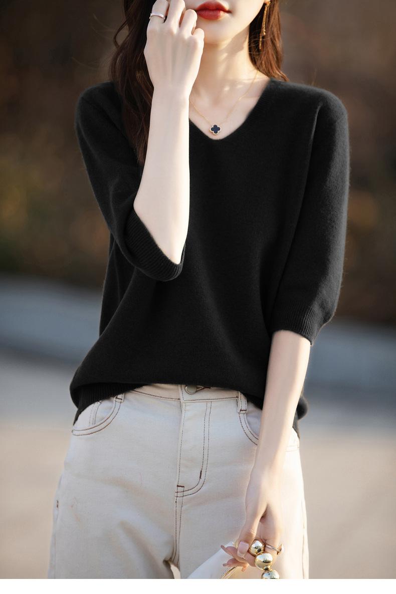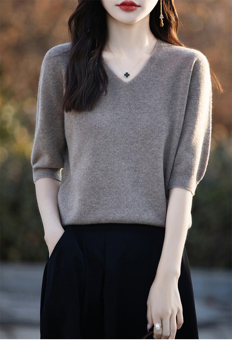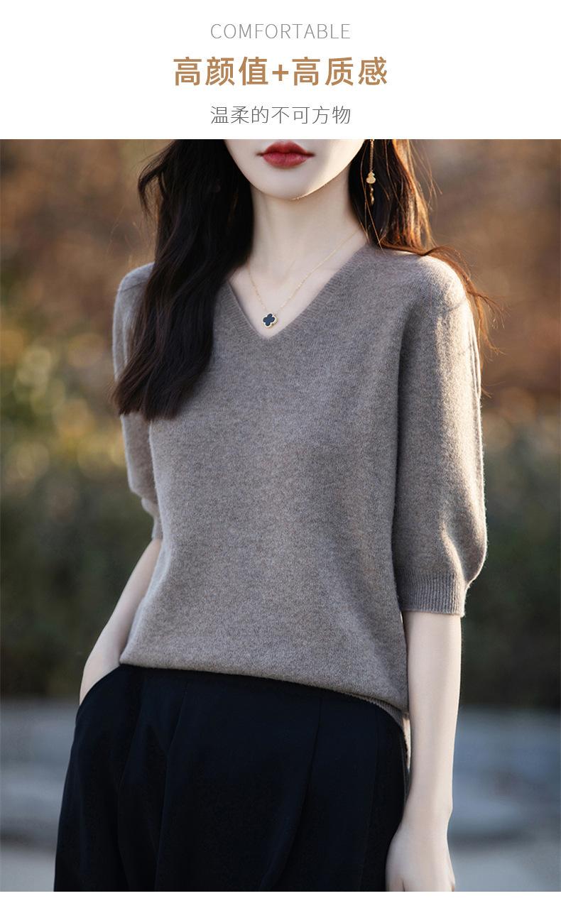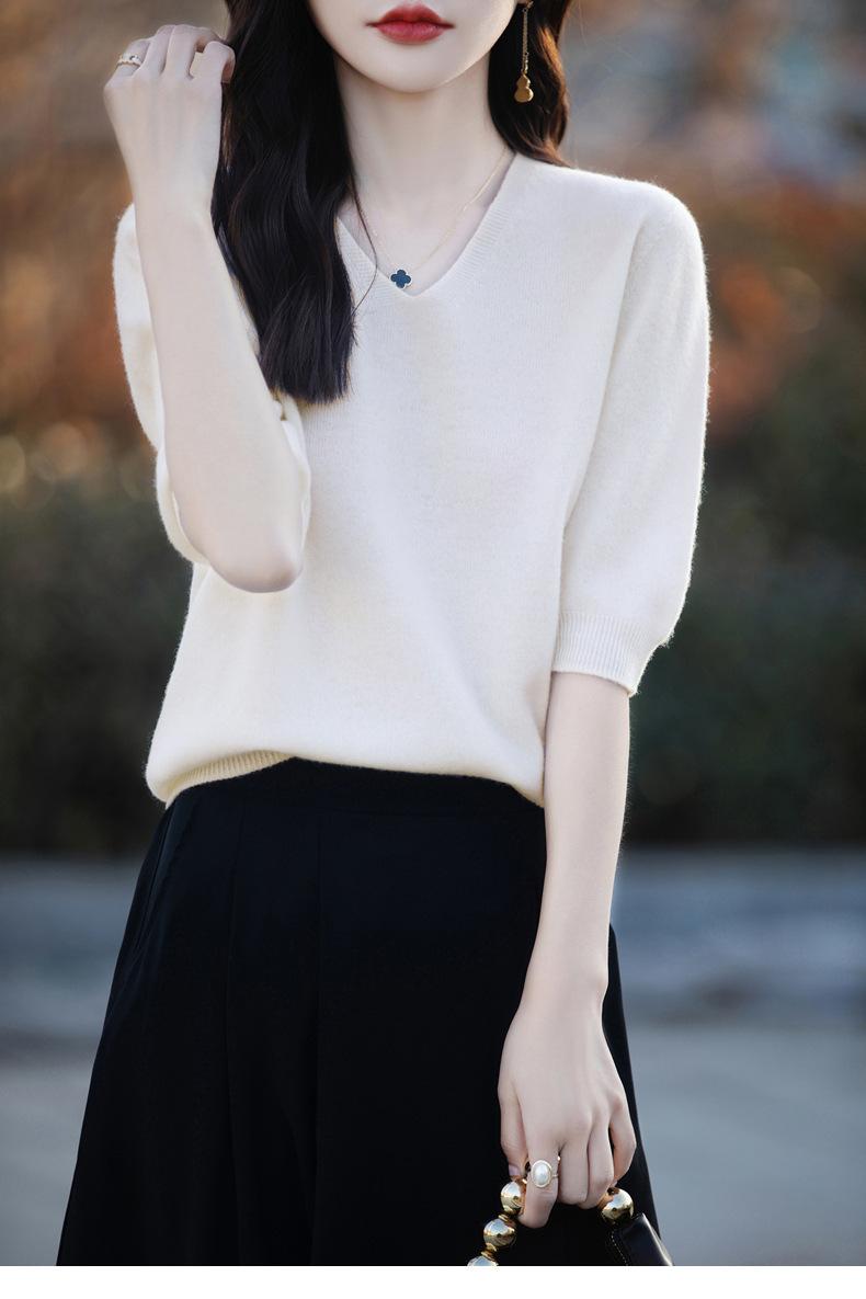 Compra Suéter de cuello en V manga corta para mujer color sólido manga media holgado jersey tejido camiseta base 25 primavera nueva línea ropa camiseta al por mayor en Joom.pro
