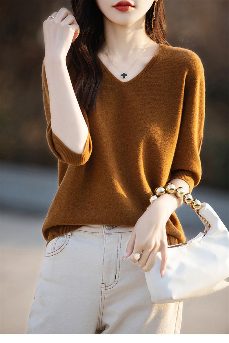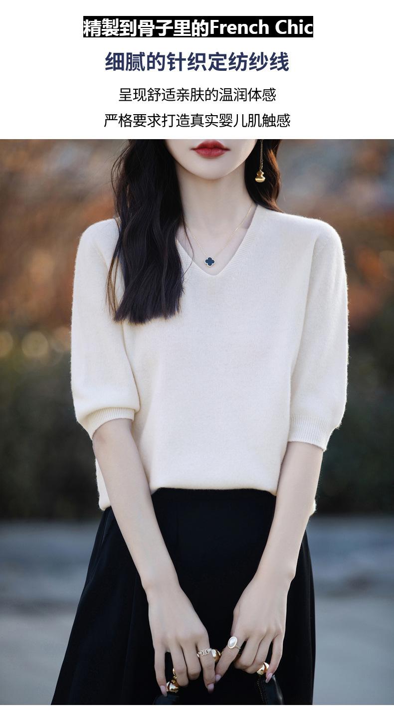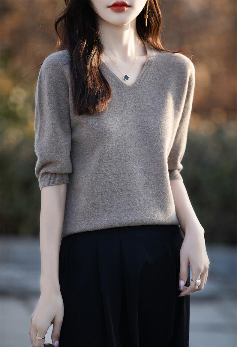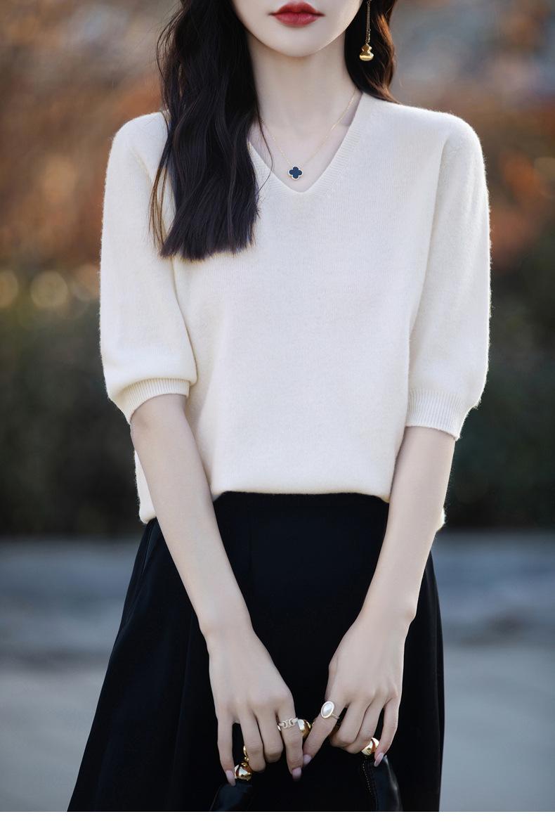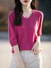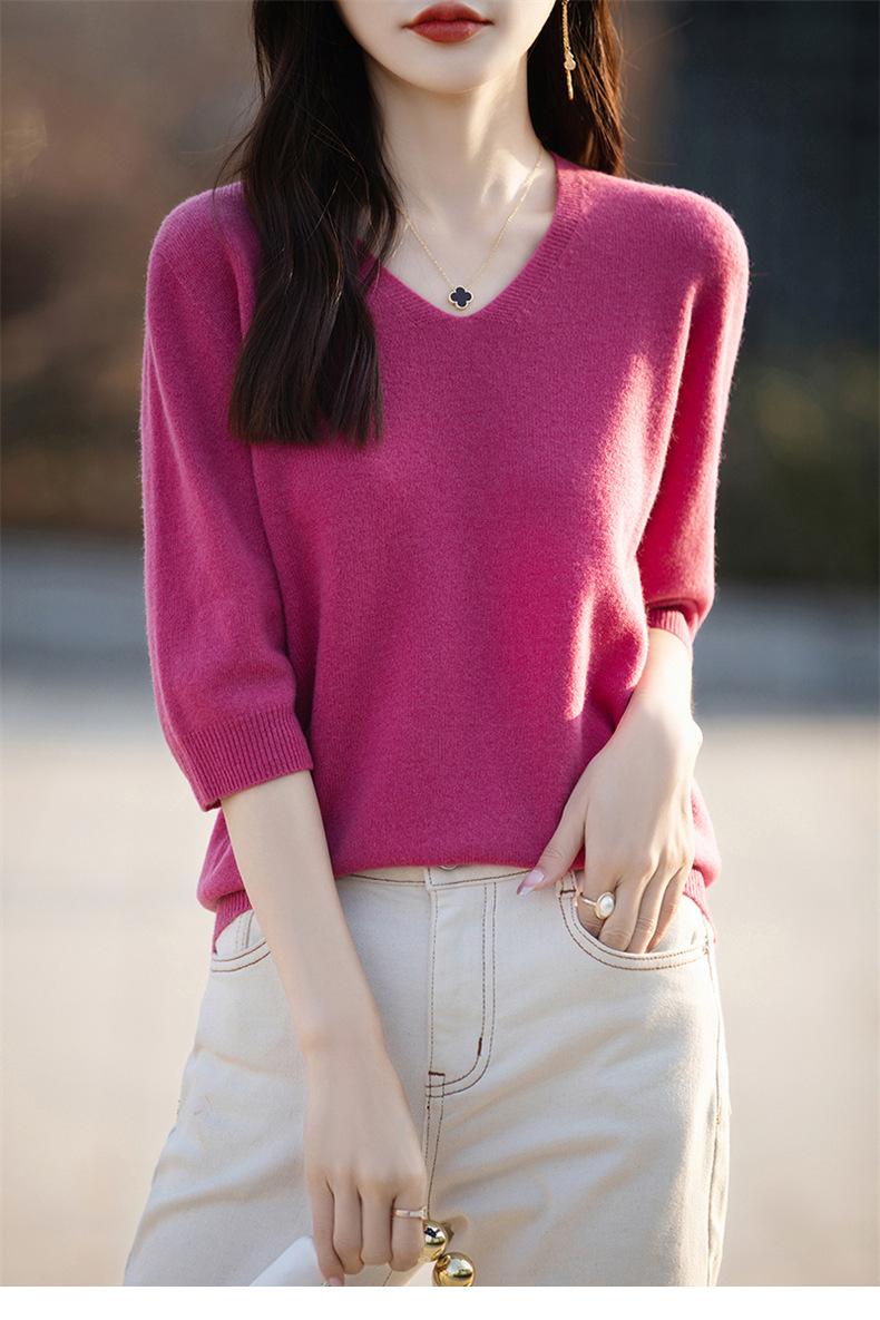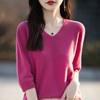 Compra Suéter de cuello en V manga corta para mujer color sólido manga media holgado jersey tejido camiseta base 25 primavera nueva línea ropa camiseta al por mayor en Joom.pro