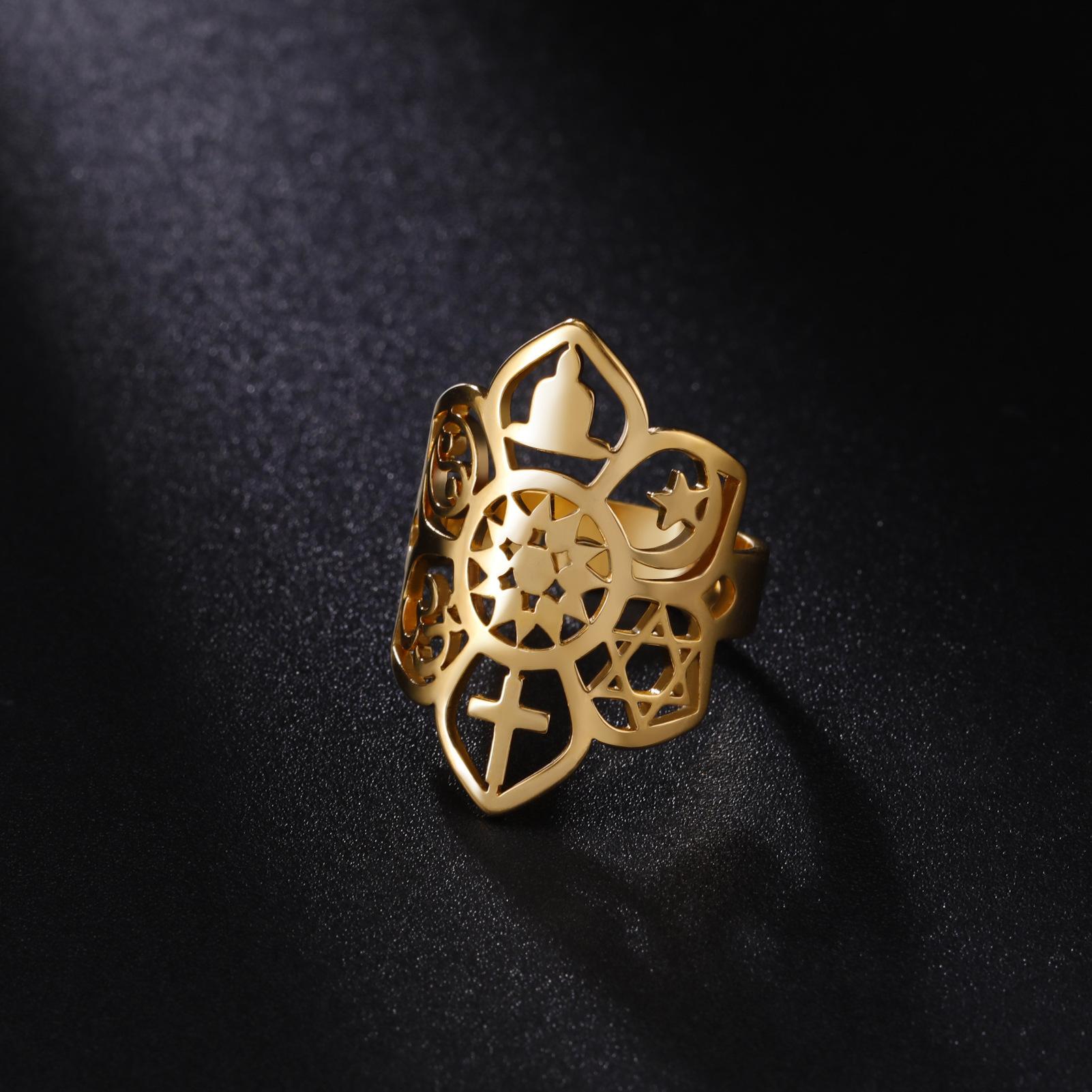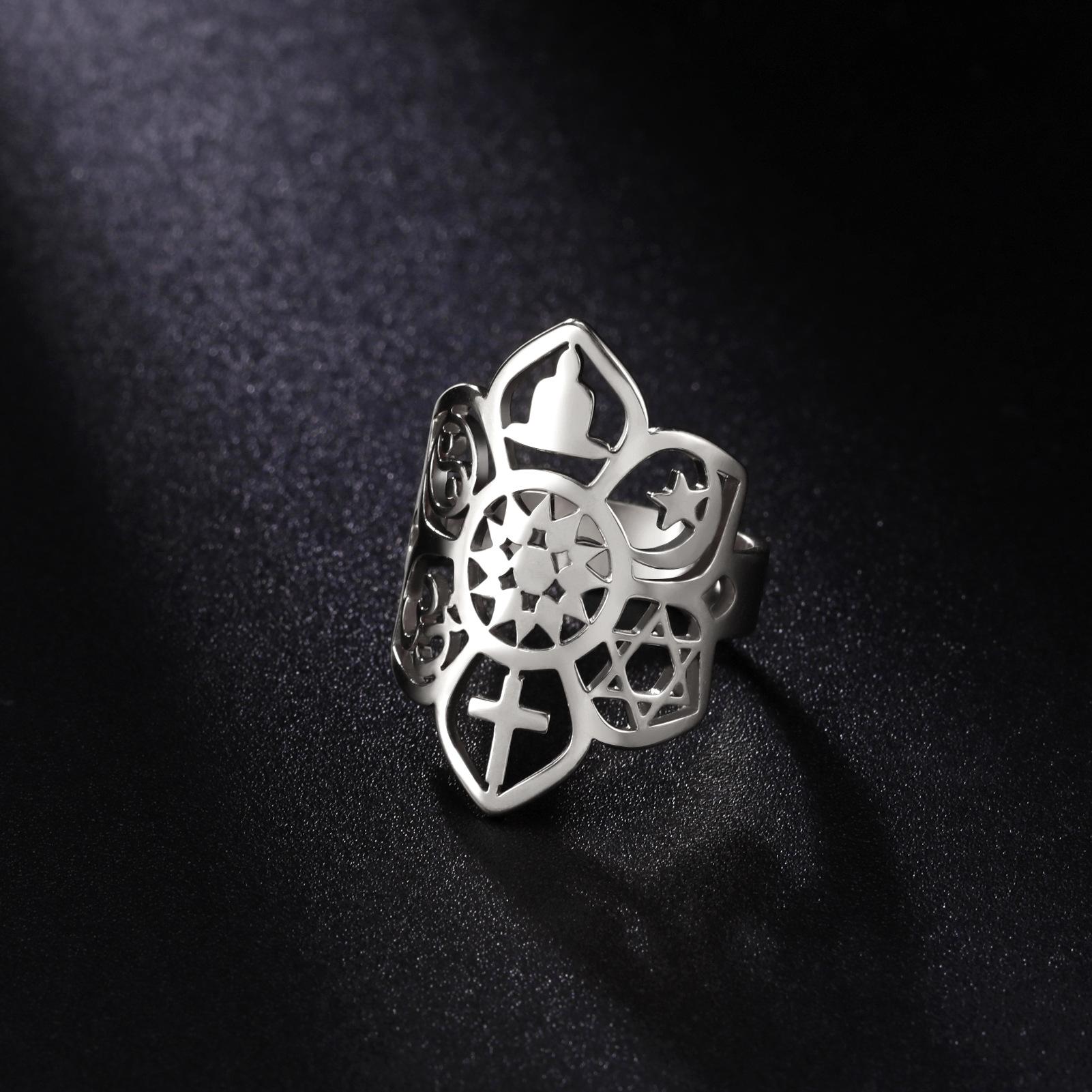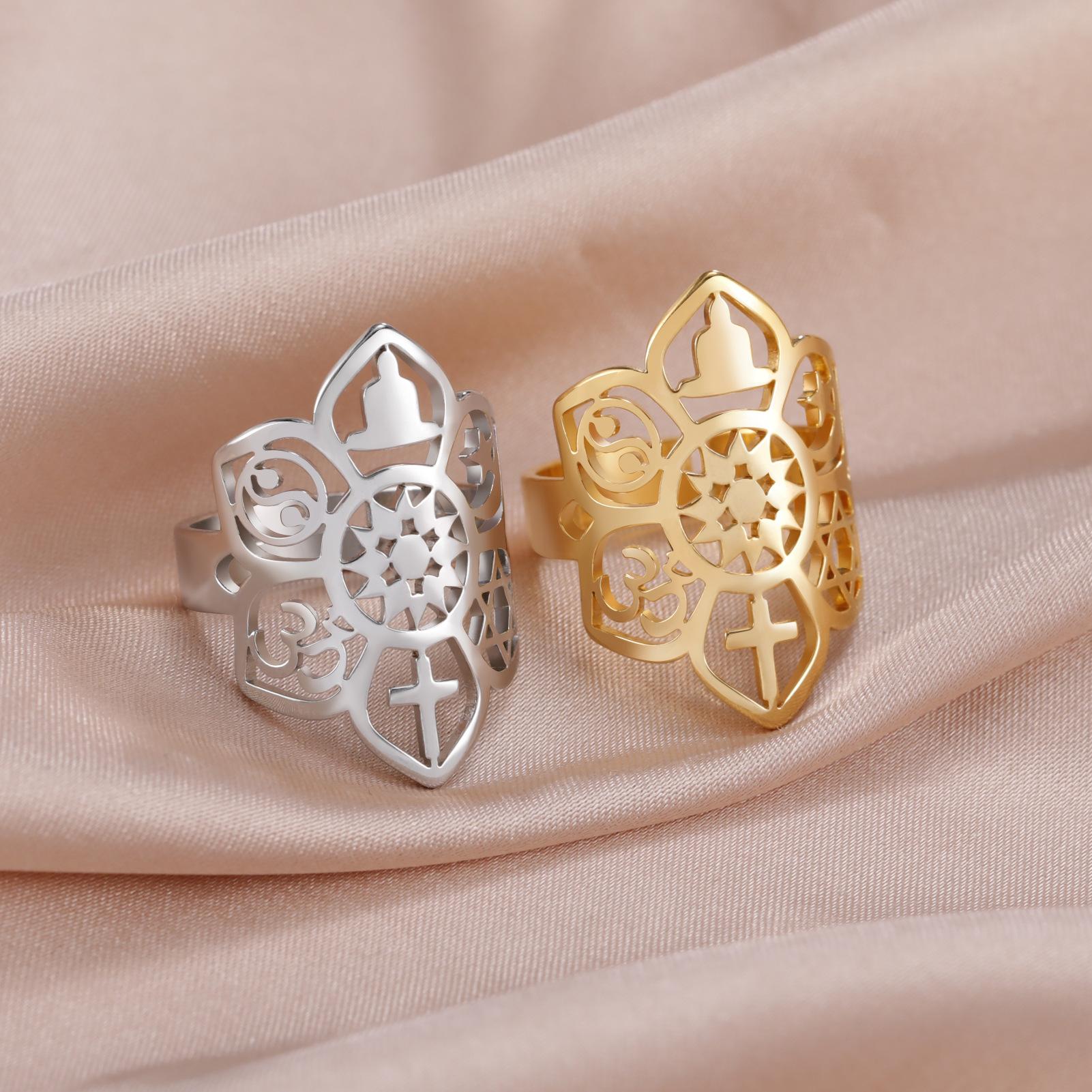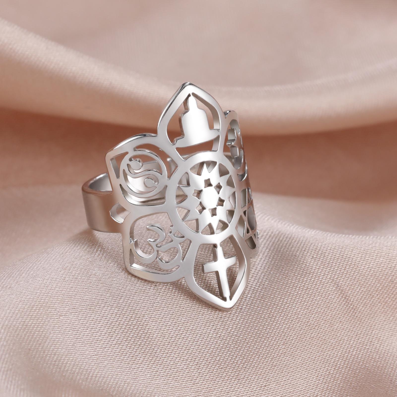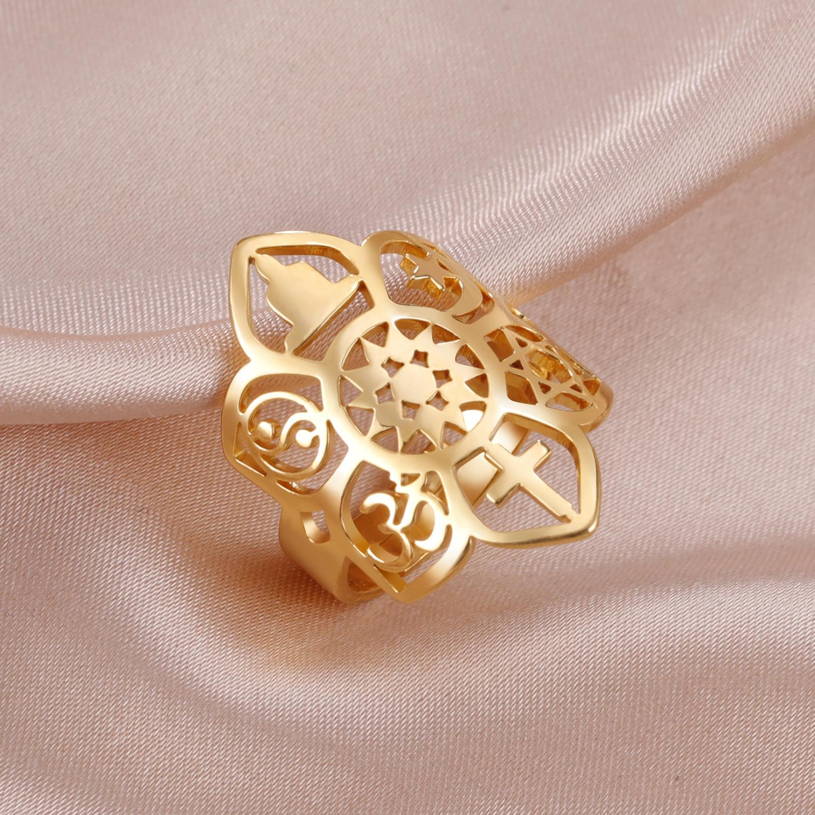 Venta directa de fábrica, comercio exterior, nuevo anillo de acero inoxidable de alta calidad con símbolo Om hueco, cruz de seis puntas y estrella.