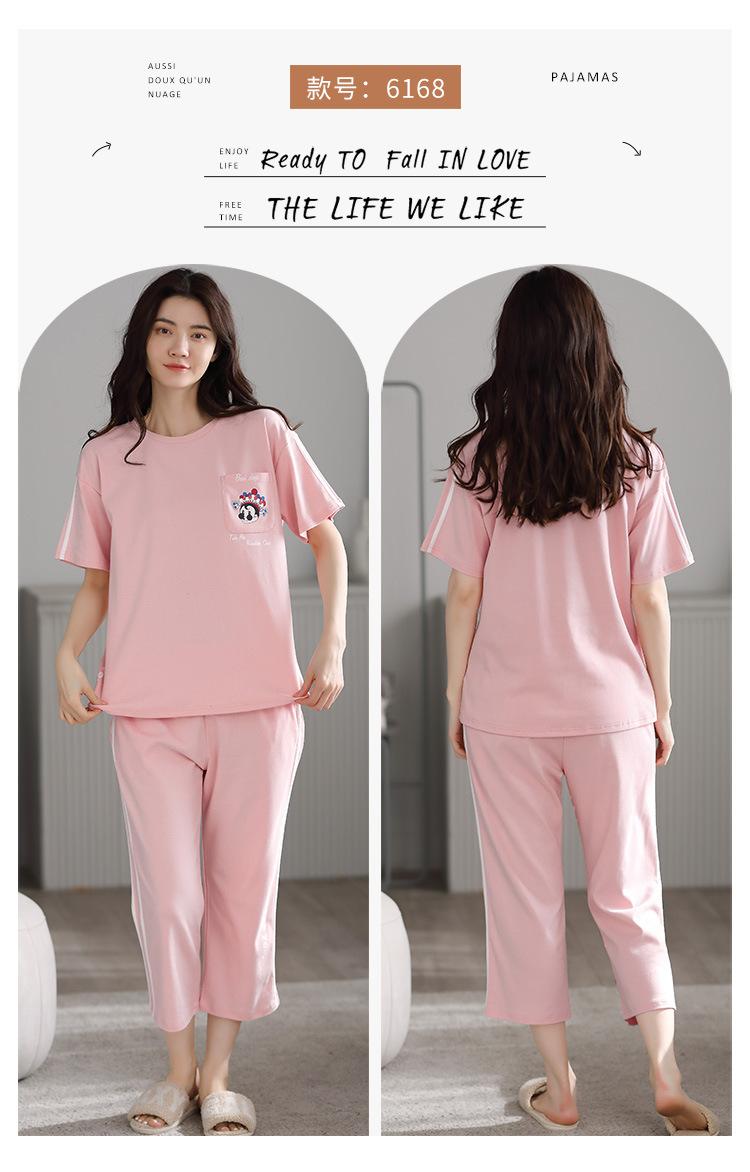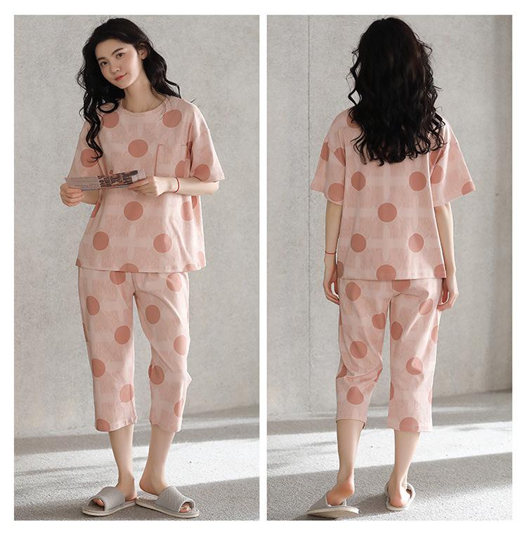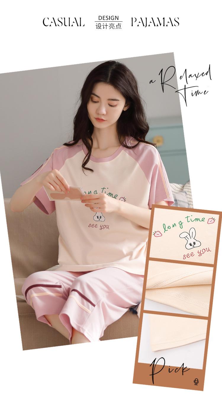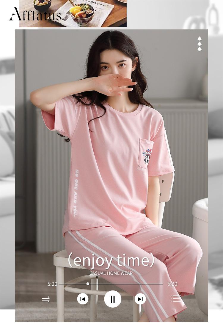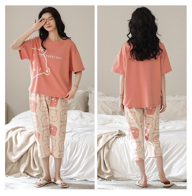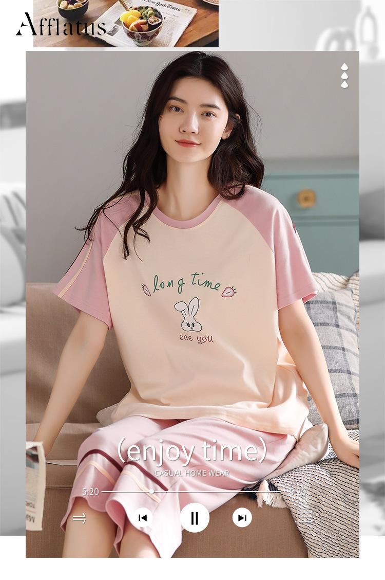 Pijama Nuevo Verano para Mujer Algodón Manga Corta Pantalón Capri Ropa para el Hogar Cuello Redondo Ropa Exterior Casual Traje de Dos Piezas Delgado
