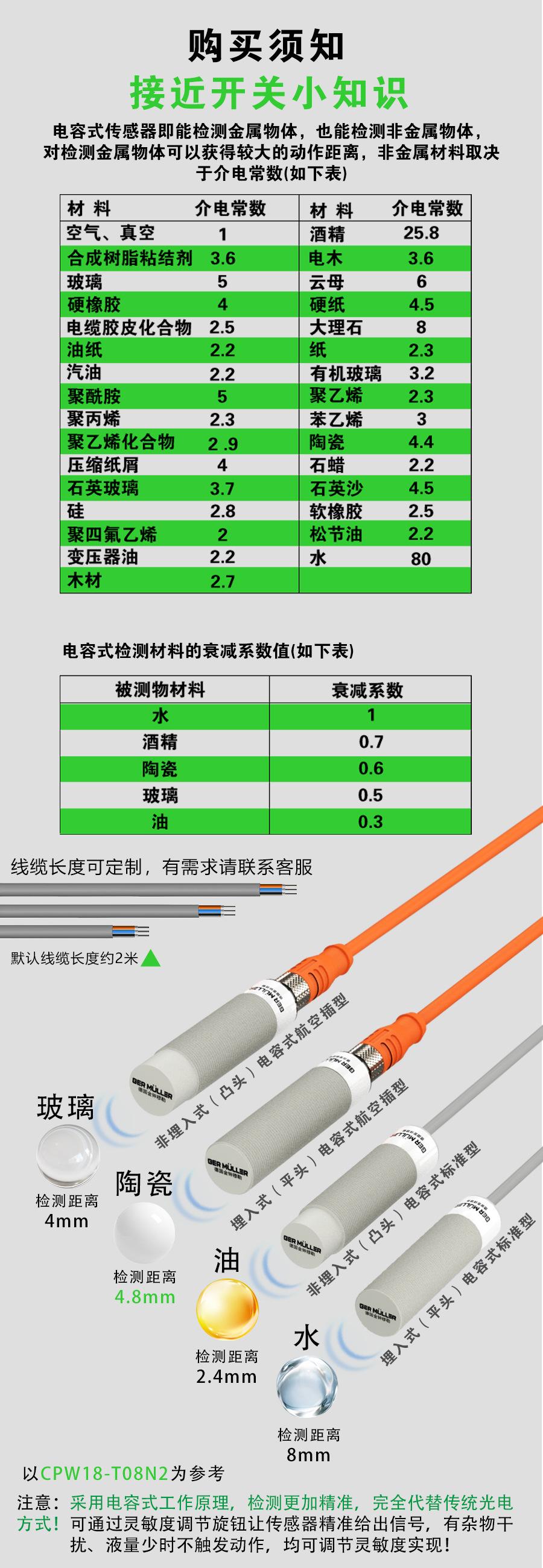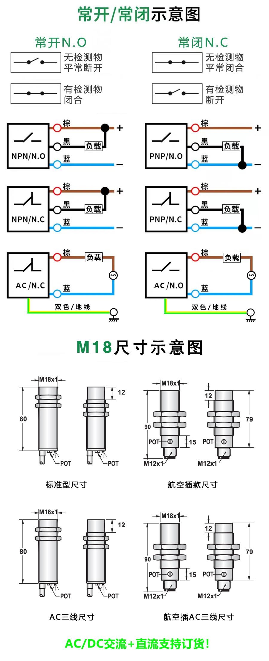 CPW18-K15N1: Distance: 2-15mm adjustable NPN normally open convex head non-embedded M18, CPW18-K15N2: Distance...