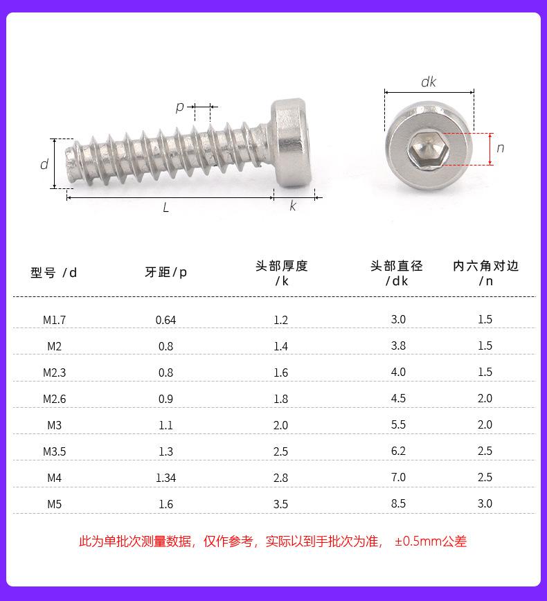 M1.7 * 3, M1.7 * 4, M1.7 * 5, M2 * 3, M2 * 4, M2 * 5, M2 * 6, M2 * 8, M2 * 10, M2 * 12, M2.3 * 4, M2.3 * 5, M2...