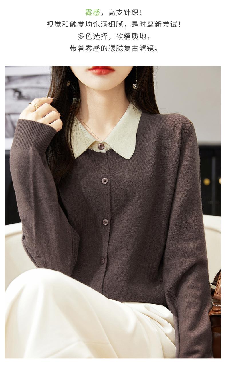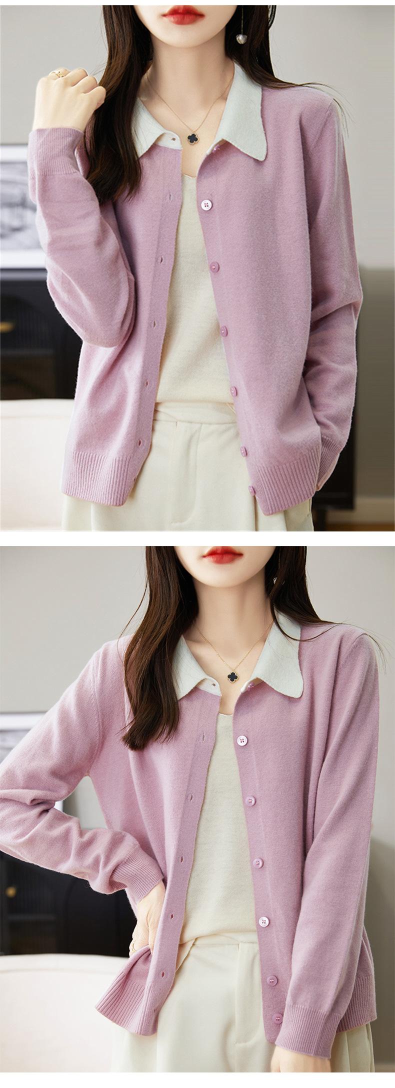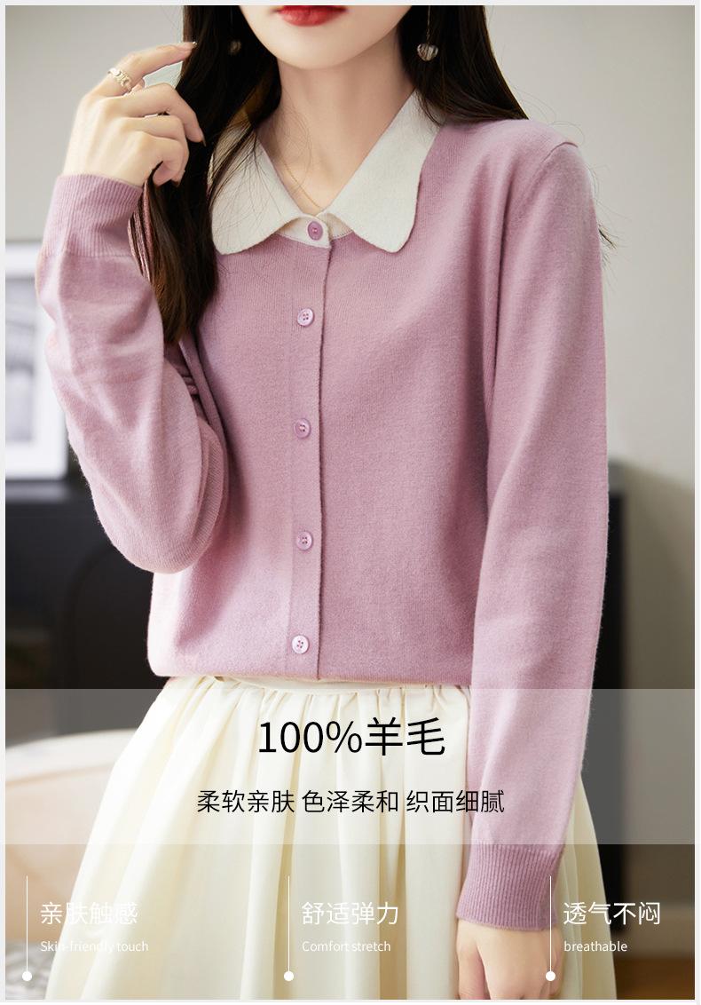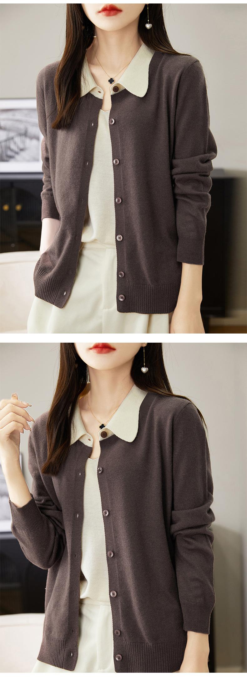 Suéter de lana de despacho de comercio exterior con solapa a juego de colores, cárdigan de punto 100% lana, abrigo pequeño de primavera y verano para mujer al por mayor