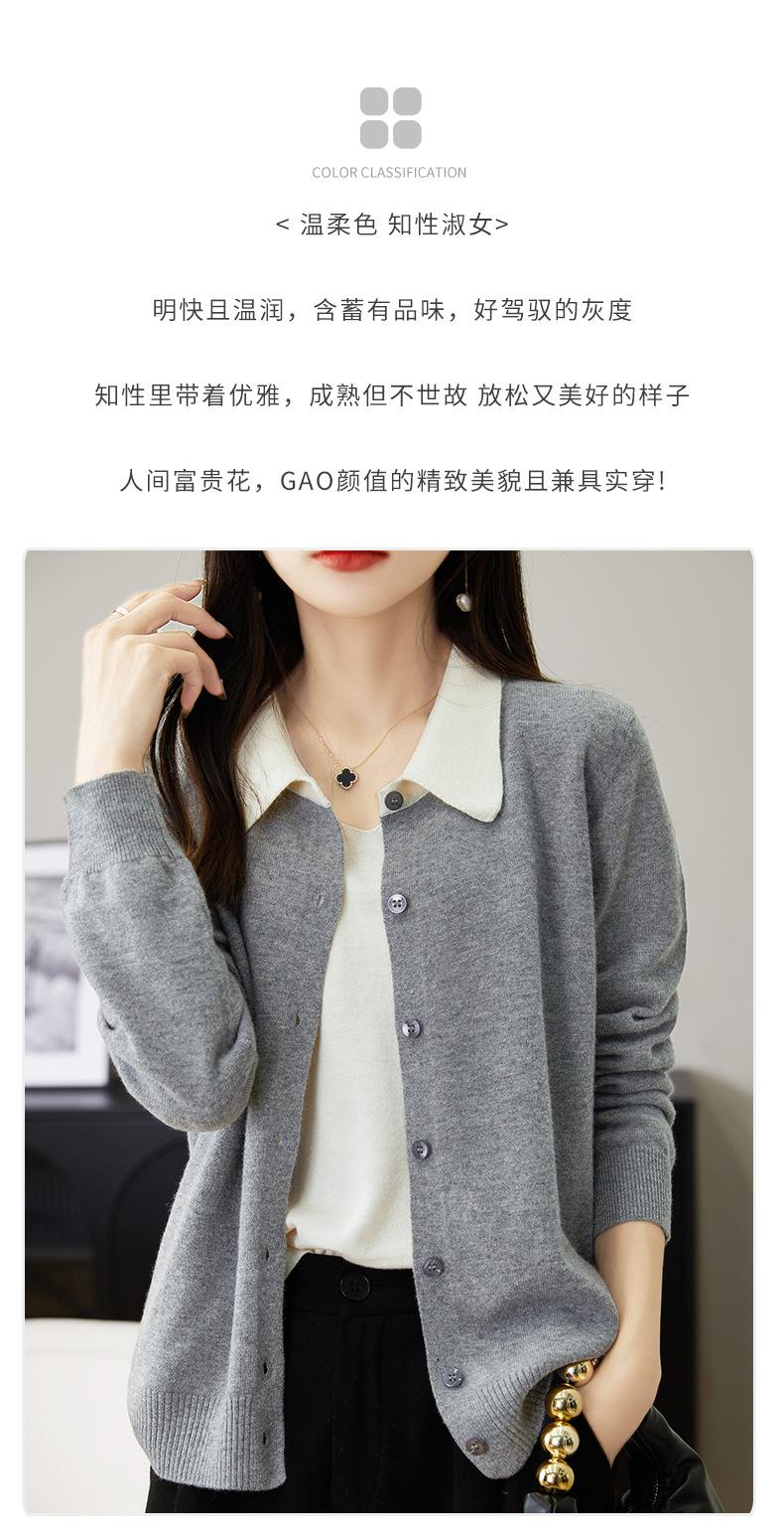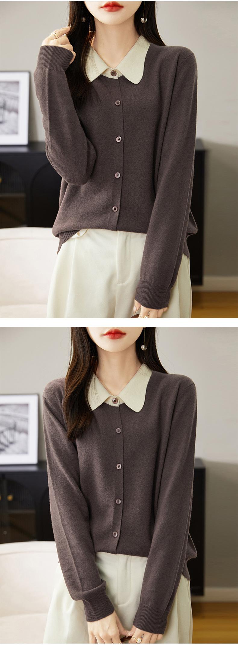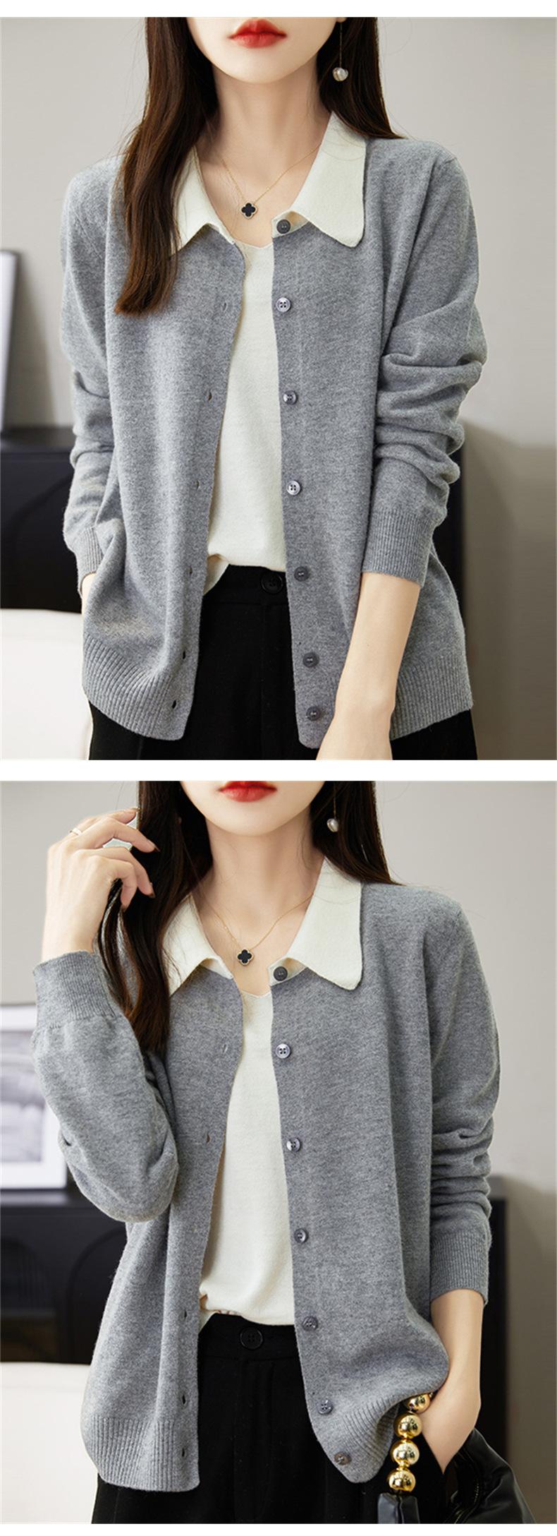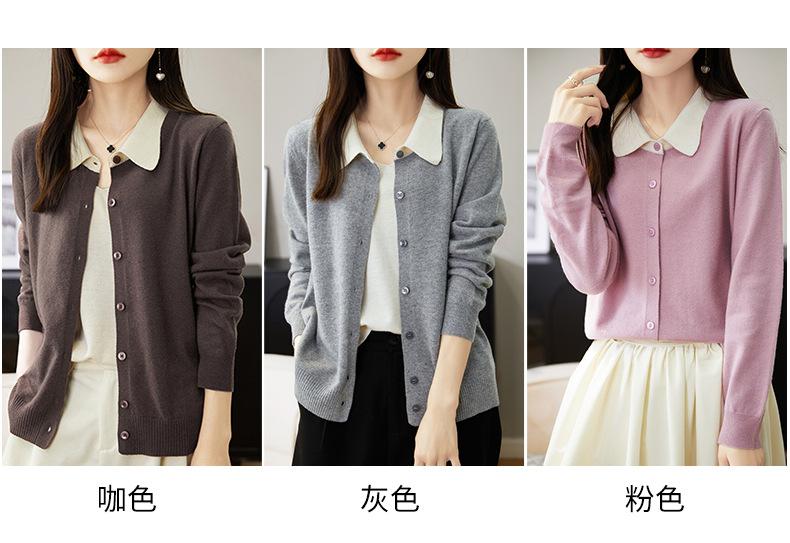 Suéter de lana de despacho de comercio exterior con solapa a juego de colores, cárdigan de punto 100% lana, abrigo pequeño de primavera y verano para mujer al por mayor