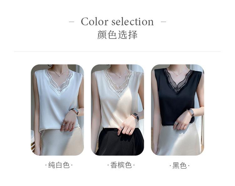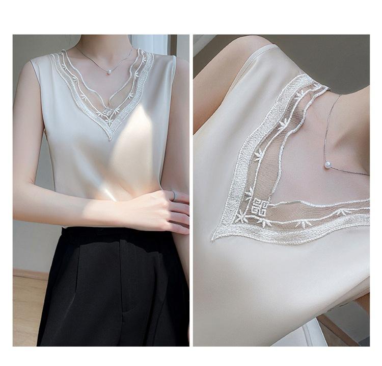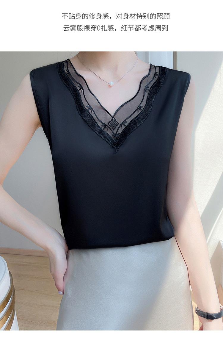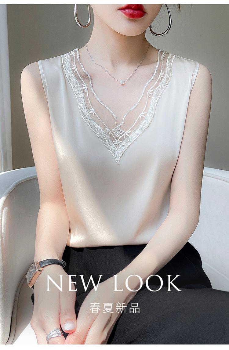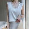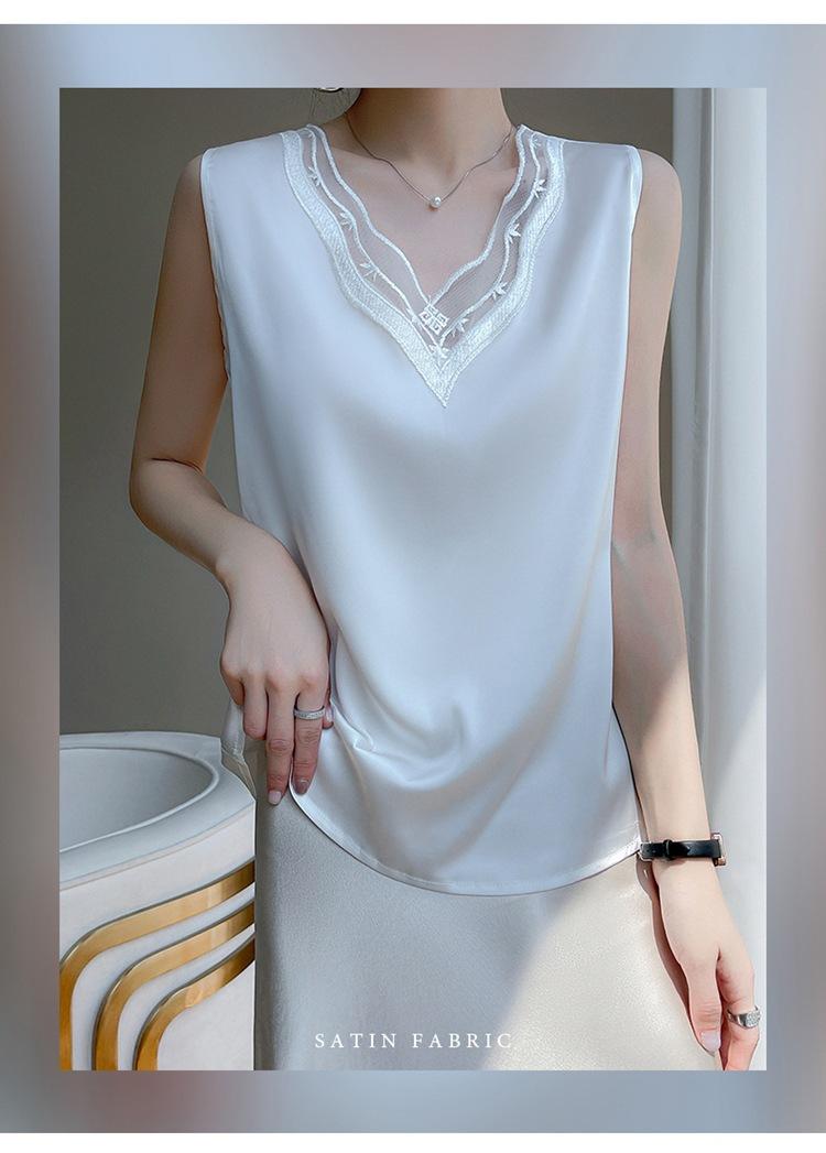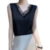 Camiseta de satén de seda con cuello en V y costuras de malla, color liso, versátil, estilo coreano, sin mangas, primavera/verano 2024