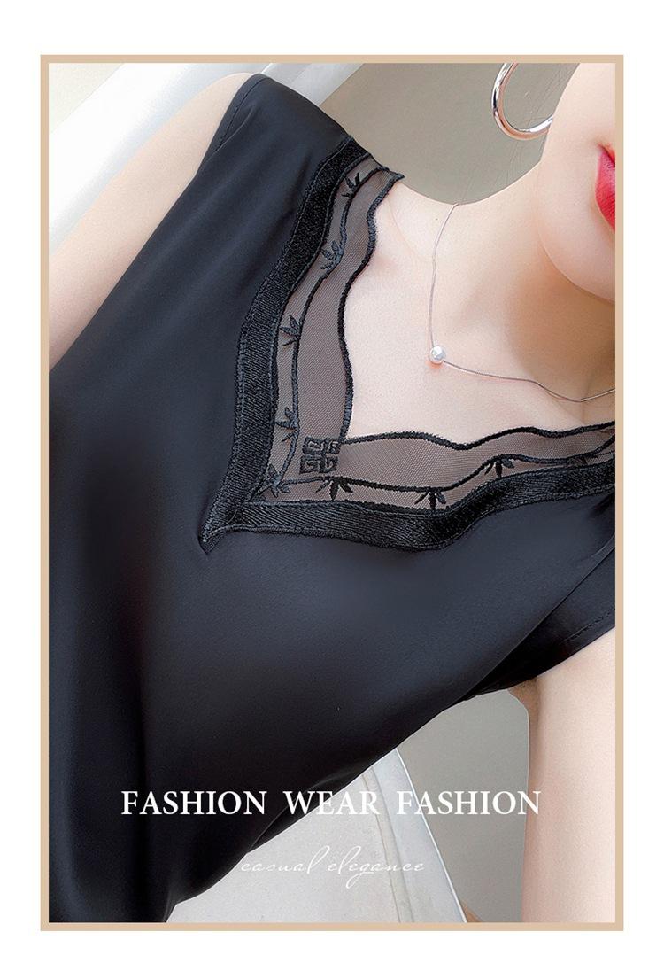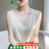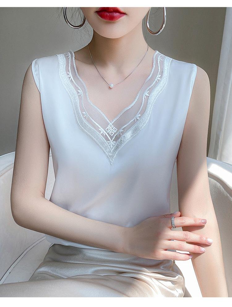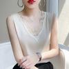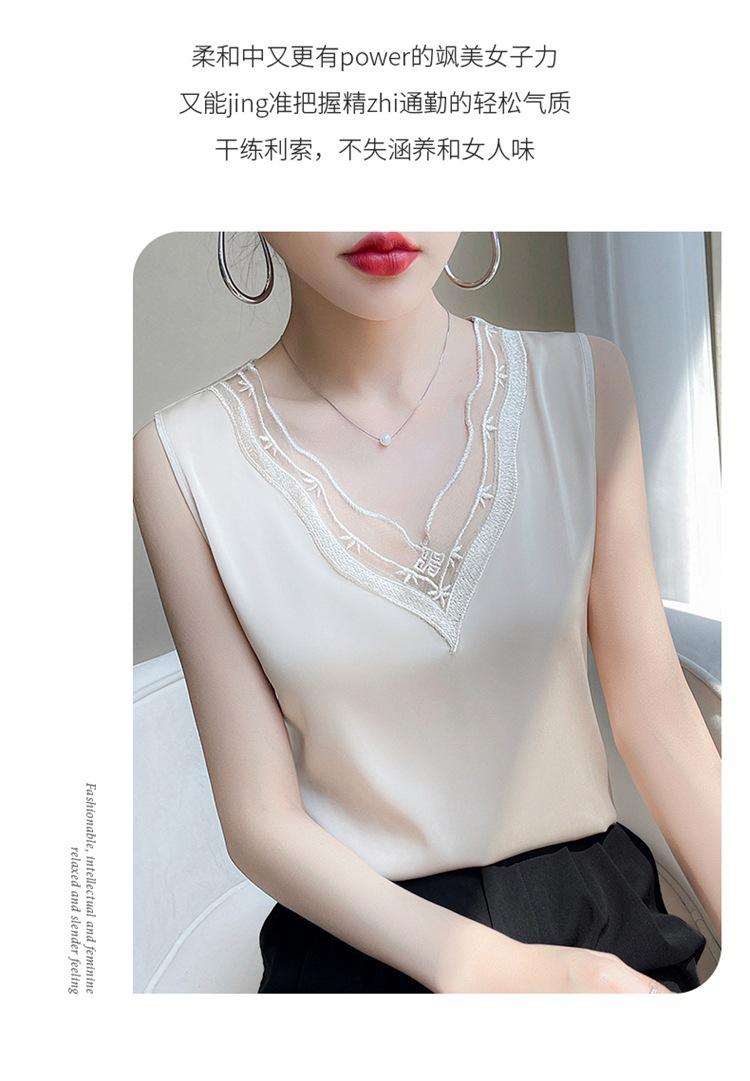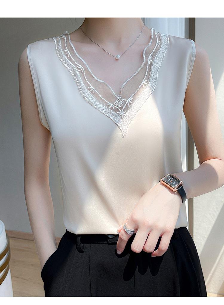 Camiseta de satén de seda con cuello en V y costuras de malla, color liso, versátil, estilo coreano, sin mangas, primavera/verano 2024