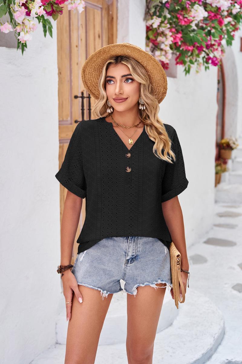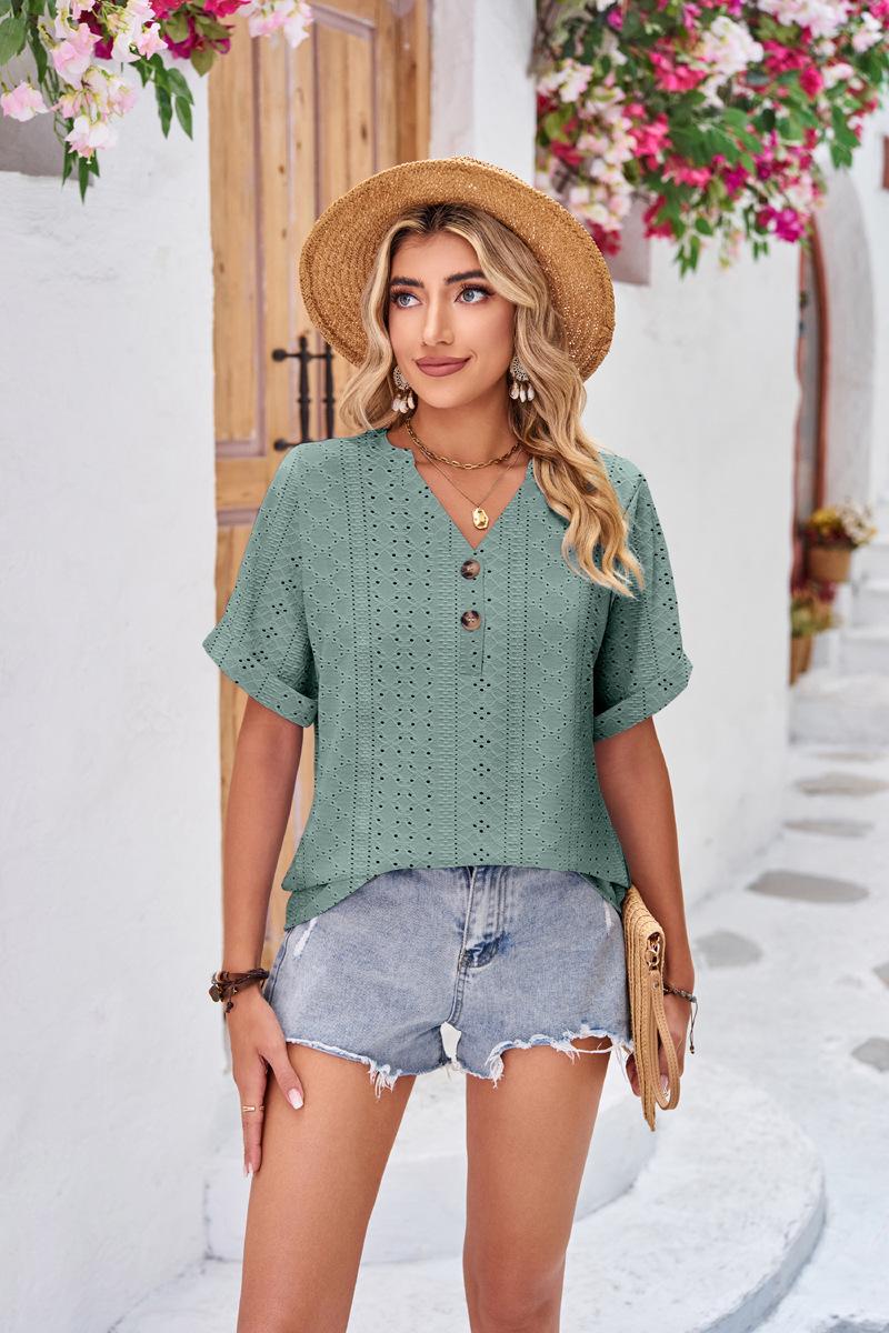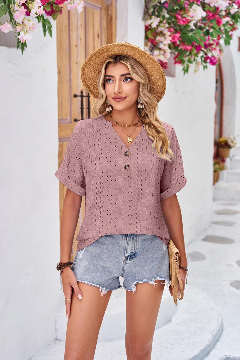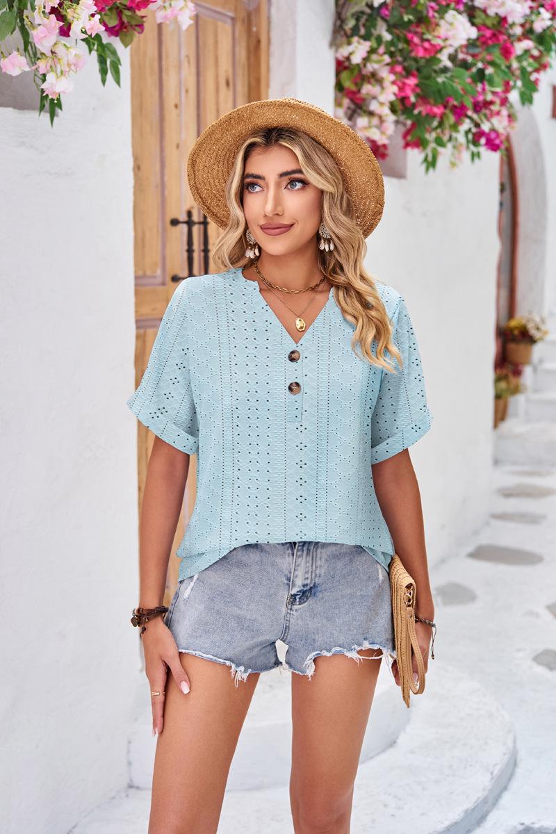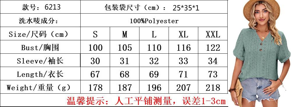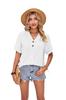 Nueva camiseta de manga corta con cuello en V y botones rizados para mujer de Amazon europea y americana transfronteriza, estilo casual y holgado.