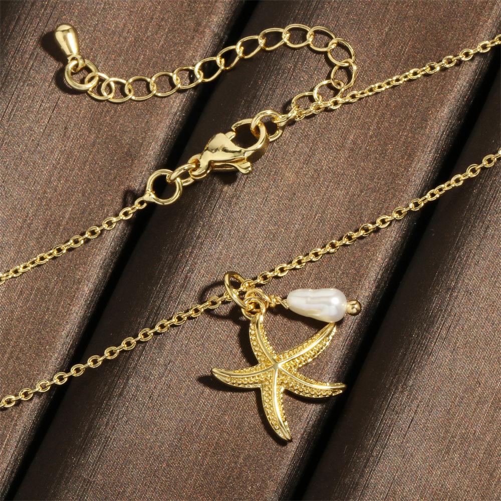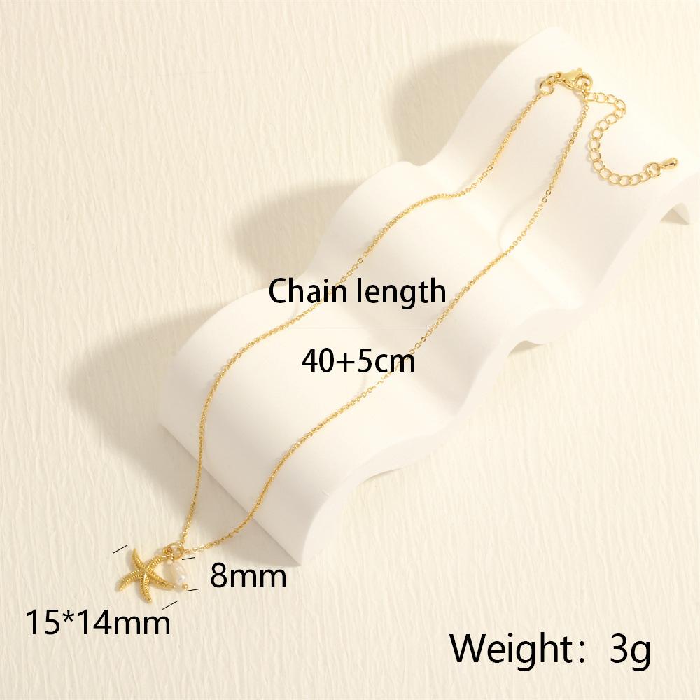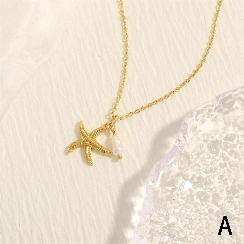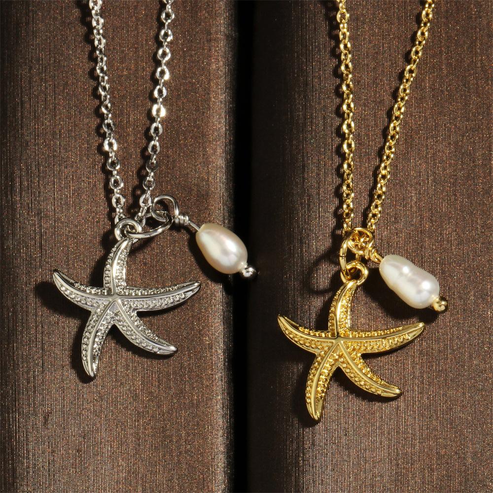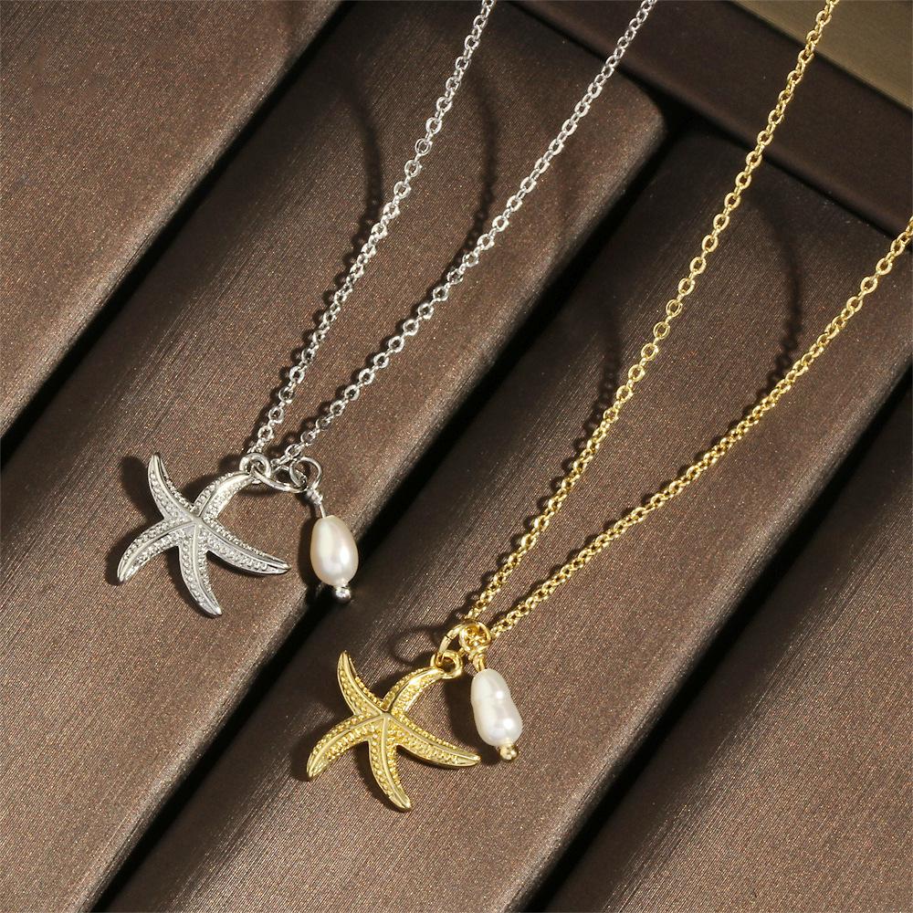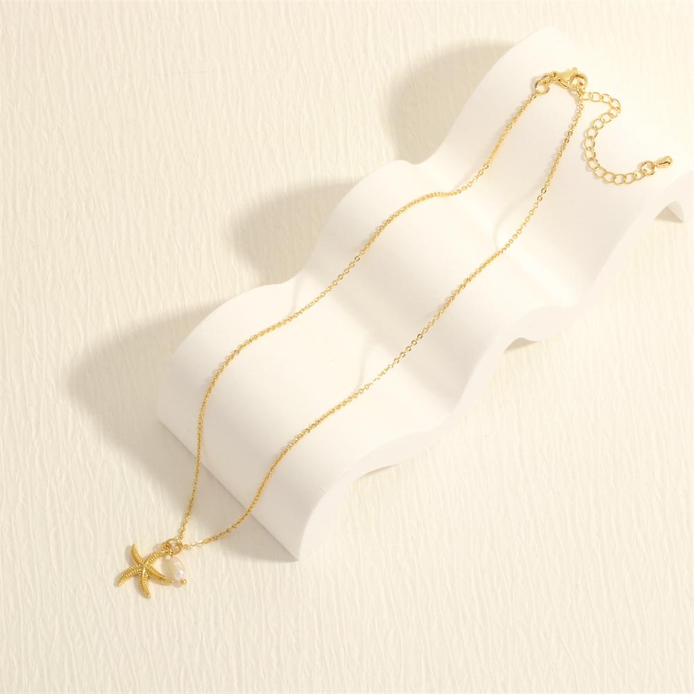 Collar con colgante de estrella de mar y perlas de estilo coreano transfronterizo, elegante y sencillo, con cadena de clavícula chapada en oro de 18 quilates.