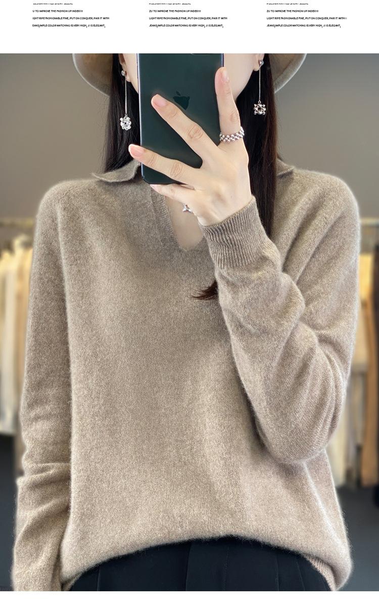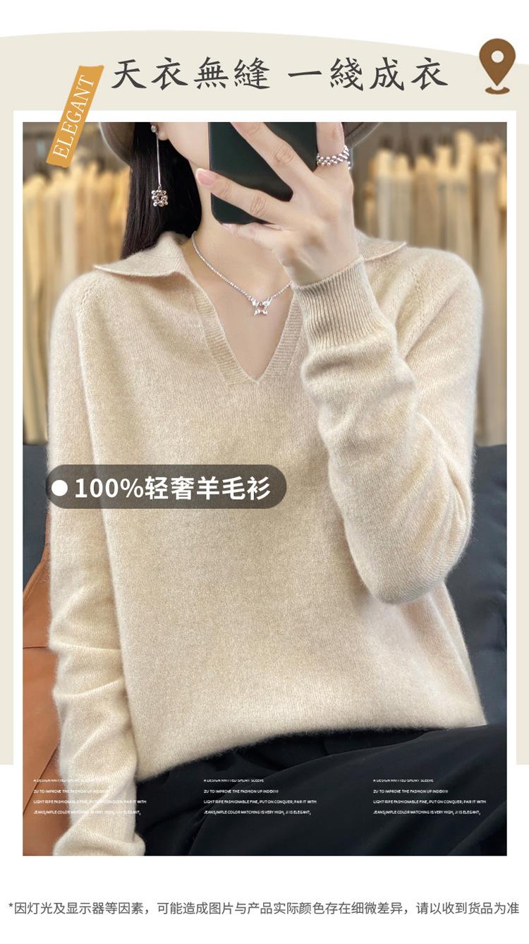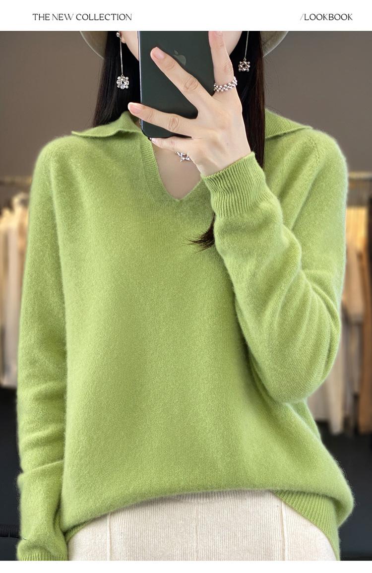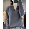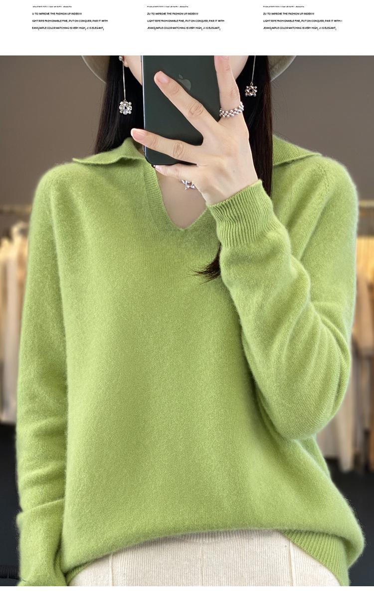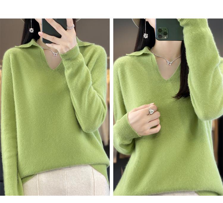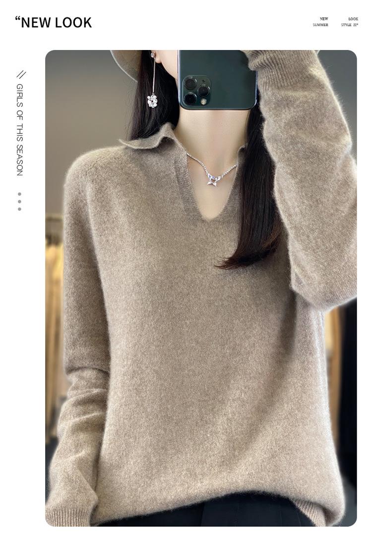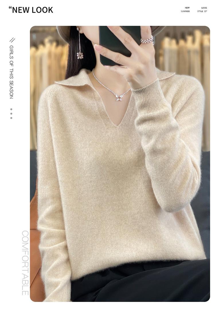 Otoño e invierno Nuevo suéter de lana 100 pura para mujer, elegante cuello en V, punto interior, solapa holgada adelgazante exterior