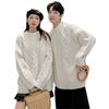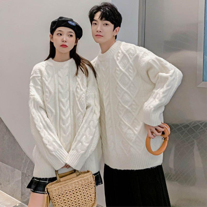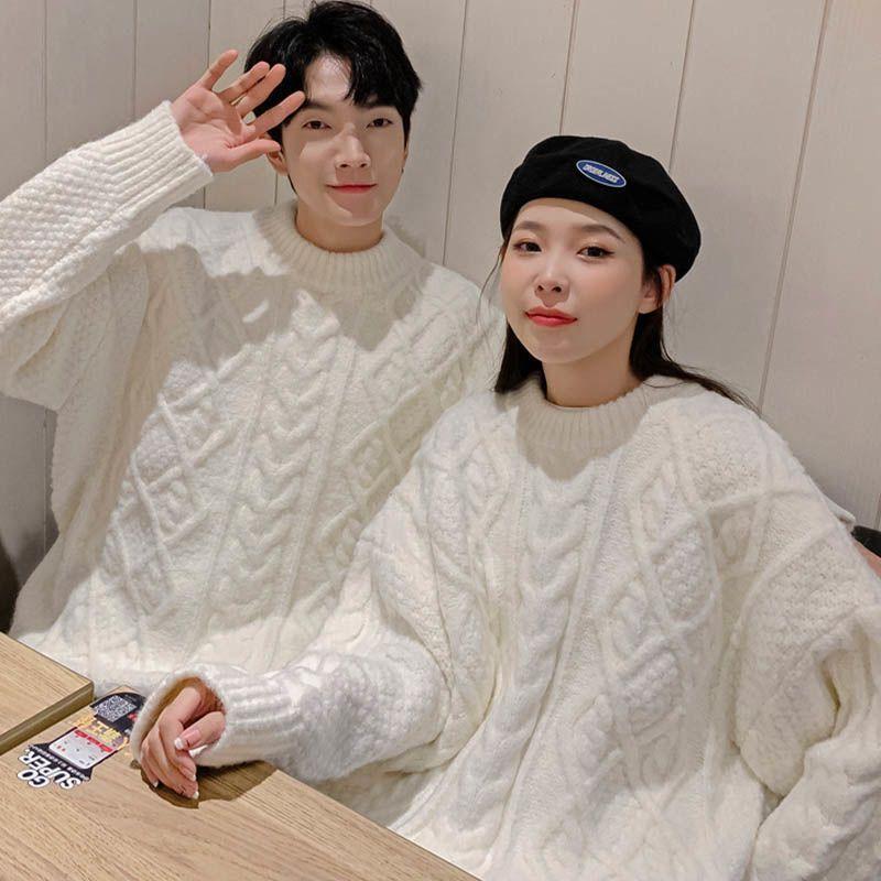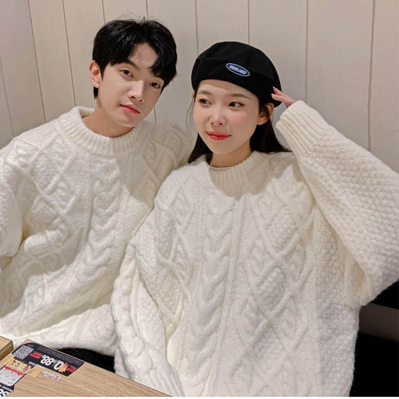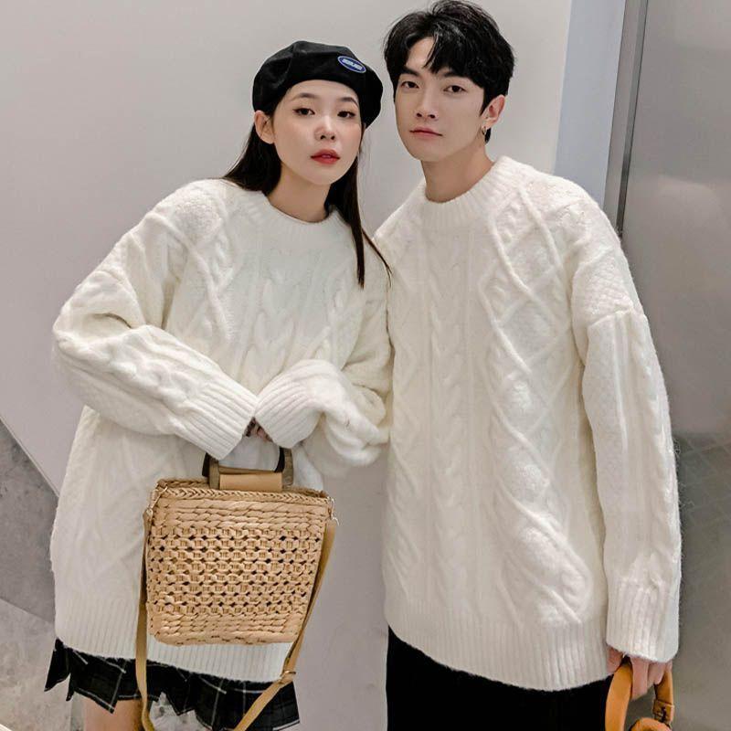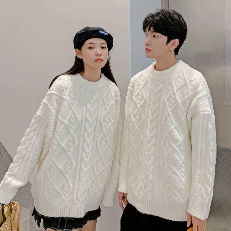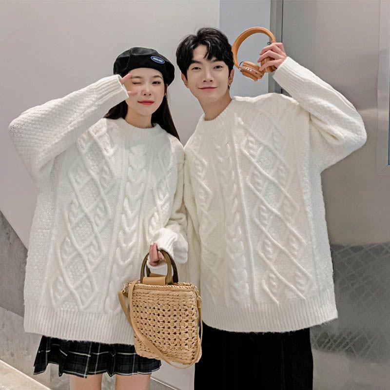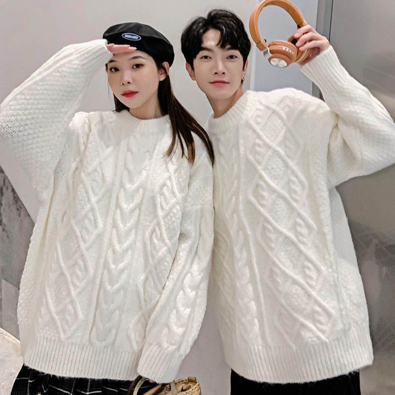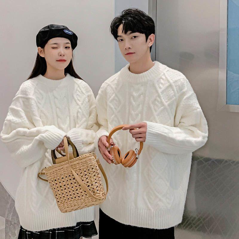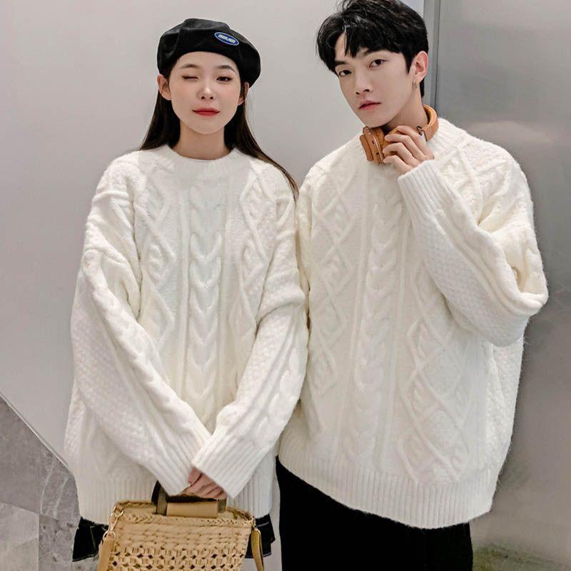 Suéter de cuello redondo de color sólido para mujer, blanco, grueso, estilo universitario súper popular, suéter torcido, ropa para parejas, hombres y mujeres