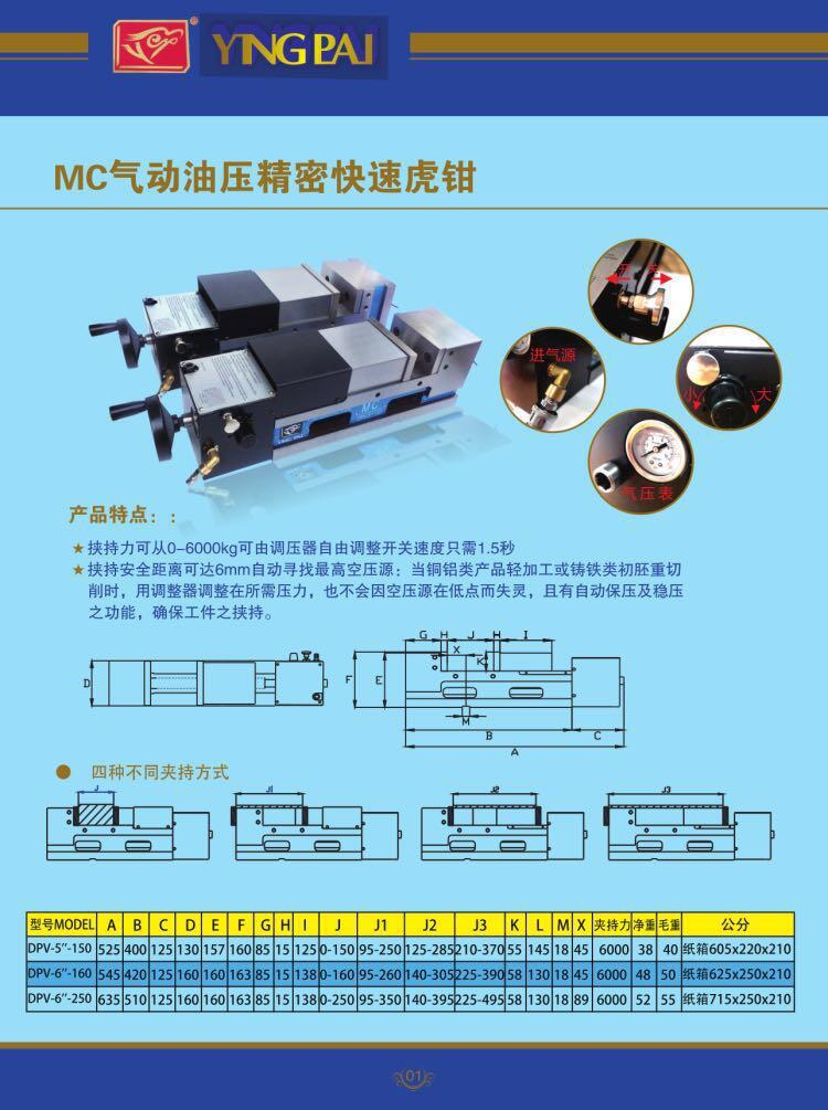 La fuente de baja presión de la fuente de presión de aire es de 8 kg/cm², que puede alcanzar una fuerza de sujeción ultrarrápida de 6000 kgf. La fuerza de sujeción se puede ajustar libremente de 0 a 6000 kgf mediante el regulador de presión. Encuentra automáticamente la fuente de presión de aire más alta: