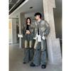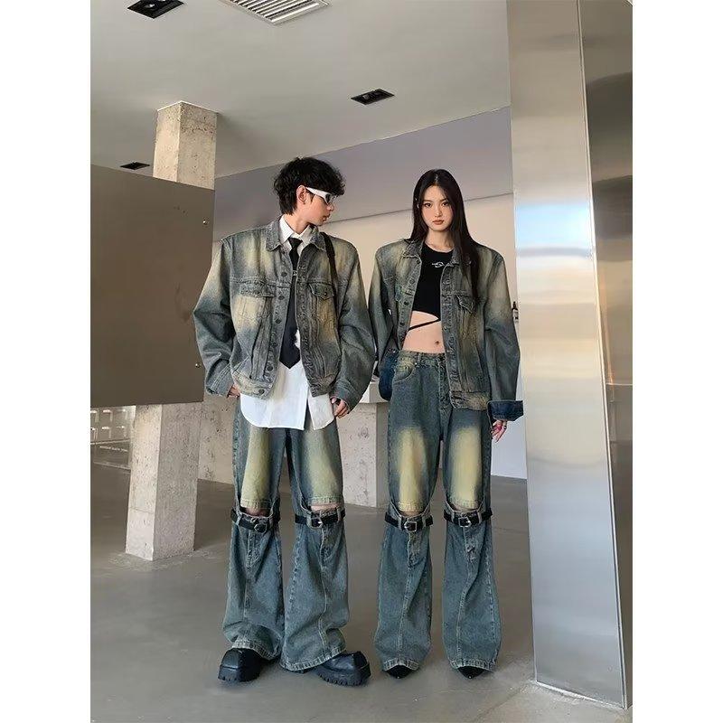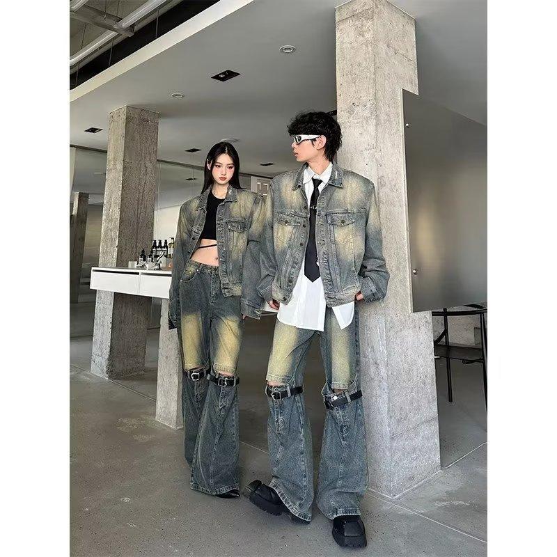 Traje de mezclilla lavado para hombre y mujer 2023 de nicho retro, chaqueta con hombreras holgadas, pantalones rectos, traje de dos piezas