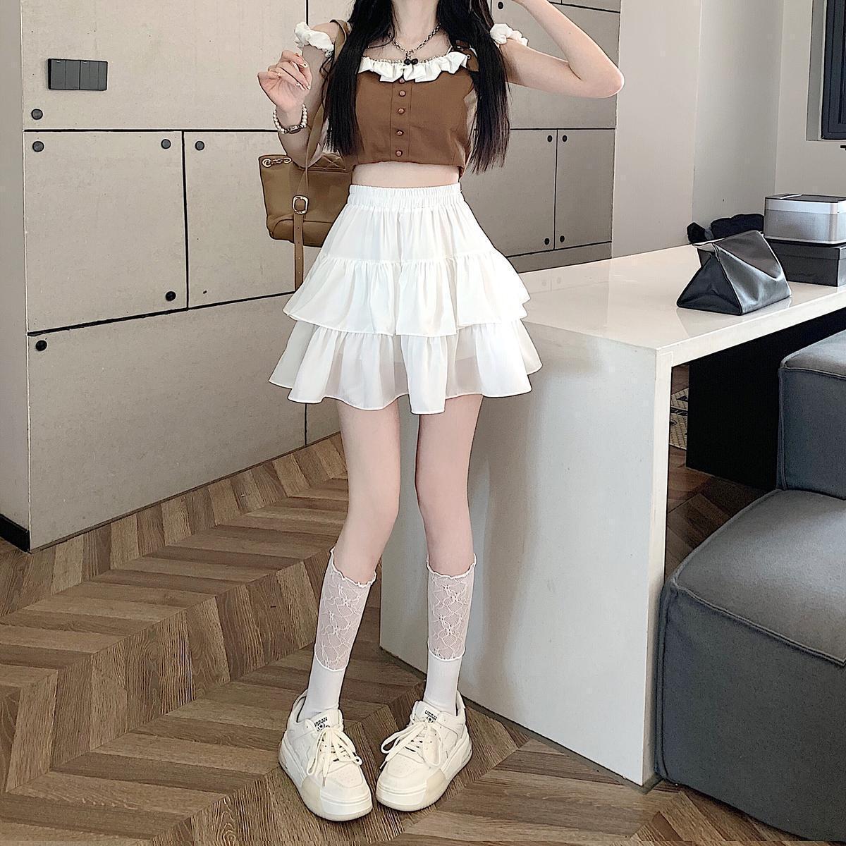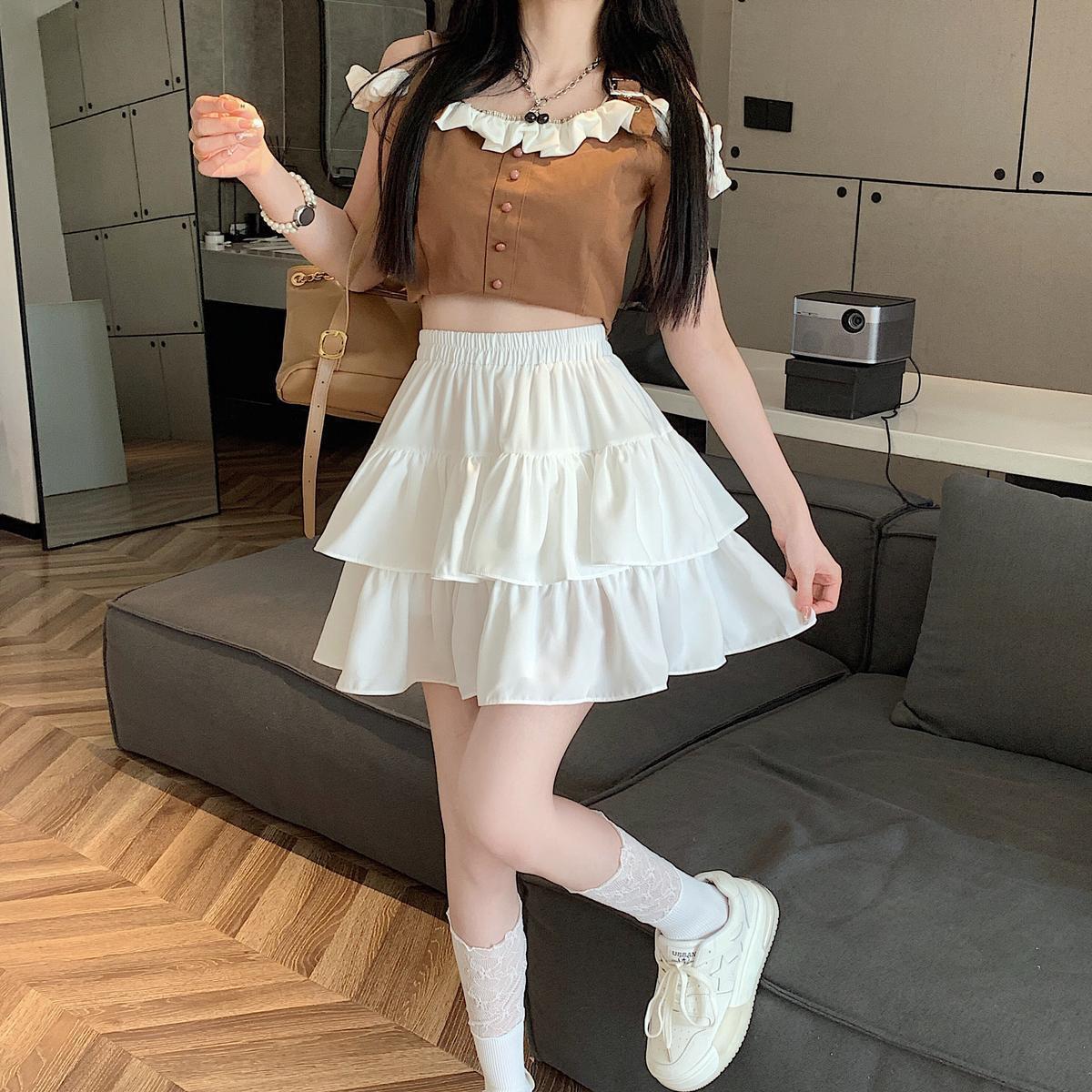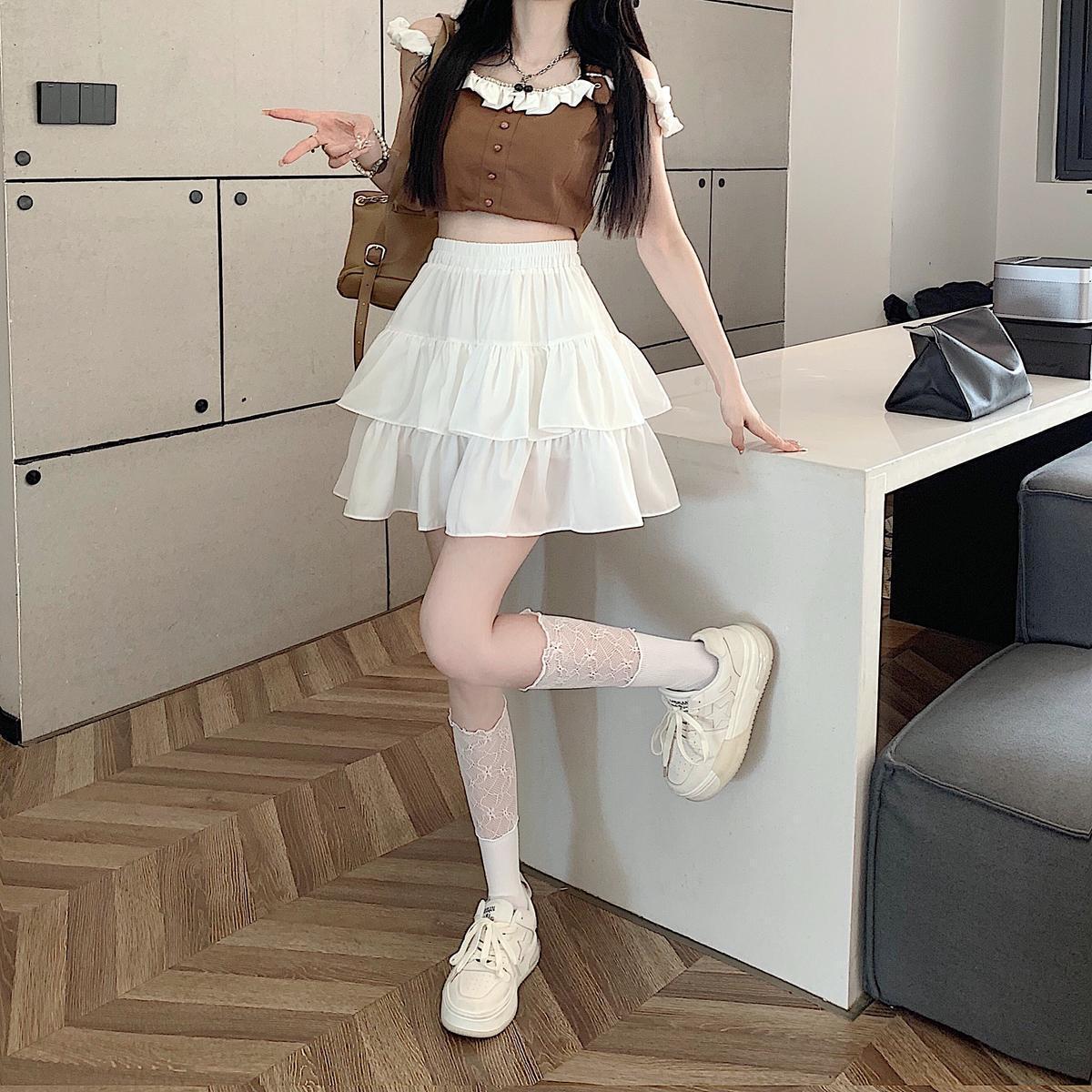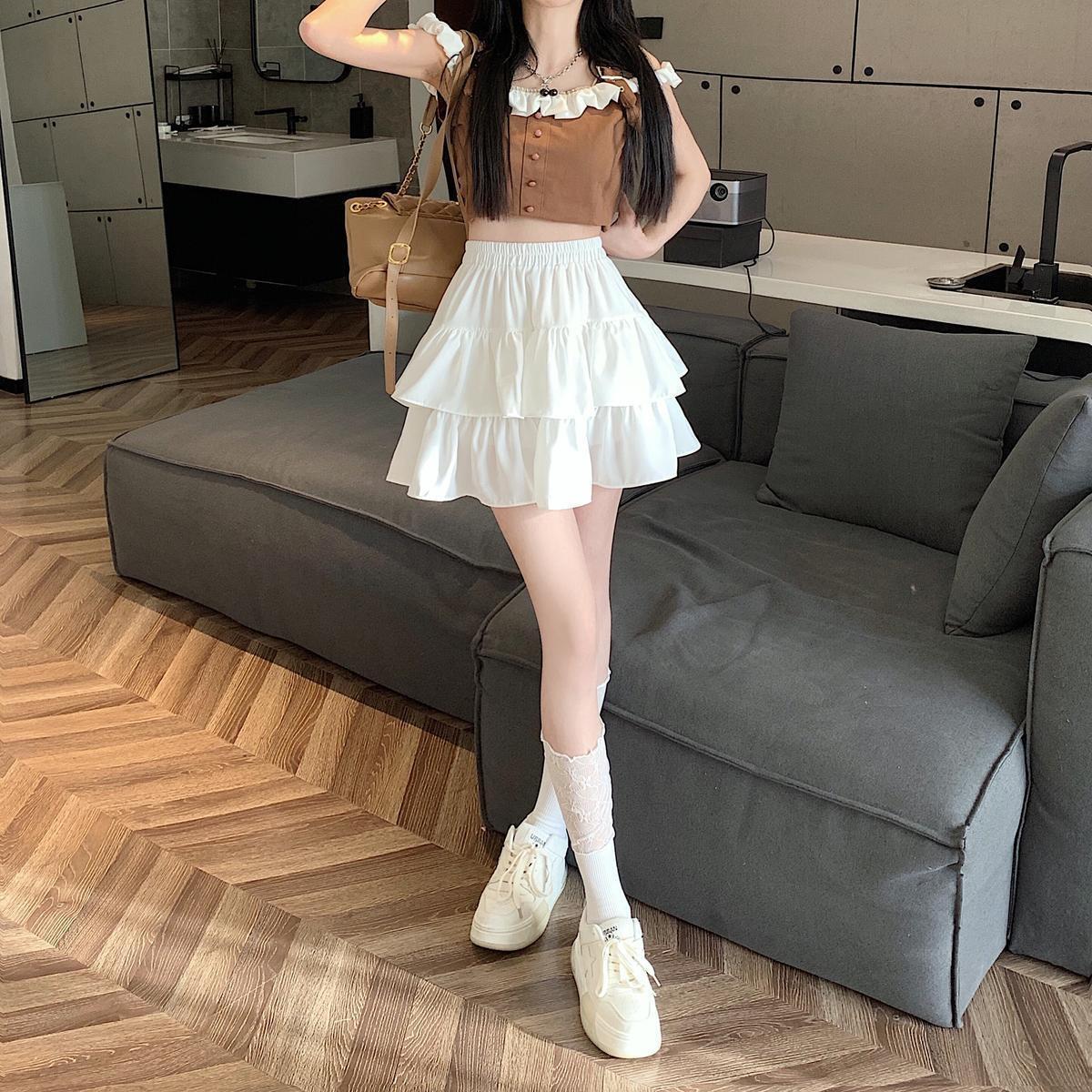 Falda de color sólido de verano nueva versátil con forma de pera, cintura alta, línea A, falda de pastel, falda corta pequeña y esponjosa