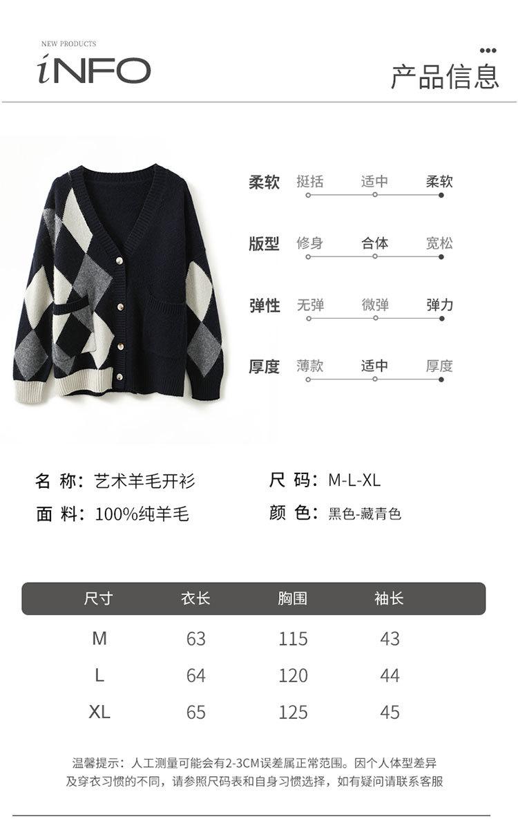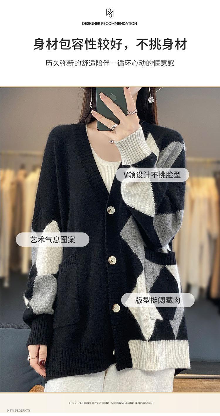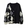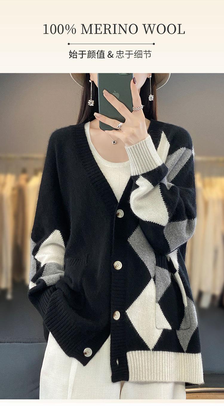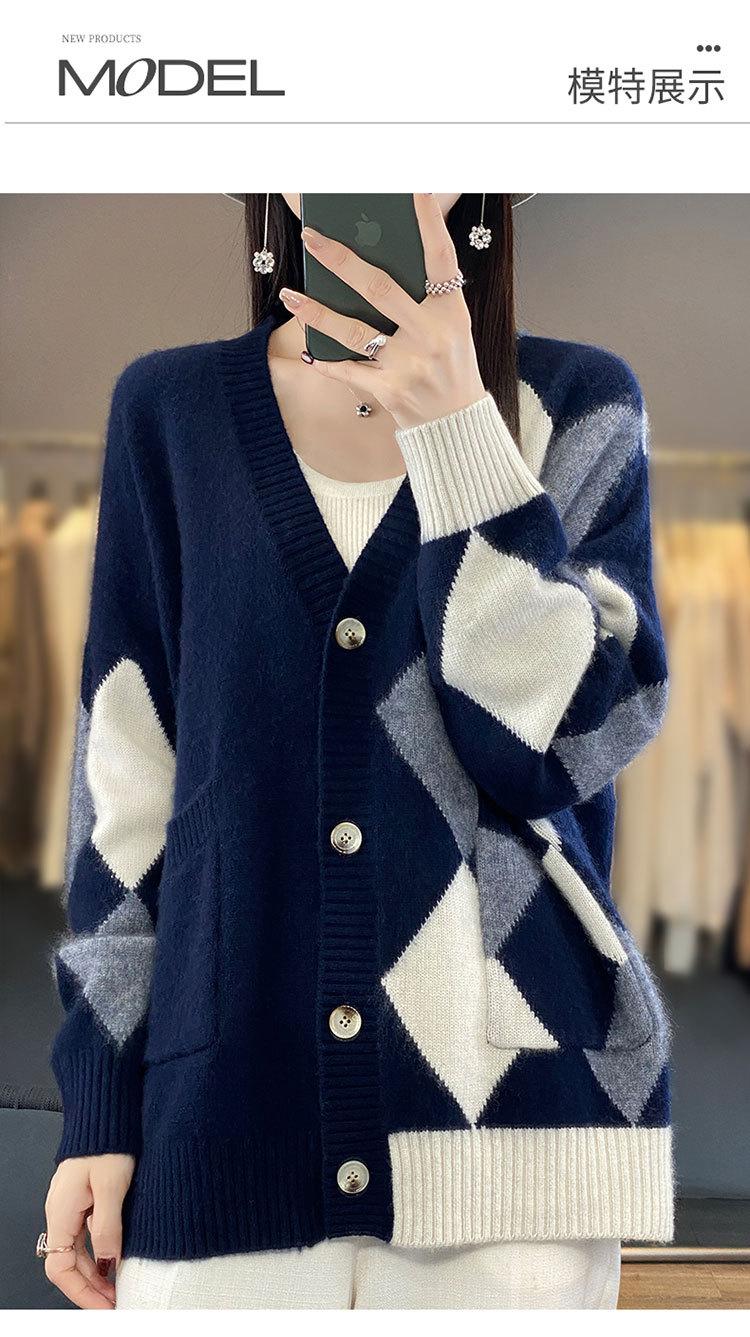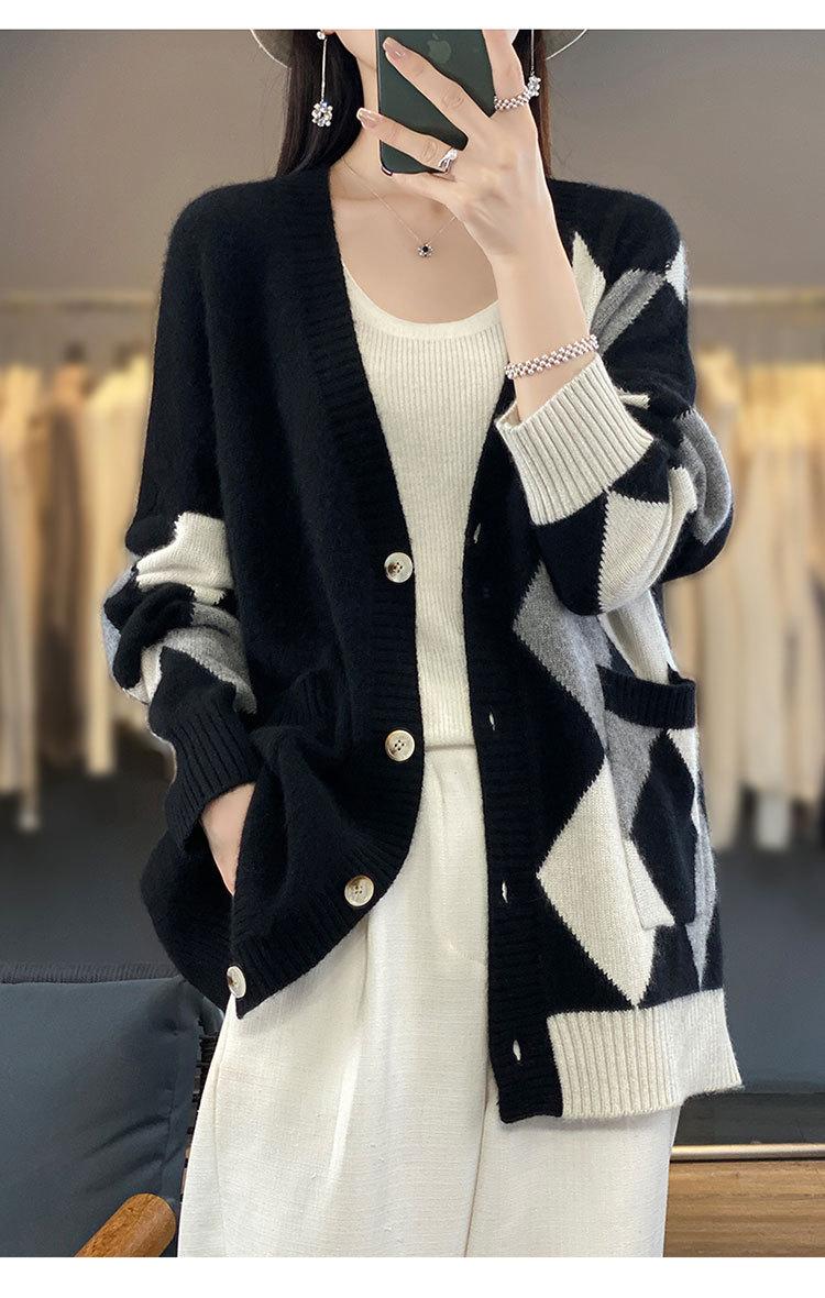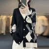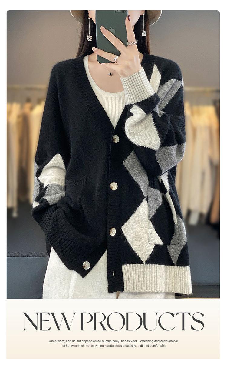 Otoño e invierno nuevo cárdigan de lana 100% pura con cuello en V para mujer, suéter a juego con colores de diamantes, abrigo grueso, suéter suelto, top