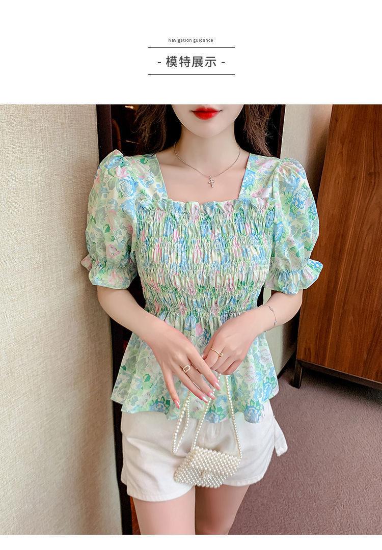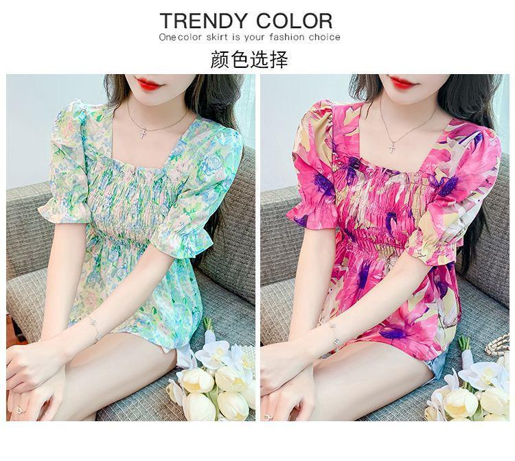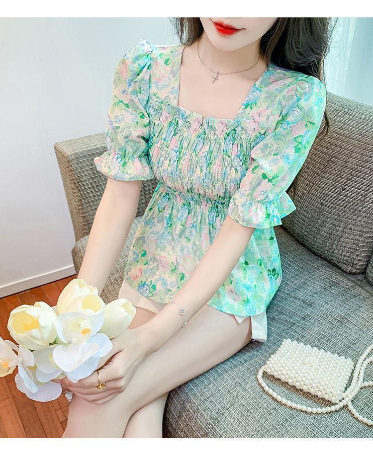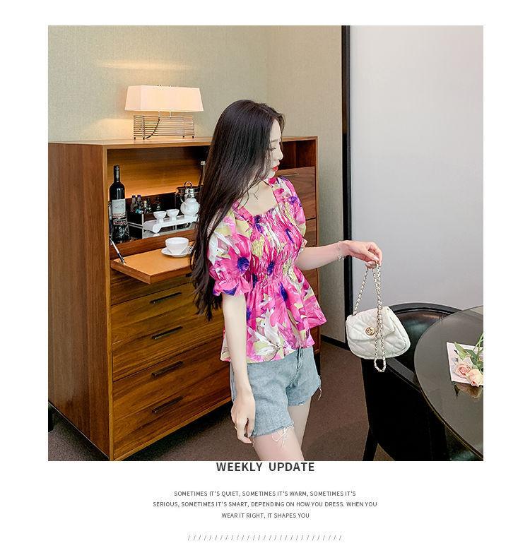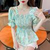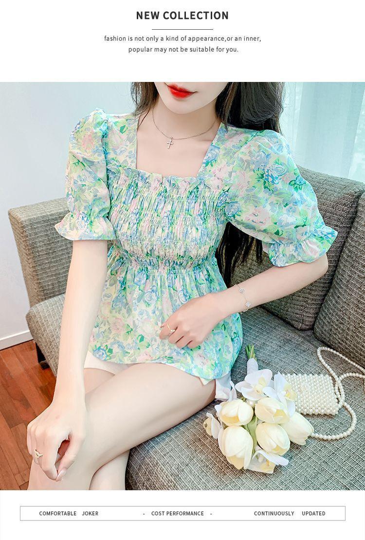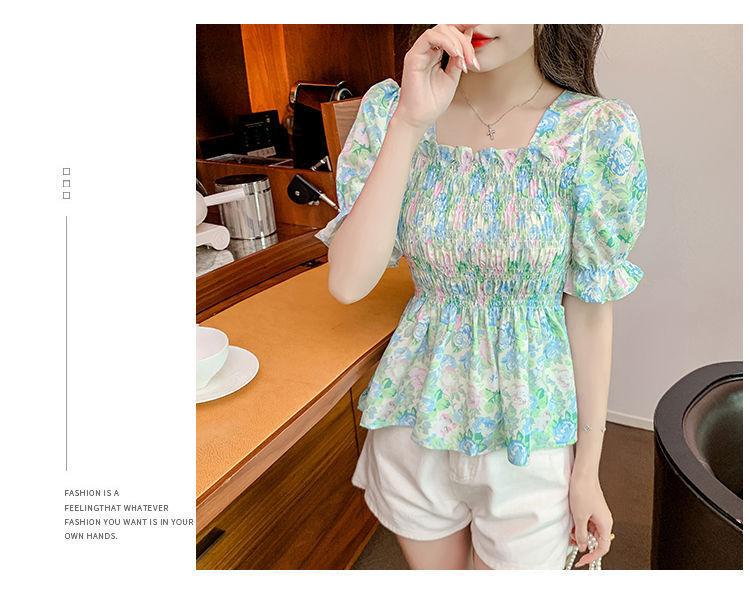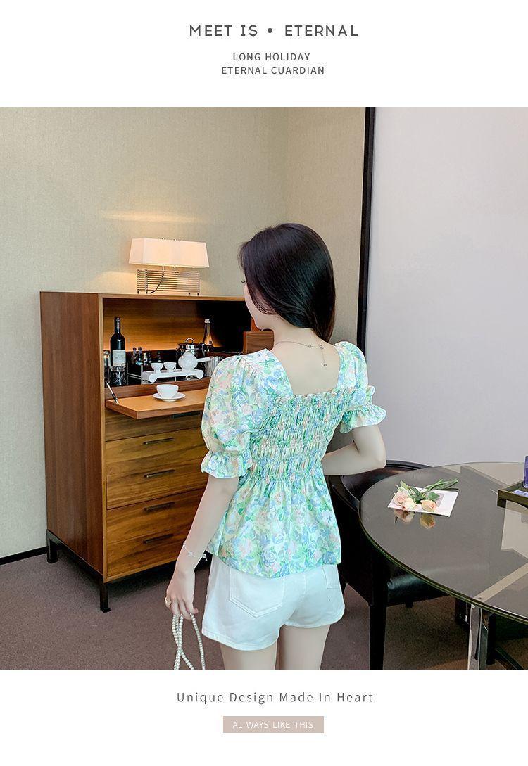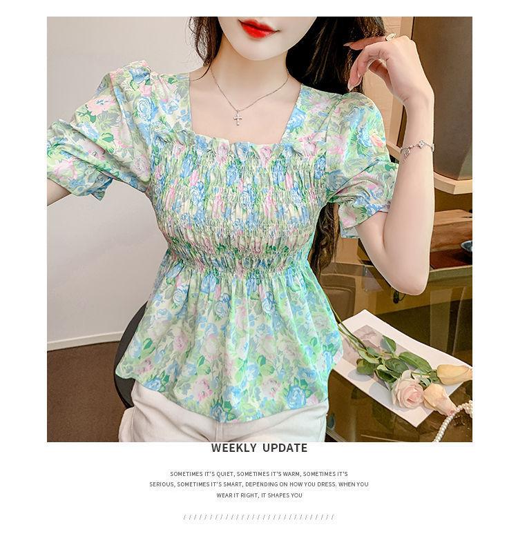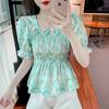 Camisa de manga corta con cuello cuadrado floral y mangas abullonadas para mujer, diseño de verano, estilo francés nicho, estilo muñeca dulce.