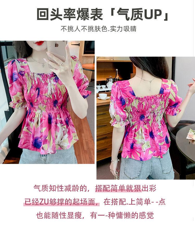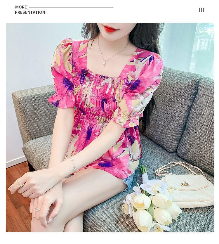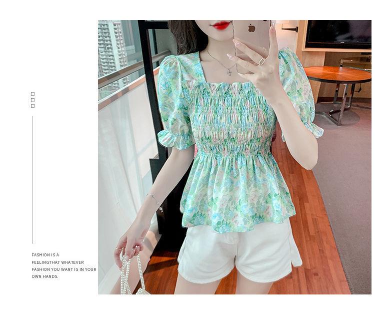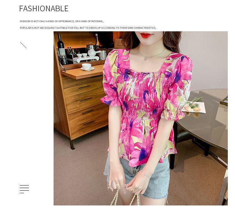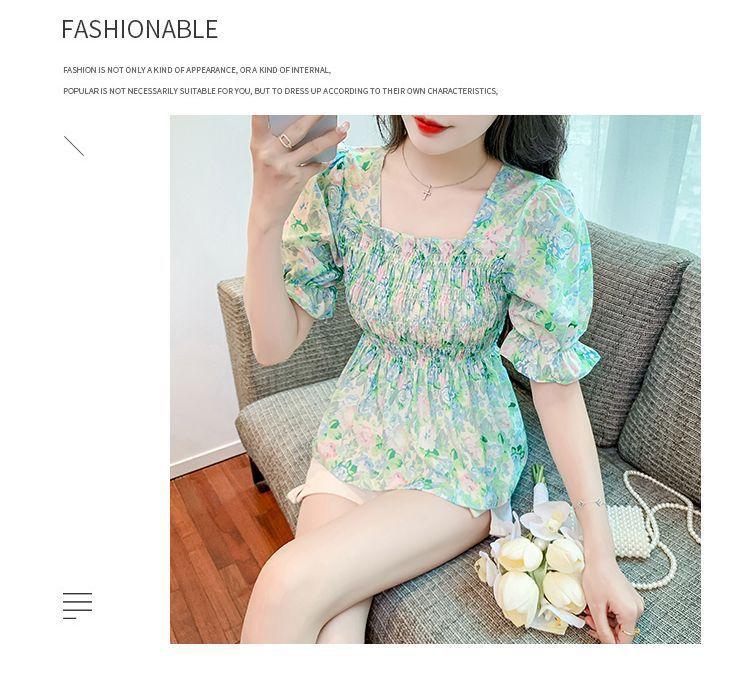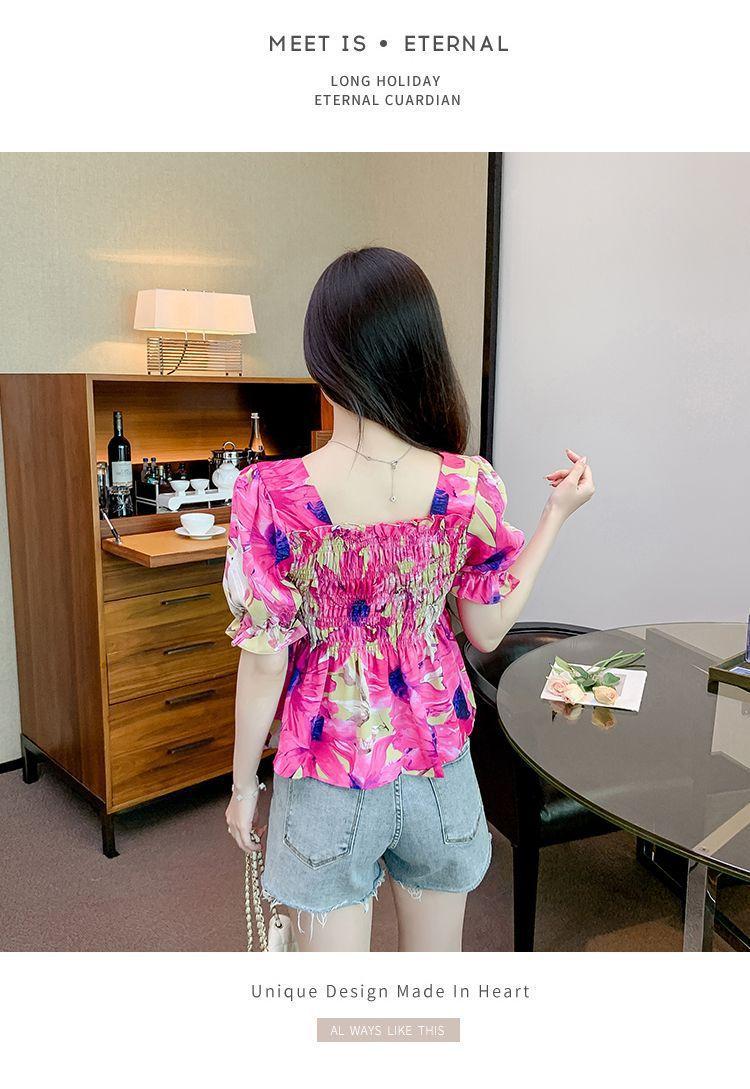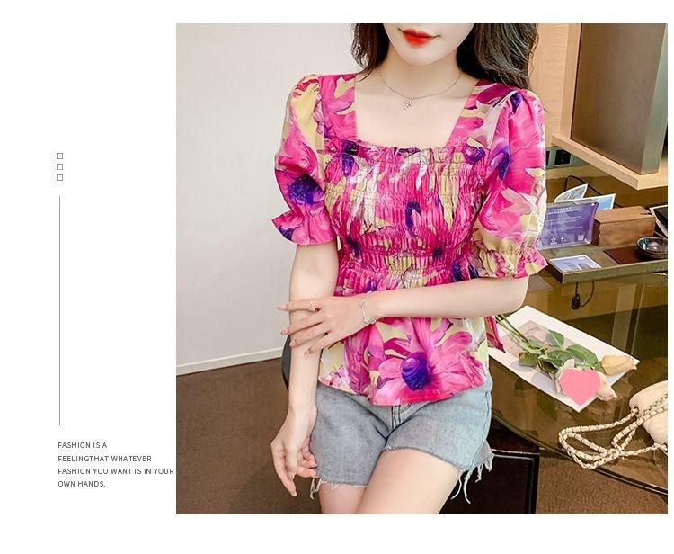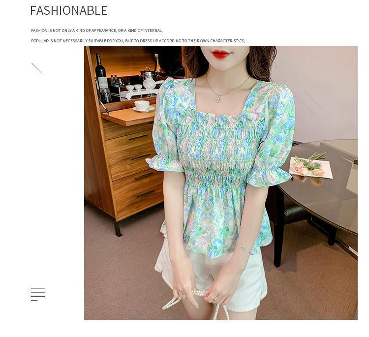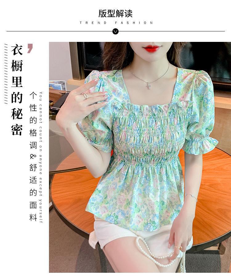 Camisa de manga corta con cuello cuadrado floral y mangas abullonadas para mujer, diseño de verano, estilo francés nicho, estilo muñeca dulce.