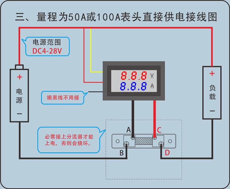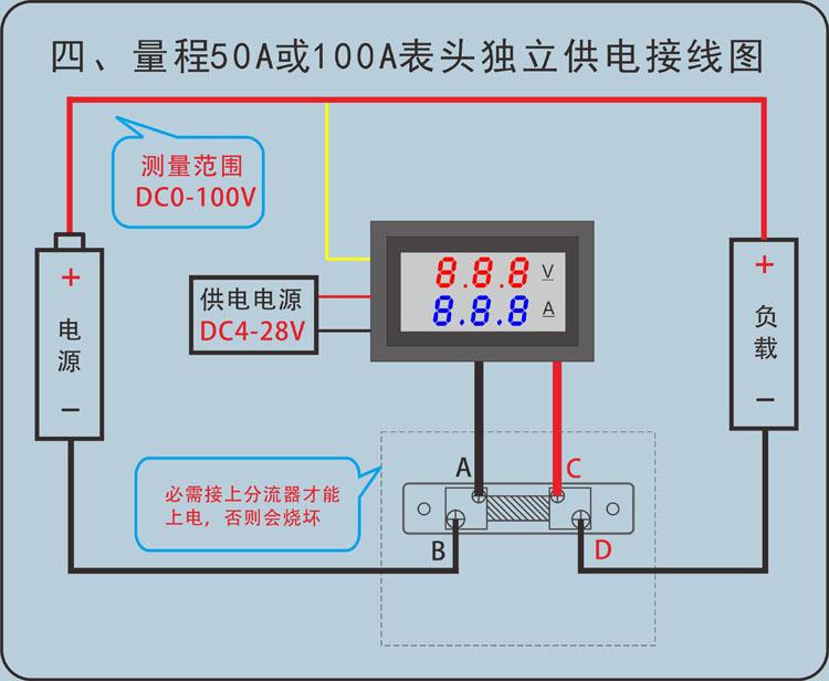 El voltaje de alimentación del medidor debe ser de 4--30V, exceder 30V requiere fuente de alimentación DUal. Por favor, cablee según el diagrama, ¡¡¡los cuatro puntos del shunt no se pueden cambiar arbitrariamente!!!