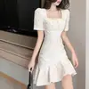 Venta al por mayor 2023 Verano Hada Francesa Cuello Cuadrado Cintura Adelgazante Vestido de Volantes Sirena Cadera Falda Corta Trendy
