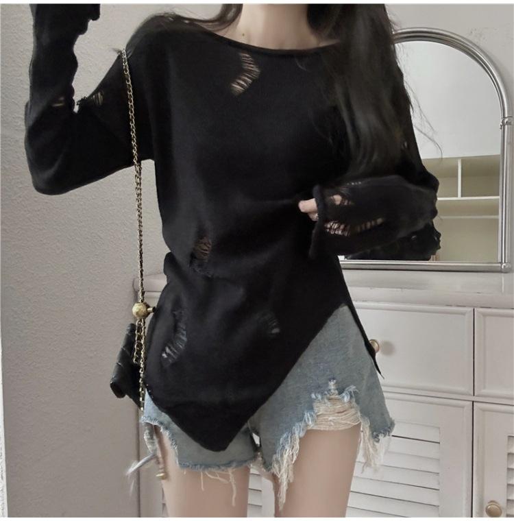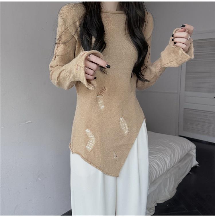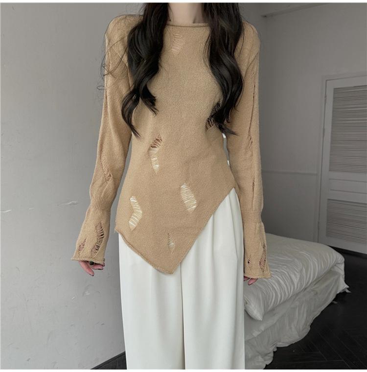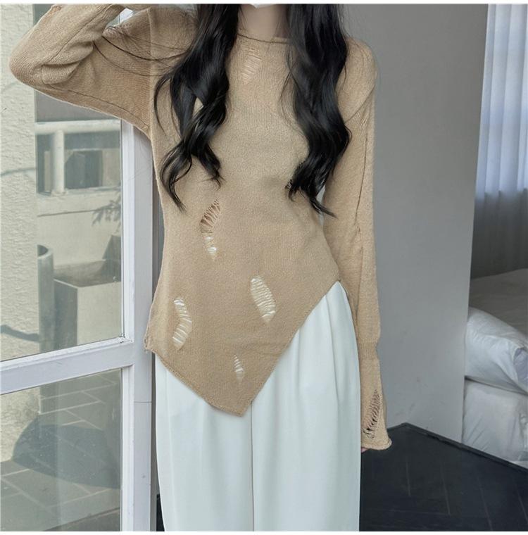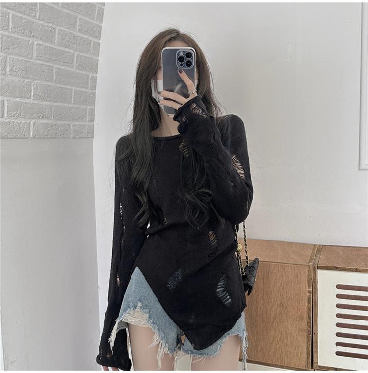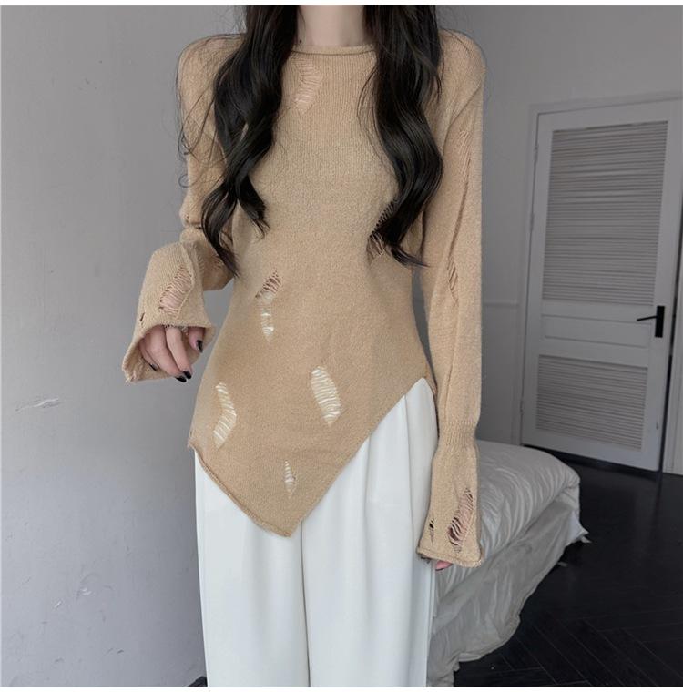 Suéter hueco irregular para mujer, blusa de protección solar de tul de otoño, blusa elegante holgada de longitud media con abertura