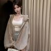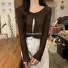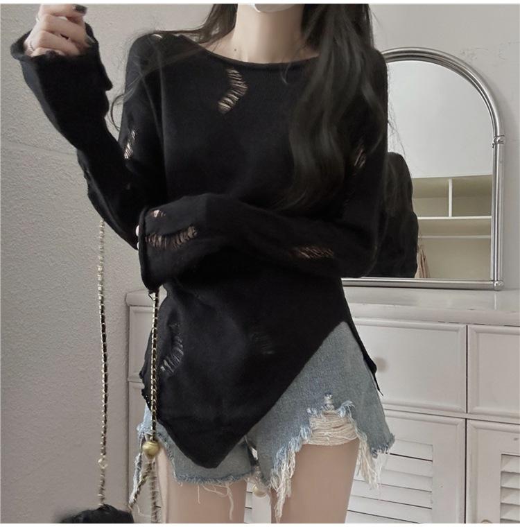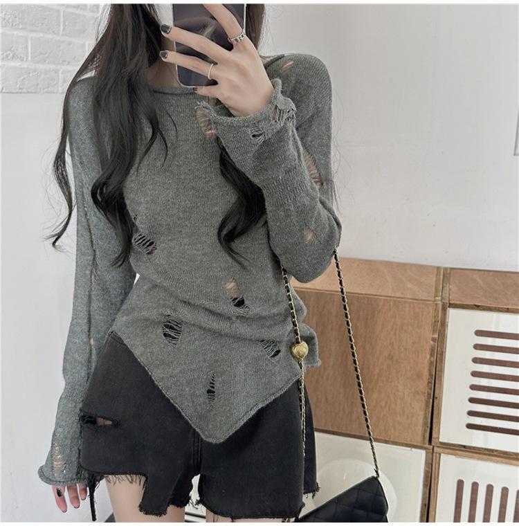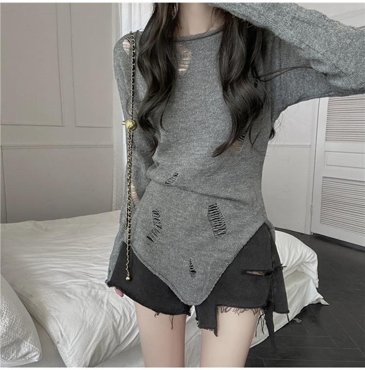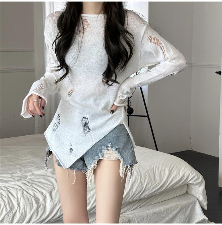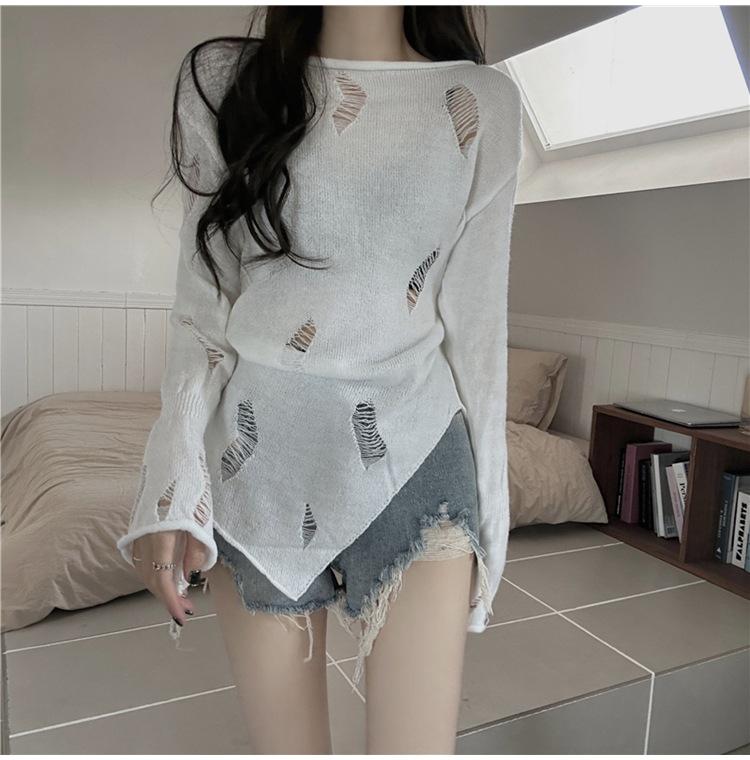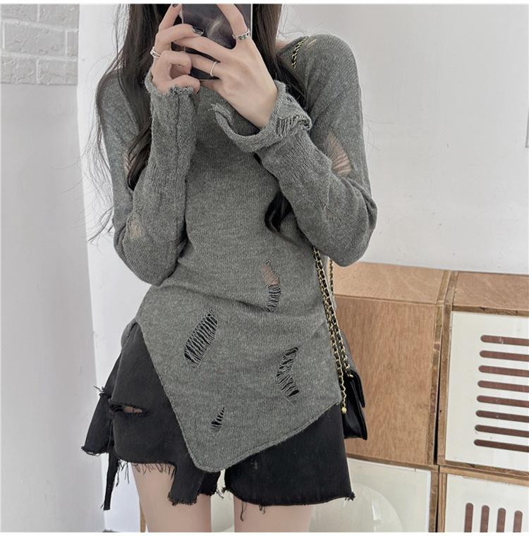 Suéter hueco irregular para mujer, blusa de protección solar de tul de otoño, blusa elegante holgada de longitud media con abertura