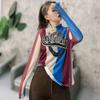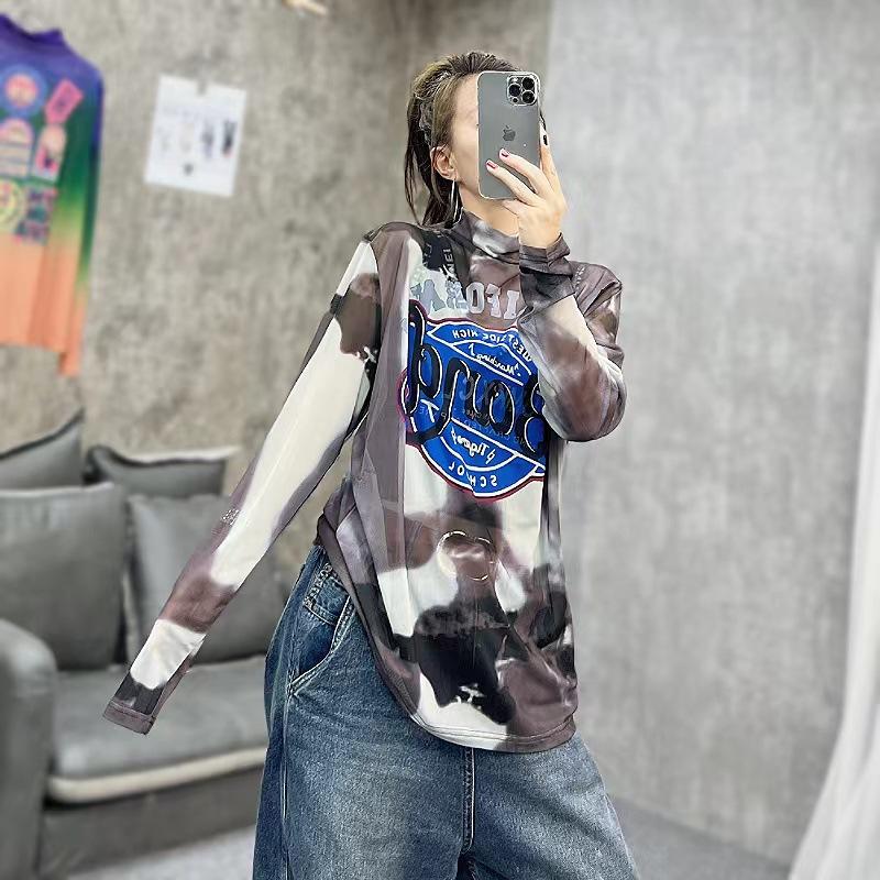 Camiseta Base de Cuello Alto de Malla Estilo Explosivo Europeo Vintage Street Estampado de Letras Manga Larga Top Camiseta de Cuello Alto