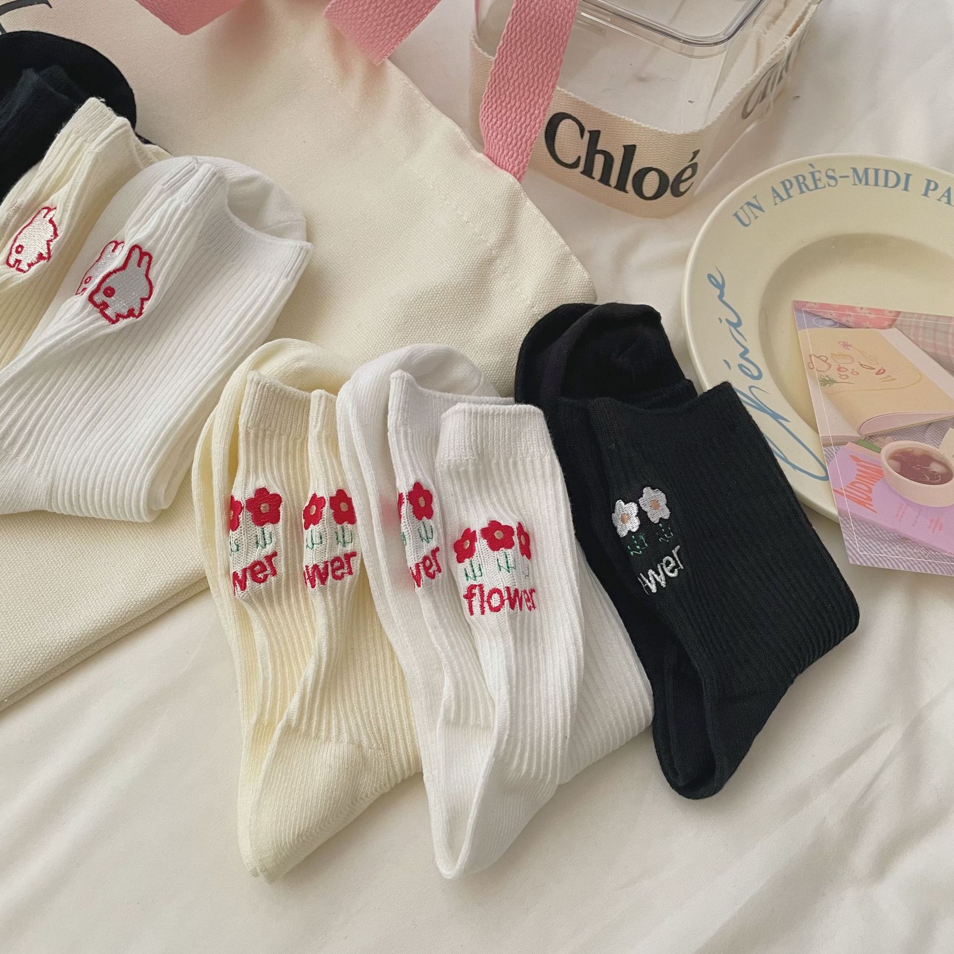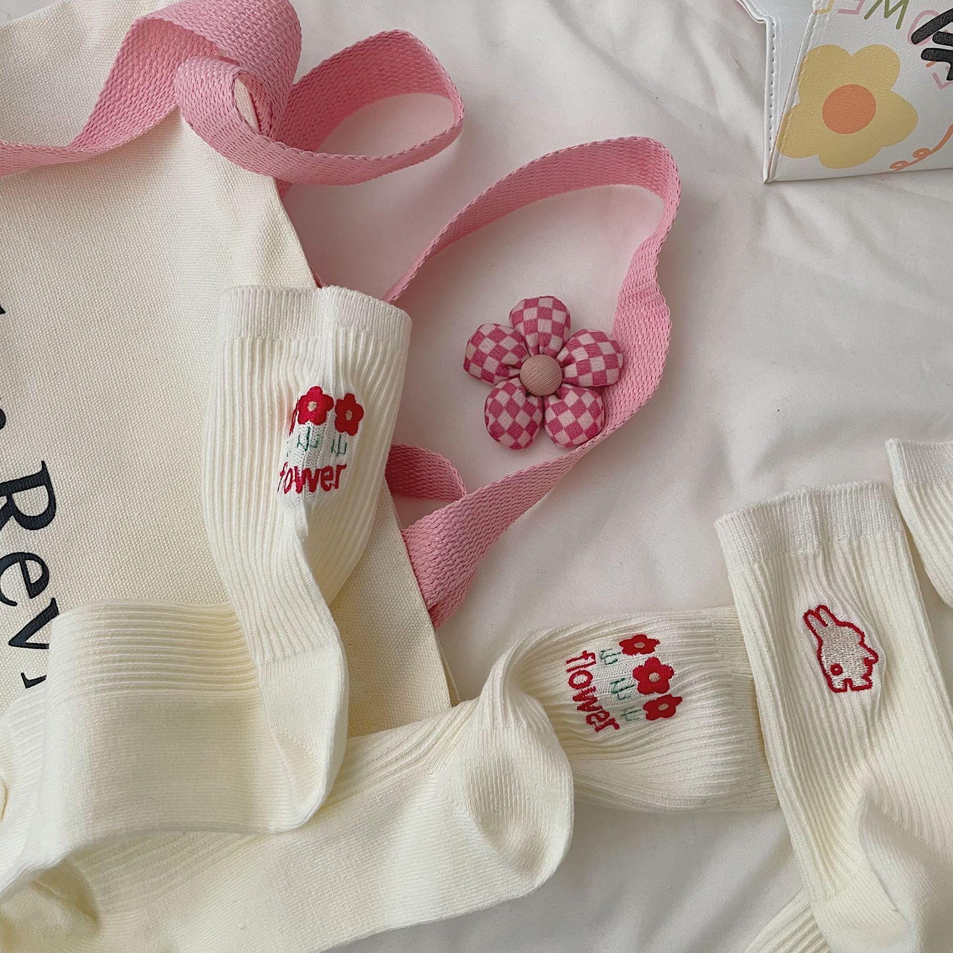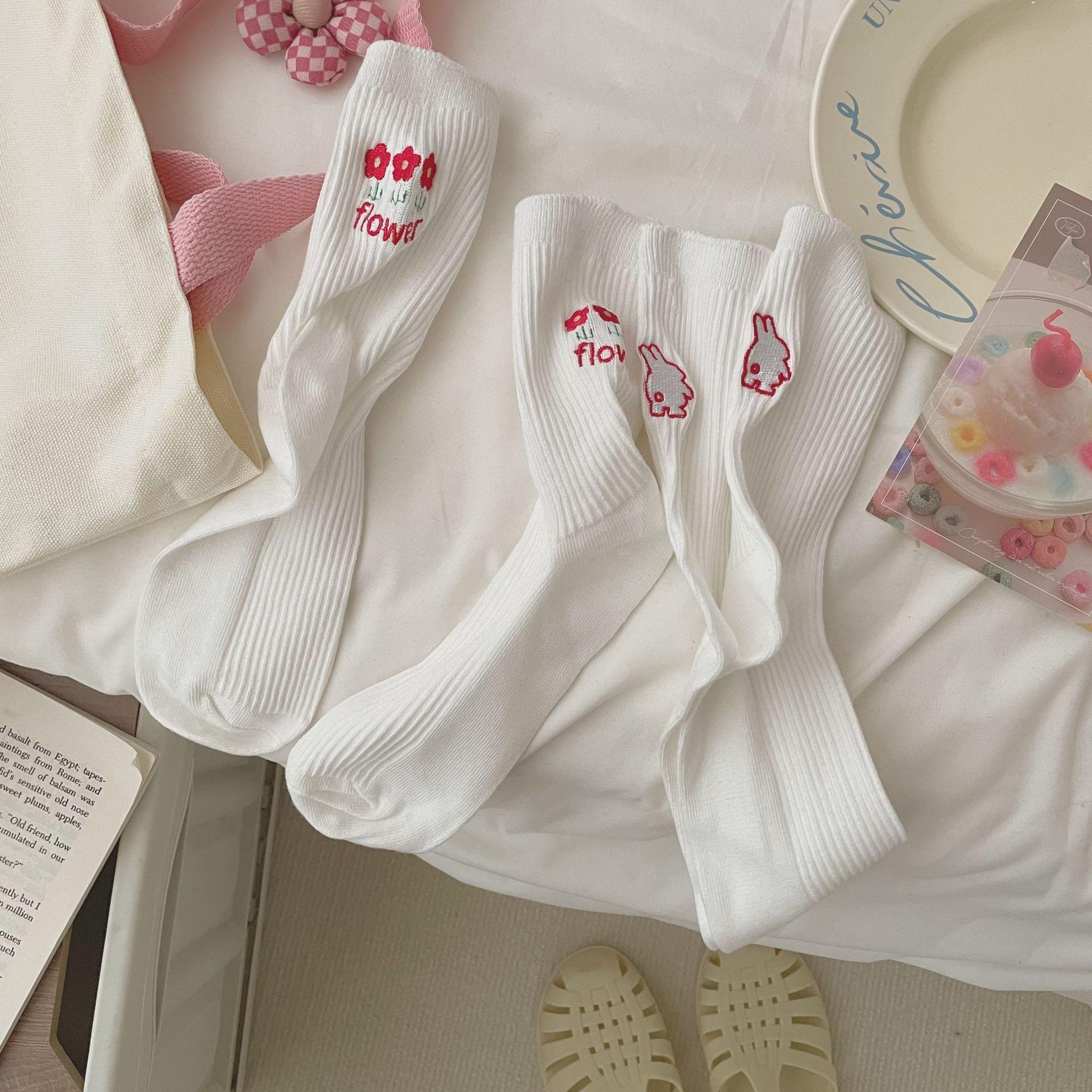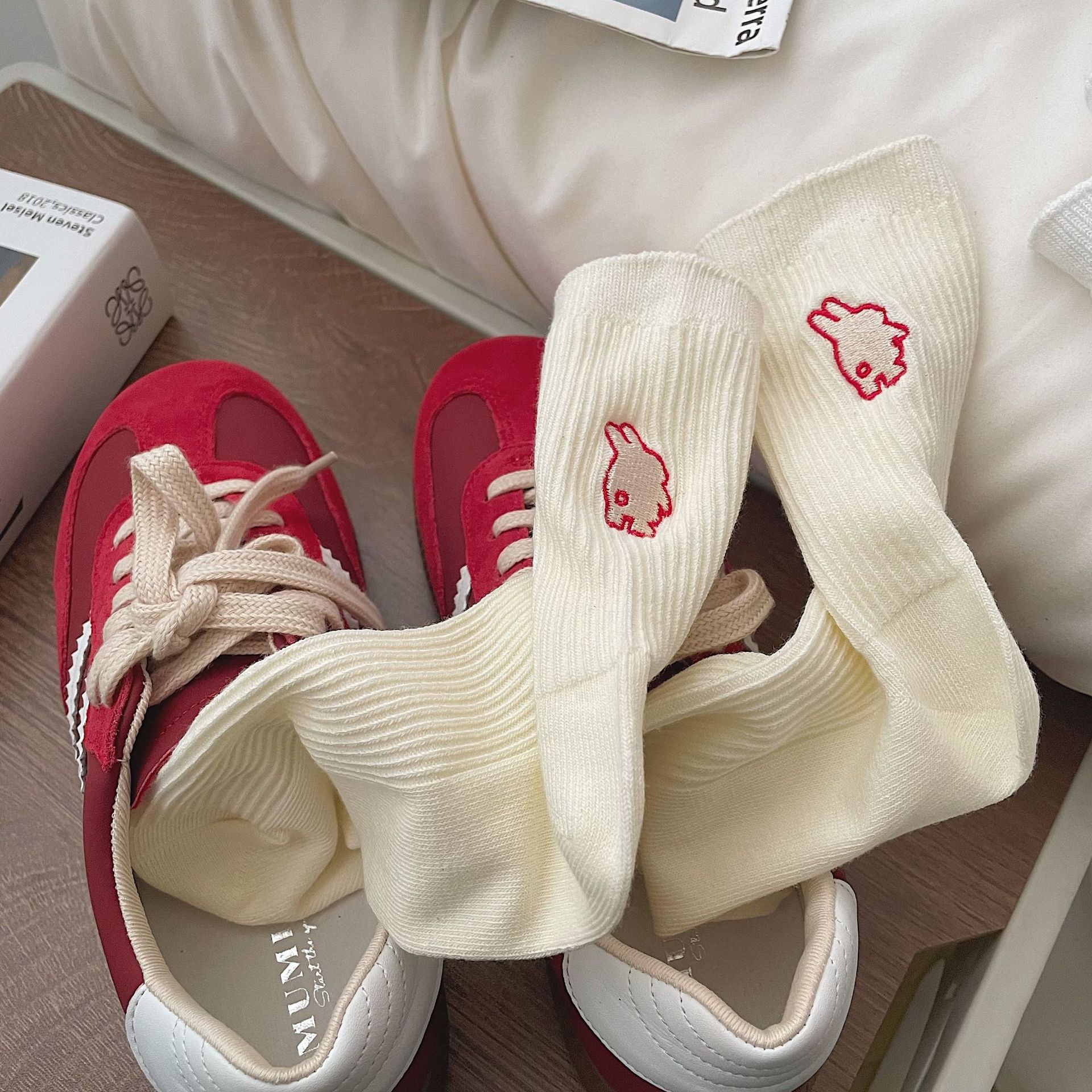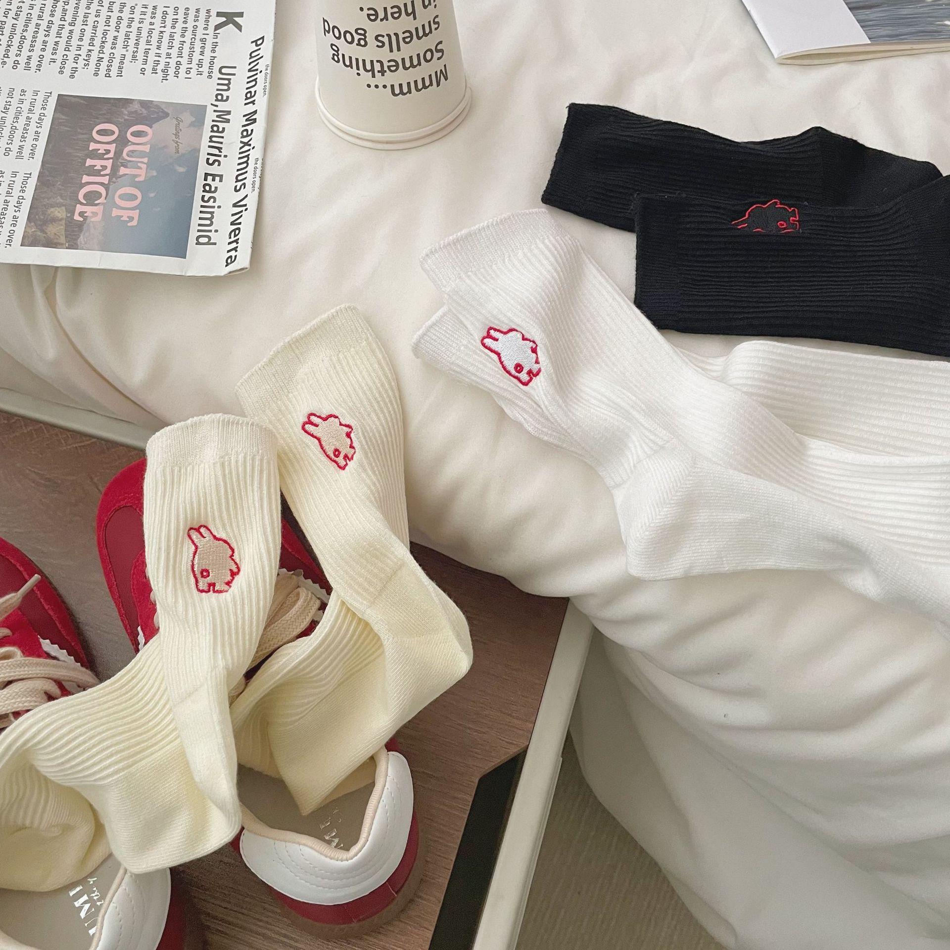 Calcetines con bordado de conejo en el talón para mujer, calcetines de algodón de moda para primavera y otoño, calcetines deportivos japoneses de verano para exteriores, calcetines de tubo medio.