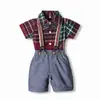 Traje de Caballero Bebé de Verano Europeo y Americano Transfronterizo, Pantalones Cortos con Tirantes, Manga Corta a Cuadros, Monopieza, Pajarita, Set de Cuatro Piezas